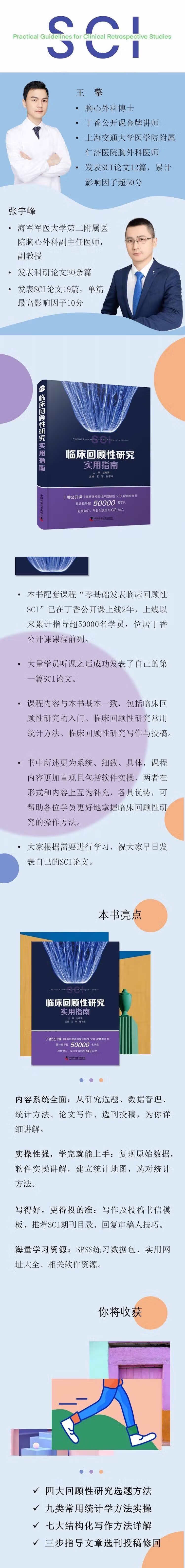 笔者团队主要完成篇的内容,包括临床回顾性研究的导论、选题、架构和数据收集等比较基础性的内容。卫生统计学专业的郭轶斌博士及其团队,主要完成第二篇的内容,详细讲解了临床回顾性研究常用统计学方法和SPSS的实现。临床科研的专家王春晖博士及其团队,主要完成第三篇的内容,包括SCI论文撰写和投稿的内容。通过这三篇内容的学习,相信各位读者能够掌握临床回顾性研究的基本技能,也能够完成自己的回顾性研究。