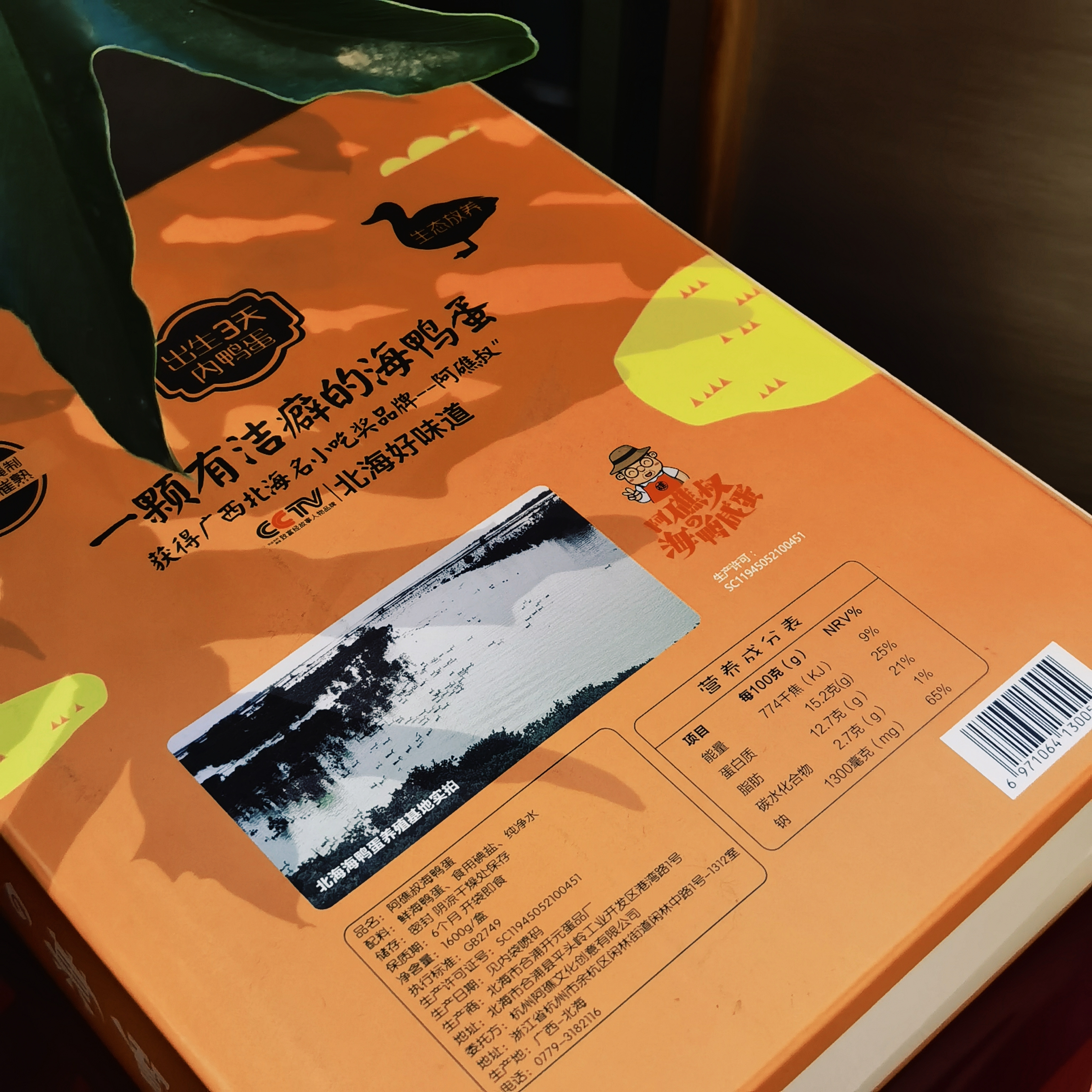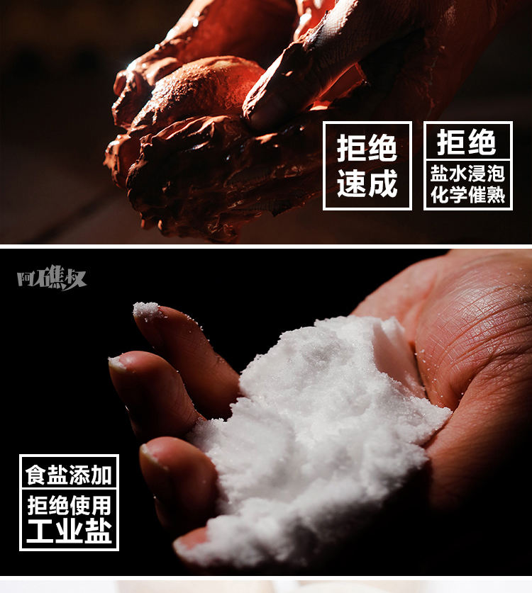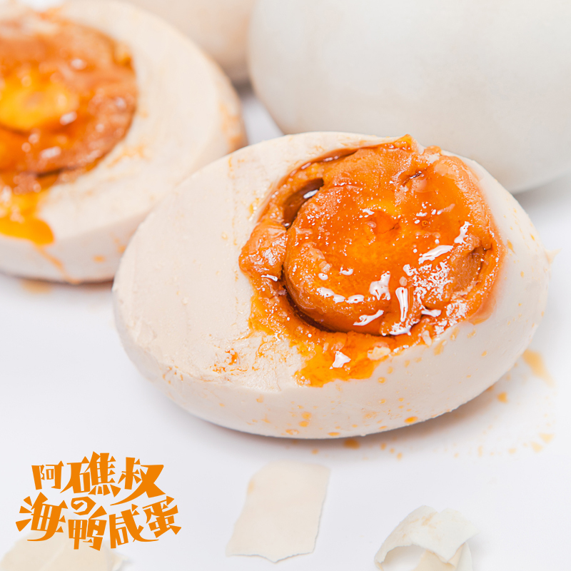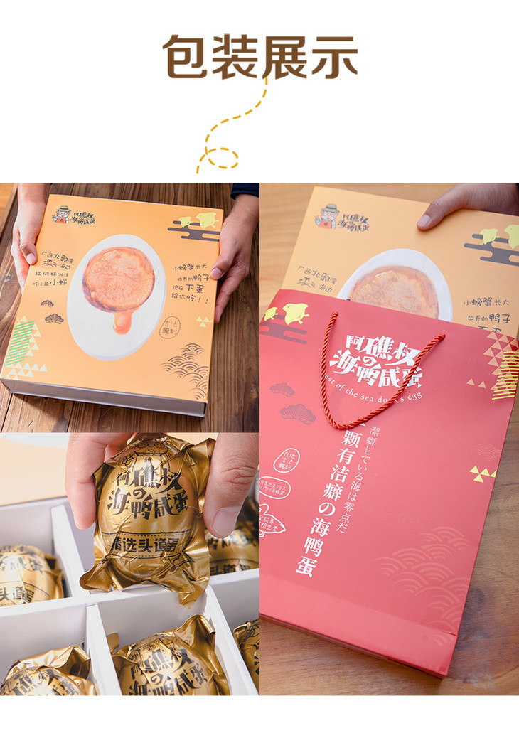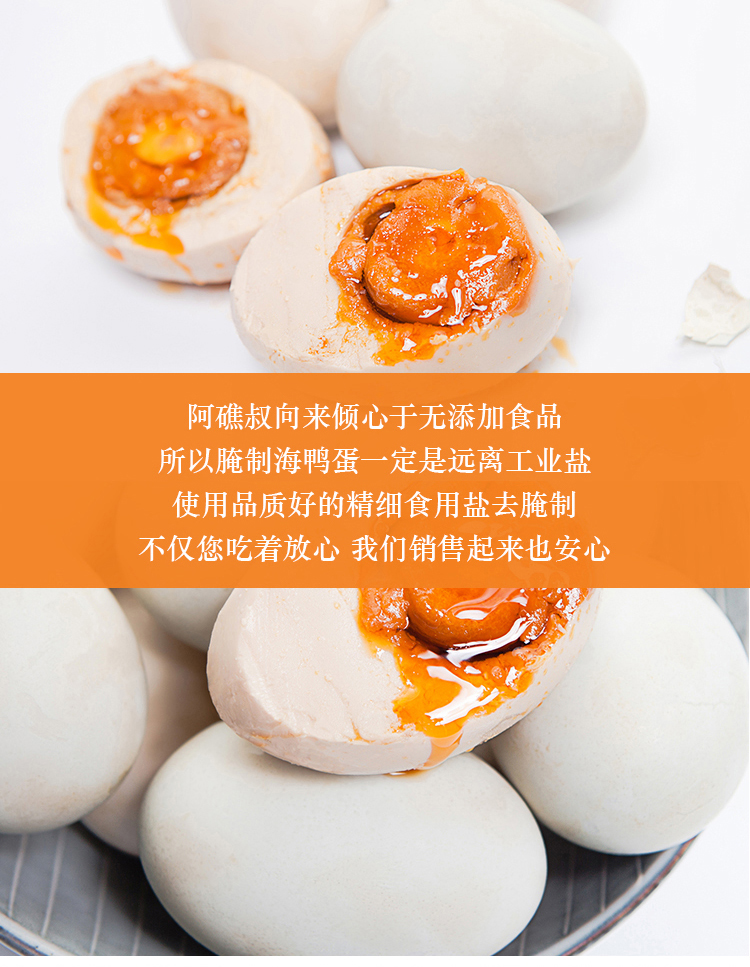 阿礁叔的海鸭蛋选用的原料是在广西远离工业城市的北海红树林边散养着与海浪为伴虾米小鱼为食的海鸭下的蛋,坚持只用出生7天内,用红泥+海盐等调制的独家腌制配方腌足30天后,再经过130度高温烘烤5个小时,才能制成一枚用筷子挑开就会流油的北海鸭蛋。而头道海鸭蛋又比普通的海鸭蛋更大一些,大概一颗在80g左右,咸淡适中,咸香适口,符合大众的口味不说,营养也会更丰富。