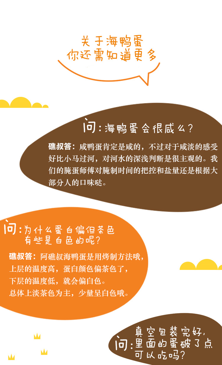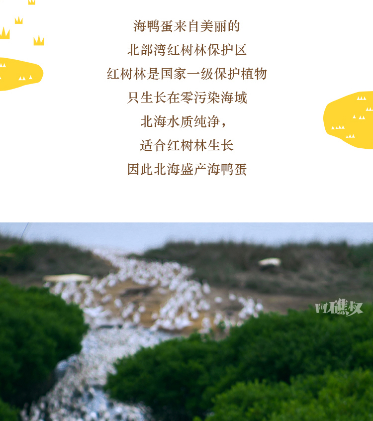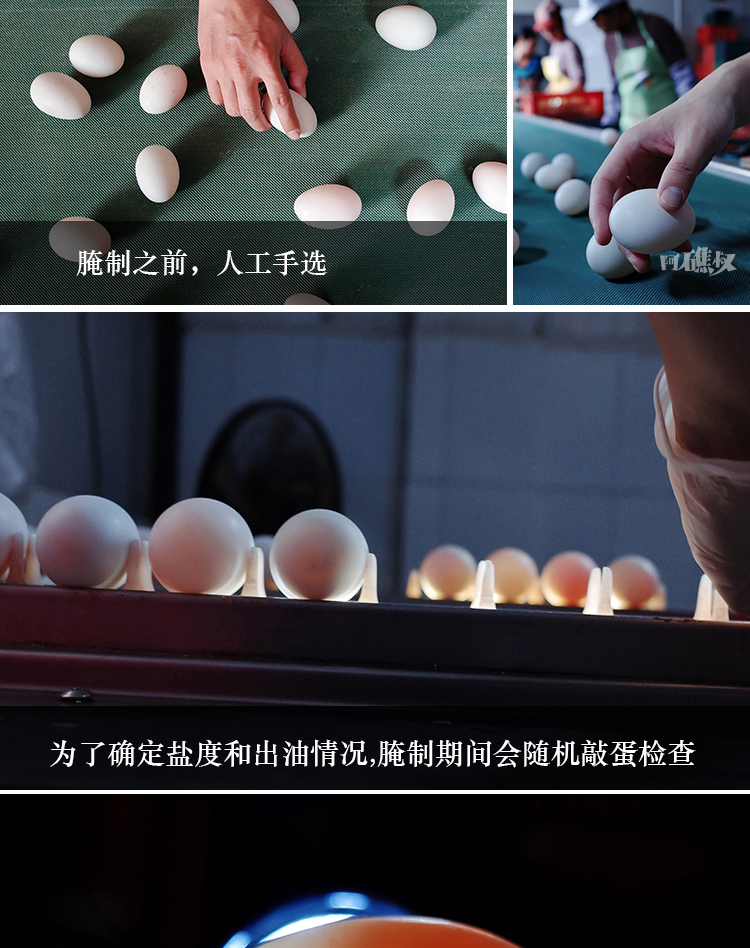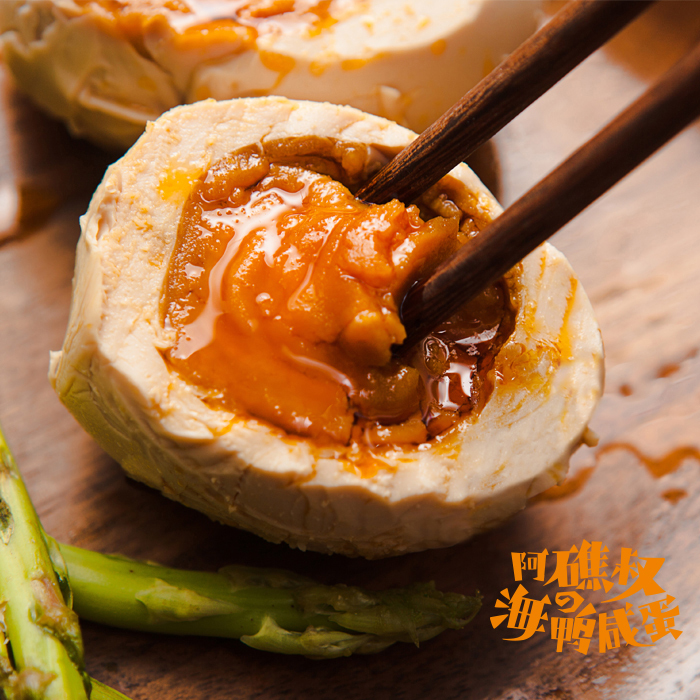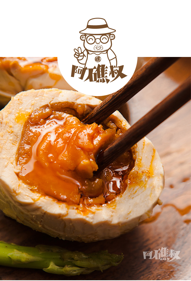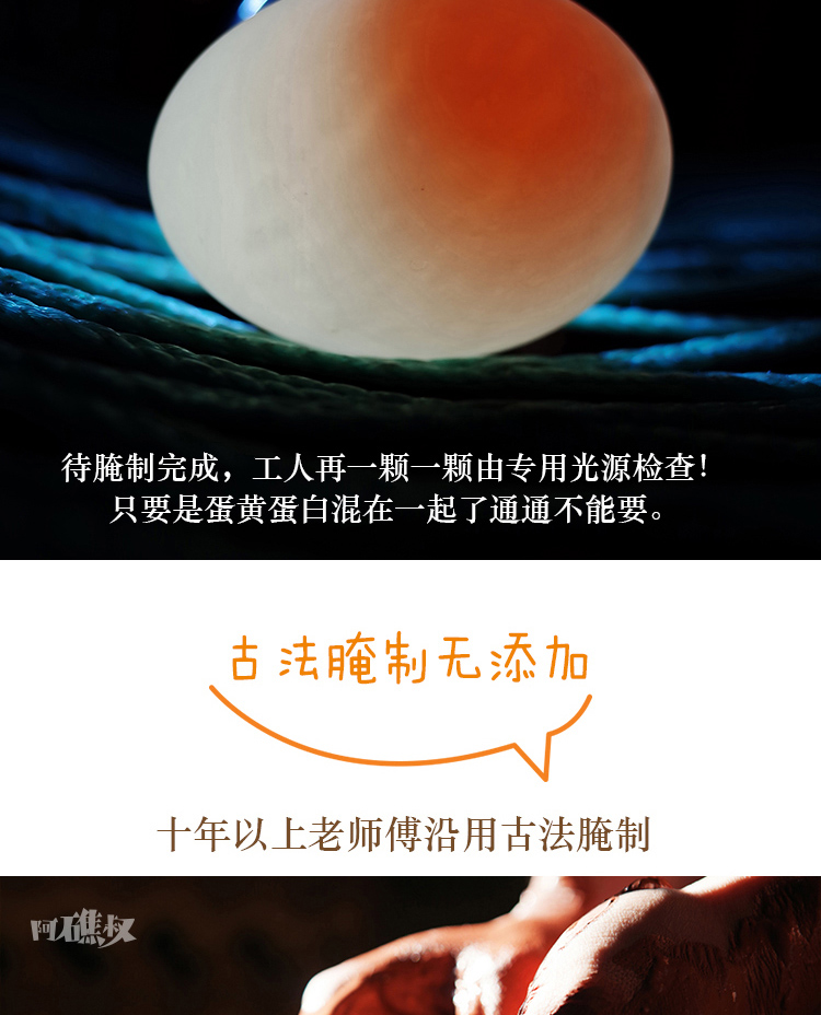 阿礁叔的海鸭蛋选用的原料是在广西远离工业城市的北海红树林边散养着与海浪为伴虾米小鱼为食的海鸭下的蛋,坚持只用出生7天内,用红泥+海盐等调制的独家腌制配方腌足30天后,再经过130度高温烘烤5个小时,才能制成一枚用筷子挑开就会流油的北海鸭蛋。而头道海鸭蛋又比普通的海鸭蛋更大一些,大概一颗在80g左右,咸淡适中,咸香适口,符合大众的口味不说,营养也会更丰富。