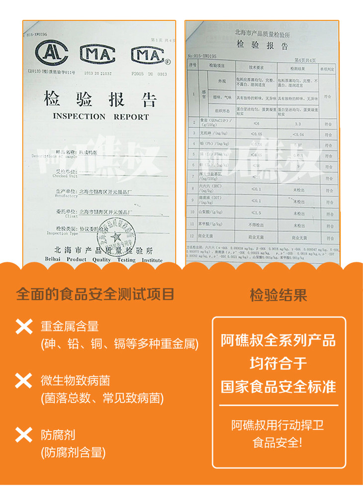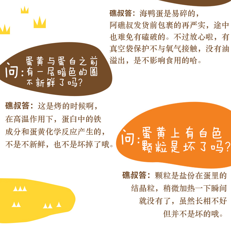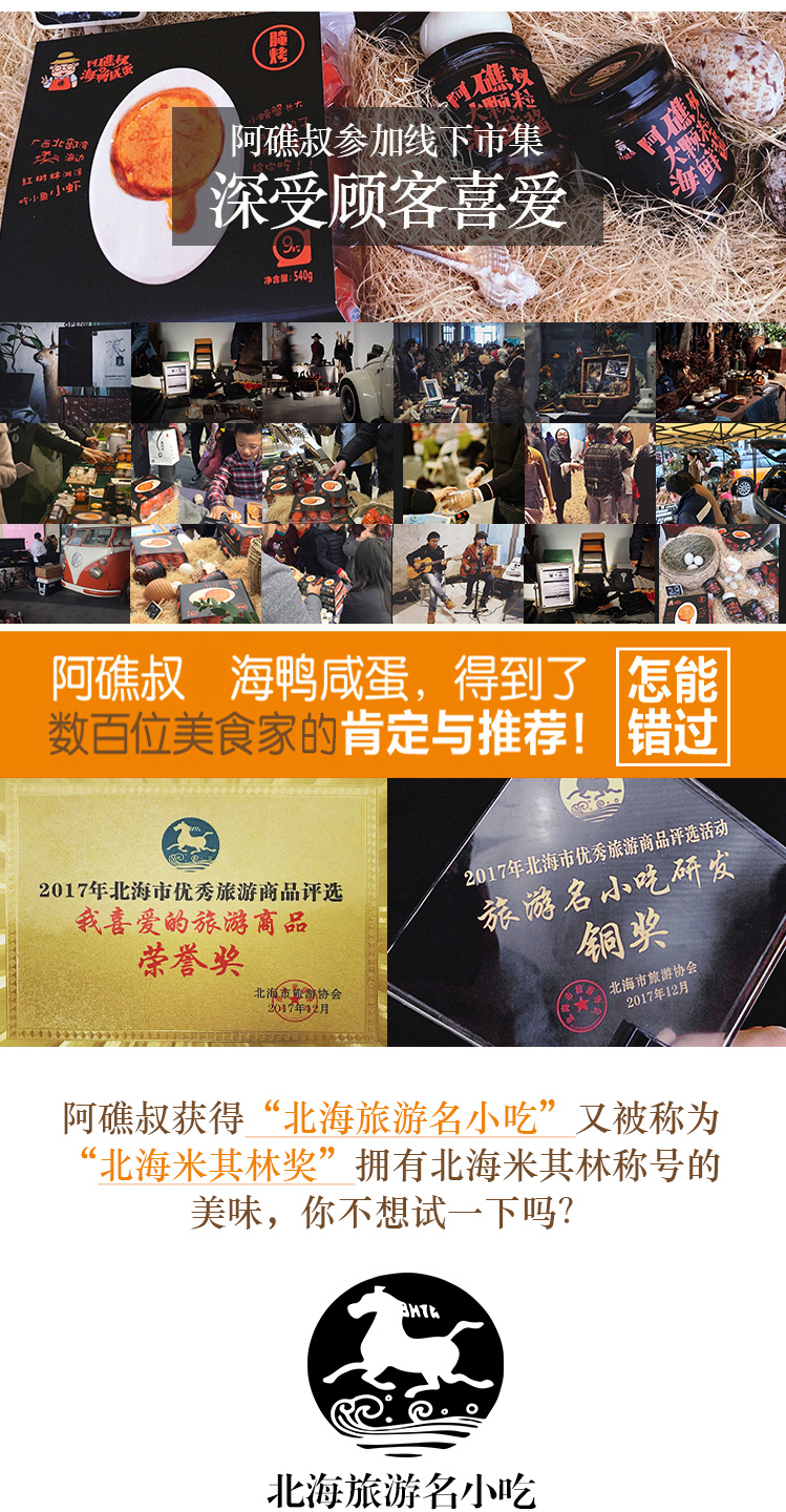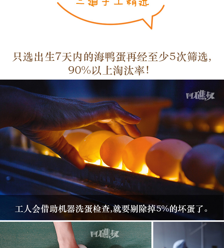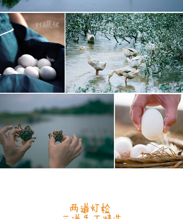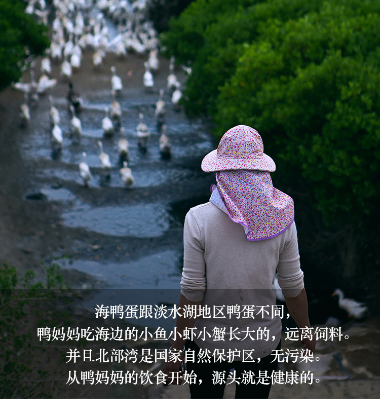 阿礁叔的海鸭蛋选用的原料是在广西远离工业城市的北海红树林边散养着与海浪为伴虾米小鱼为食的海鸭下的蛋,坚持只用出生7天内,用红泥+海盐等调制的独家腌制配方腌足30天后,再经过130度高温烘烤5个小时,才能制成一枚用筷子挑开就会流油的北海鸭蛋。而头道海鸭蛋又比普通的海鸭蛋更大一些,大概一颗在80g左右,咸淡适中,咸香适口,符合大众的口味不说,营养也会更丰富。