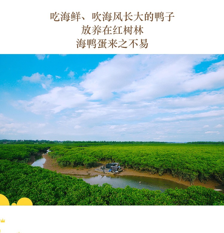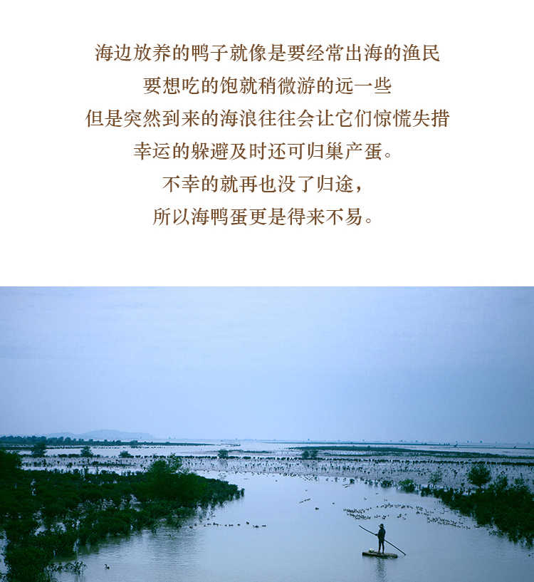 不同于普通的淡水鸭蛋,海鸭蛋是由生活在海边的鸭子靠捕食天然的小鱼、小蟹产下的蛋。由于所食皆为高蛋白和原生态,加上海鸭每天都要赶海,运动量极大,所以它们大都体型修长、身材矫健,产出的鸭蛋也尤为营养美味,1颗海鸭蛋的营养价值是普通淡水鸭蛋的3倍不止,胆固醇却仅为普通鸭蛋的一半。