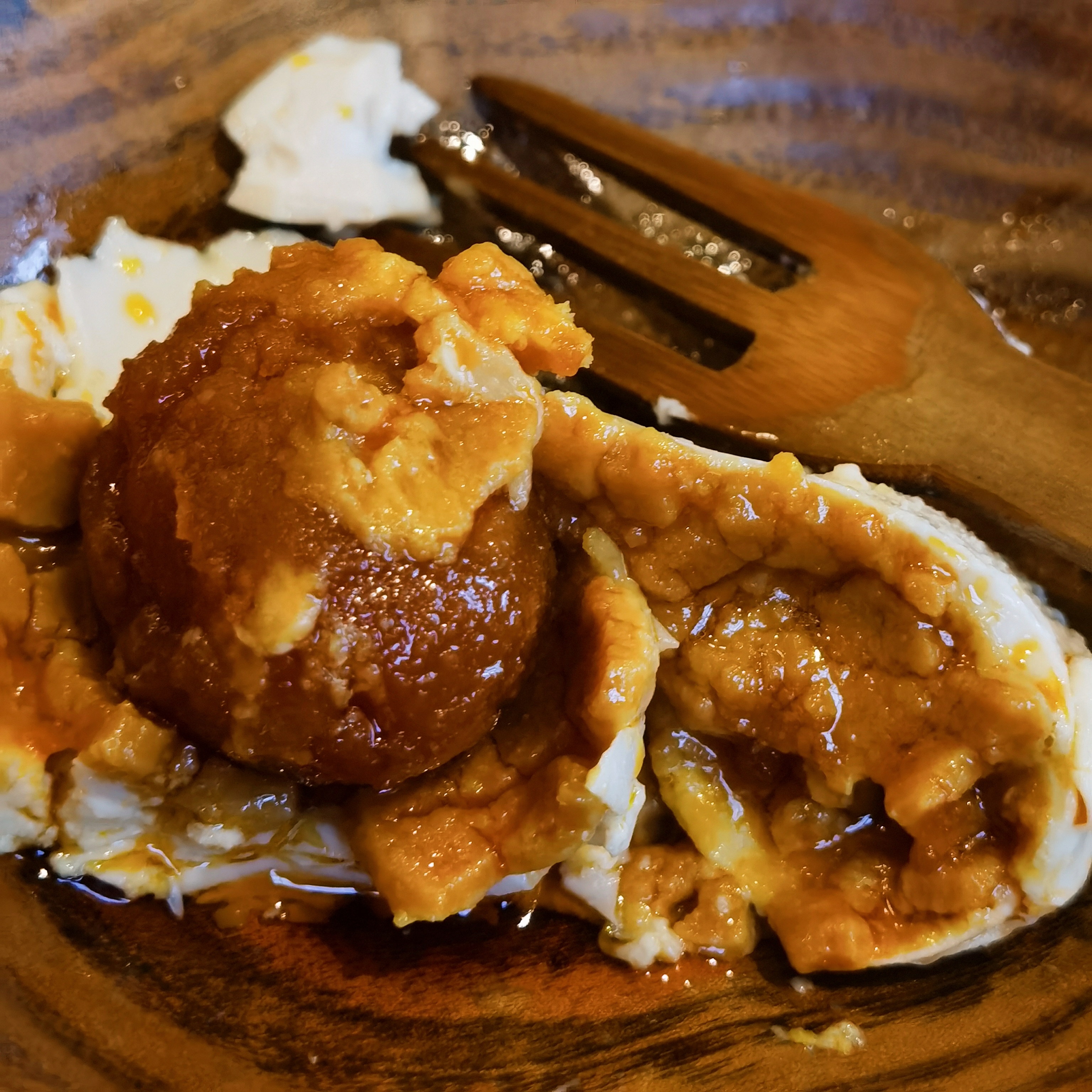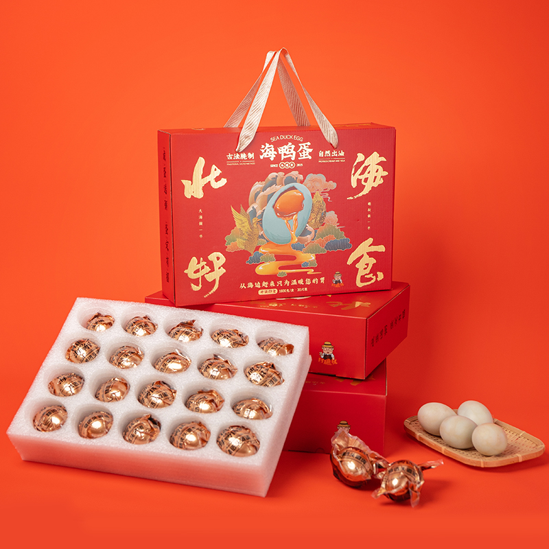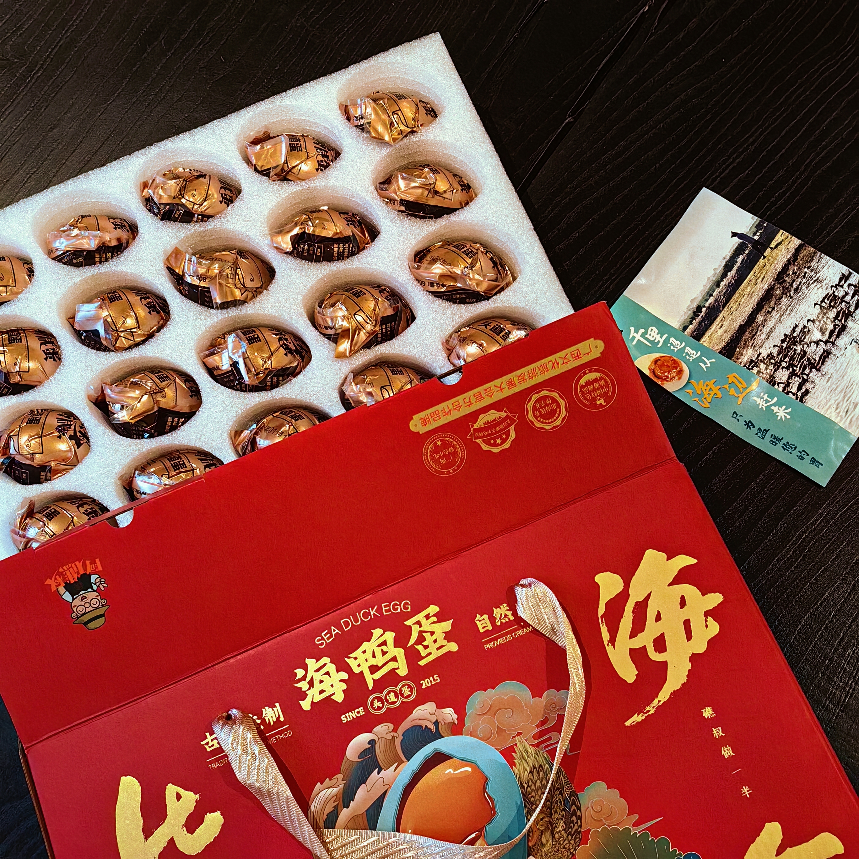我入了20枚礼盒装,核算下来也就4、5块一个,相比前几年上的那款会贵一些,但相信我,它值得!海鸭蛋除了比一般常见的鸭蛋大之外,因为经过秘制腌制和烘烤,所以蛋白是淡茶色的,吃起来不齁不腻,咸淡恰到好处,口感柔嫩无比,还有点五香的意思,跟大董8块钱一颗的有点像!剥开鸭蛋后,稍微用筷子一挑,真的有跟灌汤包汁水一样的黄油冒出来,富得流油了可以说是!夹一小块晶红油亮的蛋黄放进嘴里,细腻起沙,醇香绵密,细细品感觉还有淡淡的海鲜味,这口感,吃蟹黄也不过如此了吧!