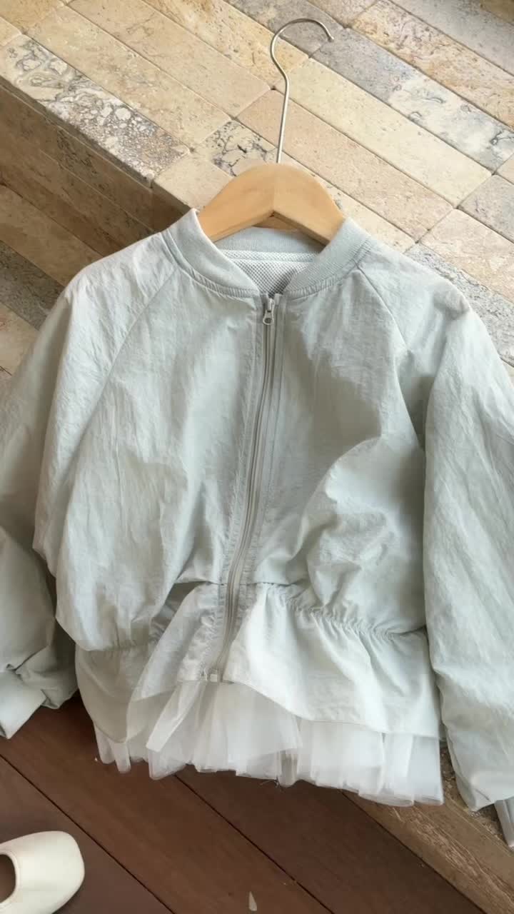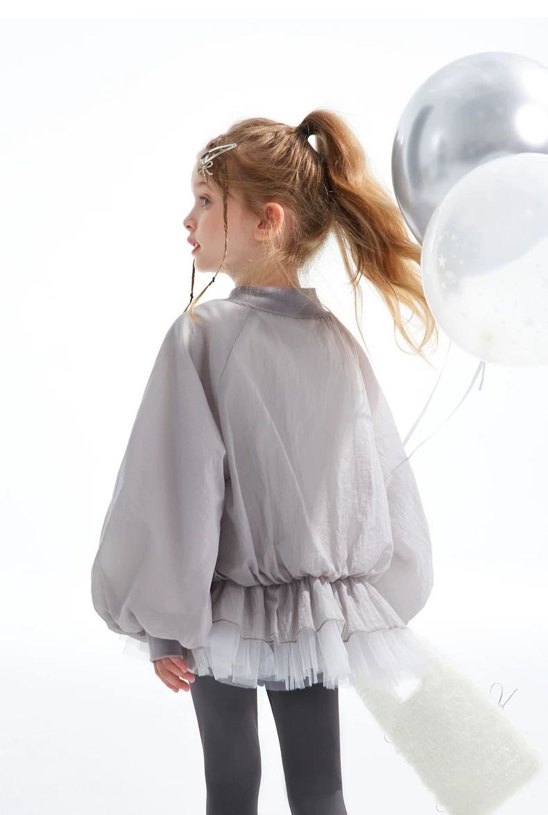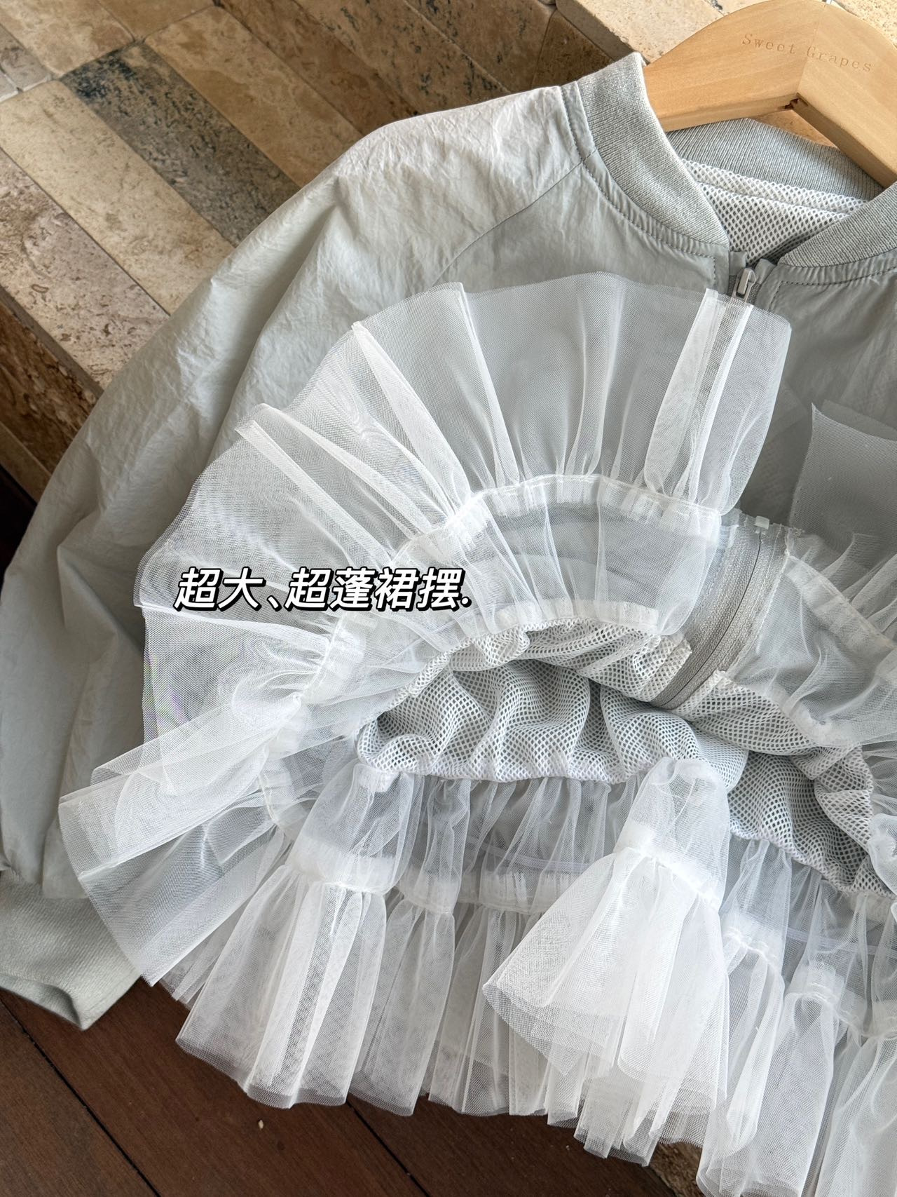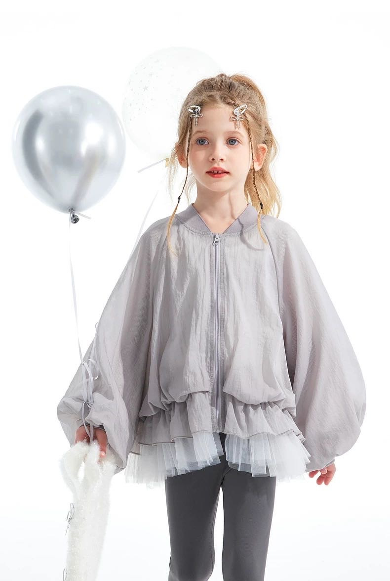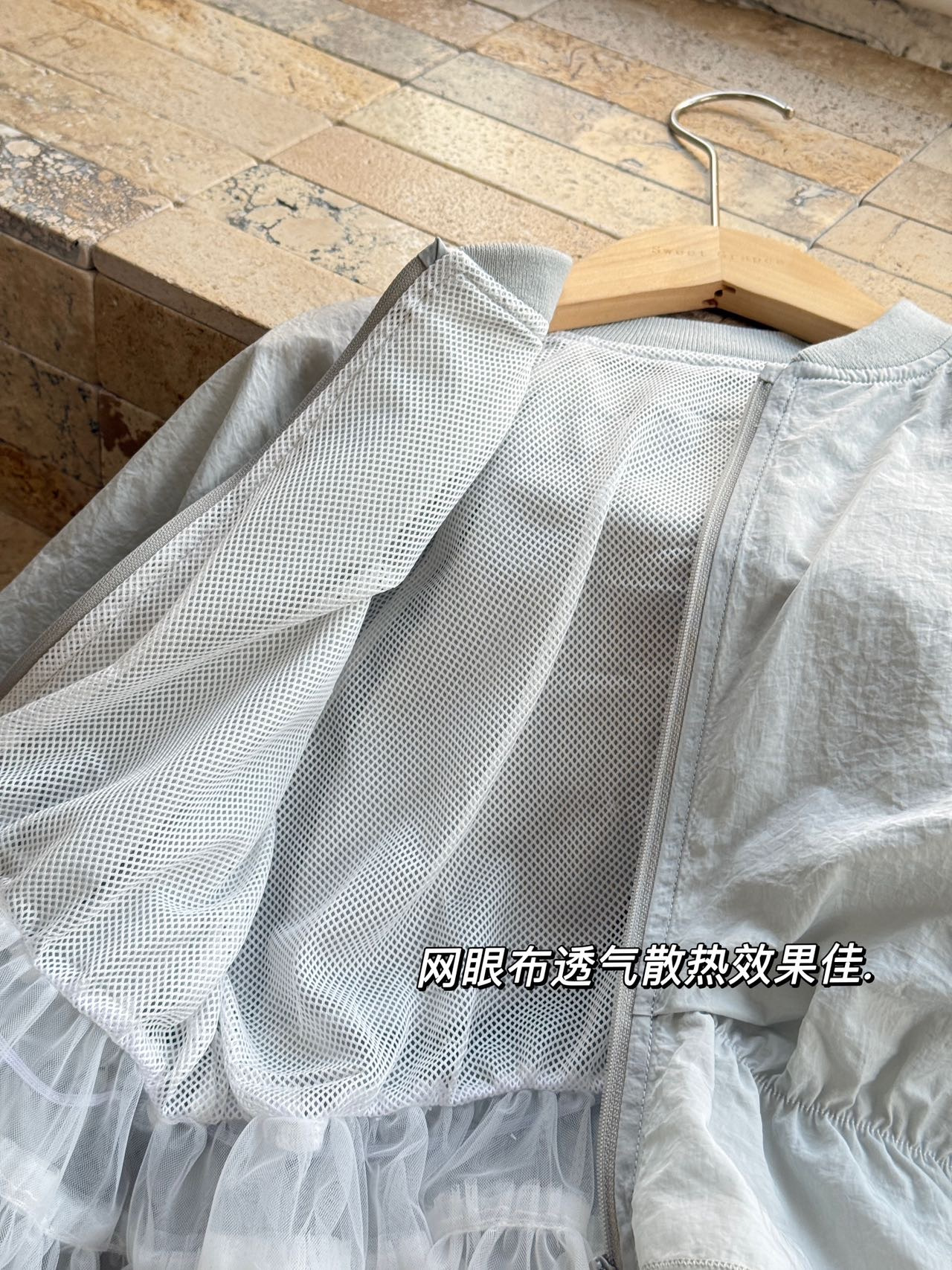 【轻纱絮语 | 以花苞为灵感,邂逅夏日浪漫】110-160❗️某猫同款,绝对的商超品质,SG超美花苞裙摆儿童外套❗️ 吊打市面同款❌重工打造,凉感轻纱泡泡袖棒球服,诠释夏日的轻盈美学❗️ ✔️薄纱邂逅立体剪裁的温柔,刚柔并济的层次感,行走之间摇曳生姿 ✔️ 下摆的「花苞裙式」设计是整件外套的点睛之笔!步履晃动时裙摆随风泛起,仙气飘飘 ✔️立体泡泡袖,宽松廓形不挑身材,胖瘦宝宝都可驾驭❗️