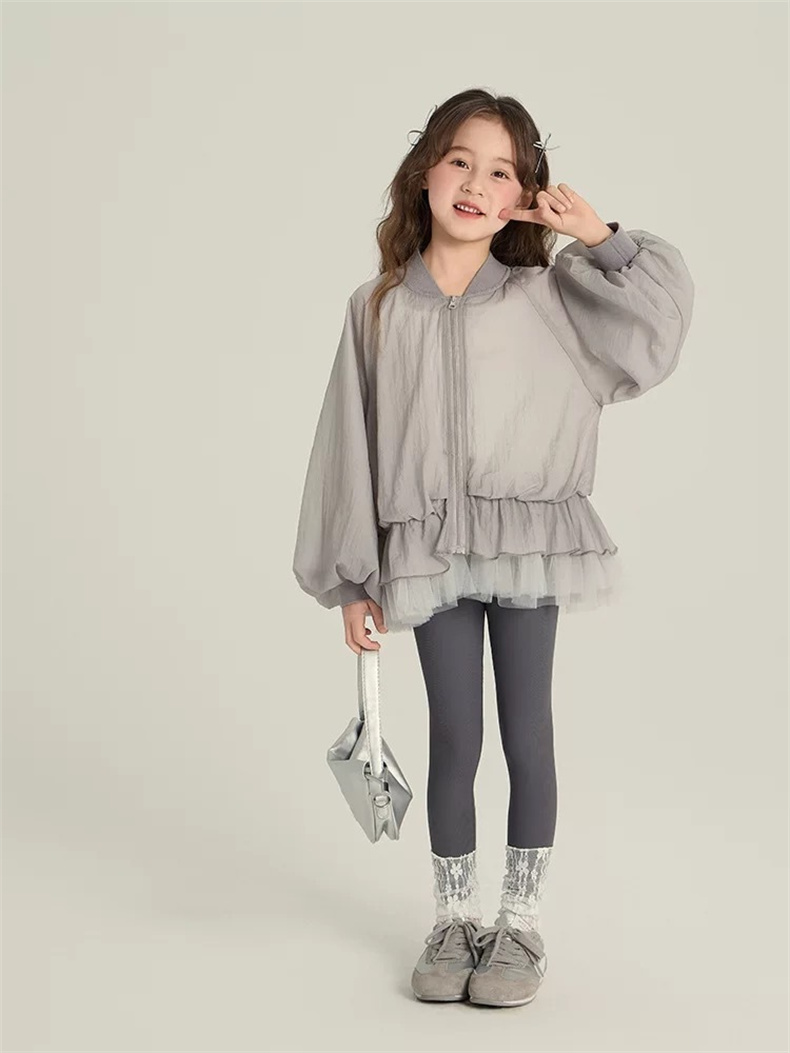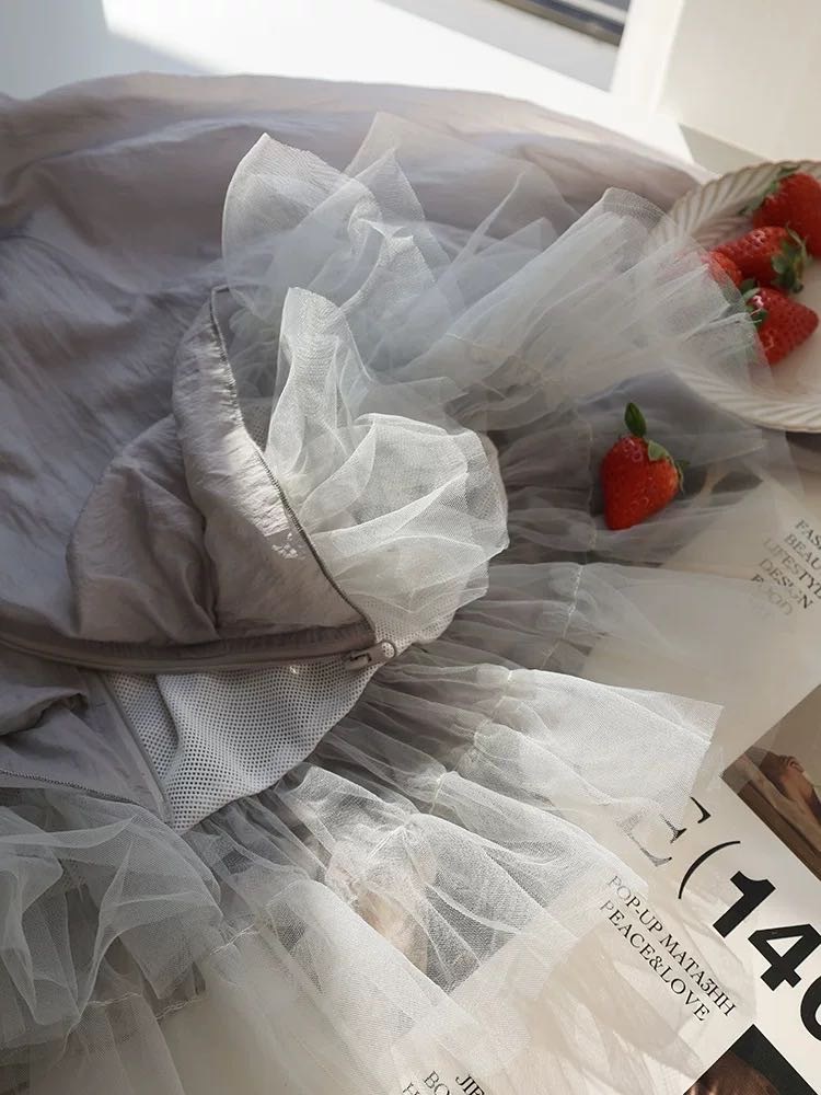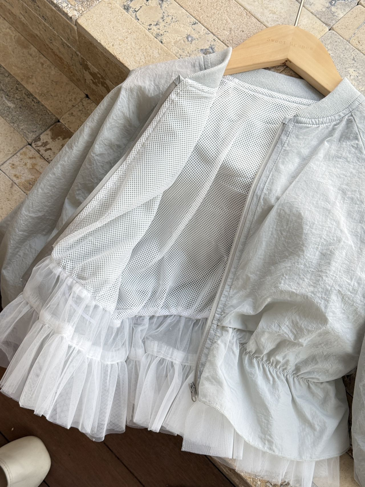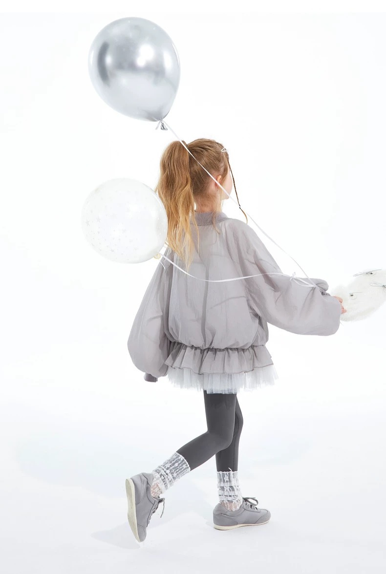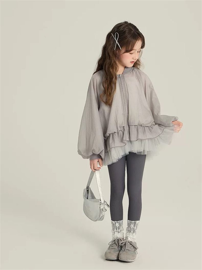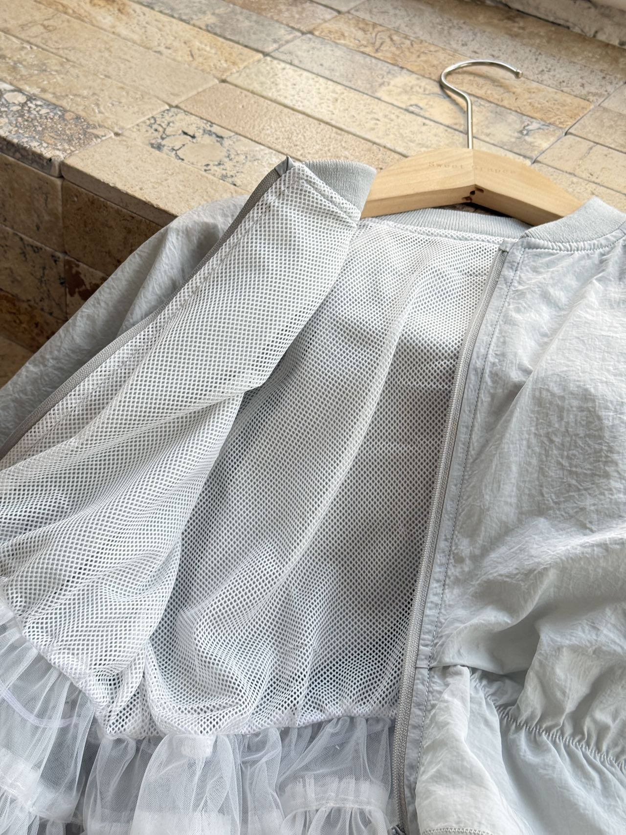 【轻纱絮语 | 以花苞为灵感,邂逅夏日浪漫】110-160❗️某猫同款,绝对的商超品质,SG超美花苞裙摆儿童外套❗️ 吊打市面同款❌重工打造,凉感轻纱泡泡袖棒球服,诠释夏日的轻盈美学❗️ ✔️薄纱邂逅立体剪裁的温柔,刚柔并济的层次感,行走之间摇曳生姿 ✔️ 下摆的「花苞裙式」设计是整件外套的点睛之笔!步履晃动时裙摆随风泛起,仙气飘飘 ✔️立体泡泡袖,宽松廓形不挑身材,胖瘦宝宝都可驾驭❗️
