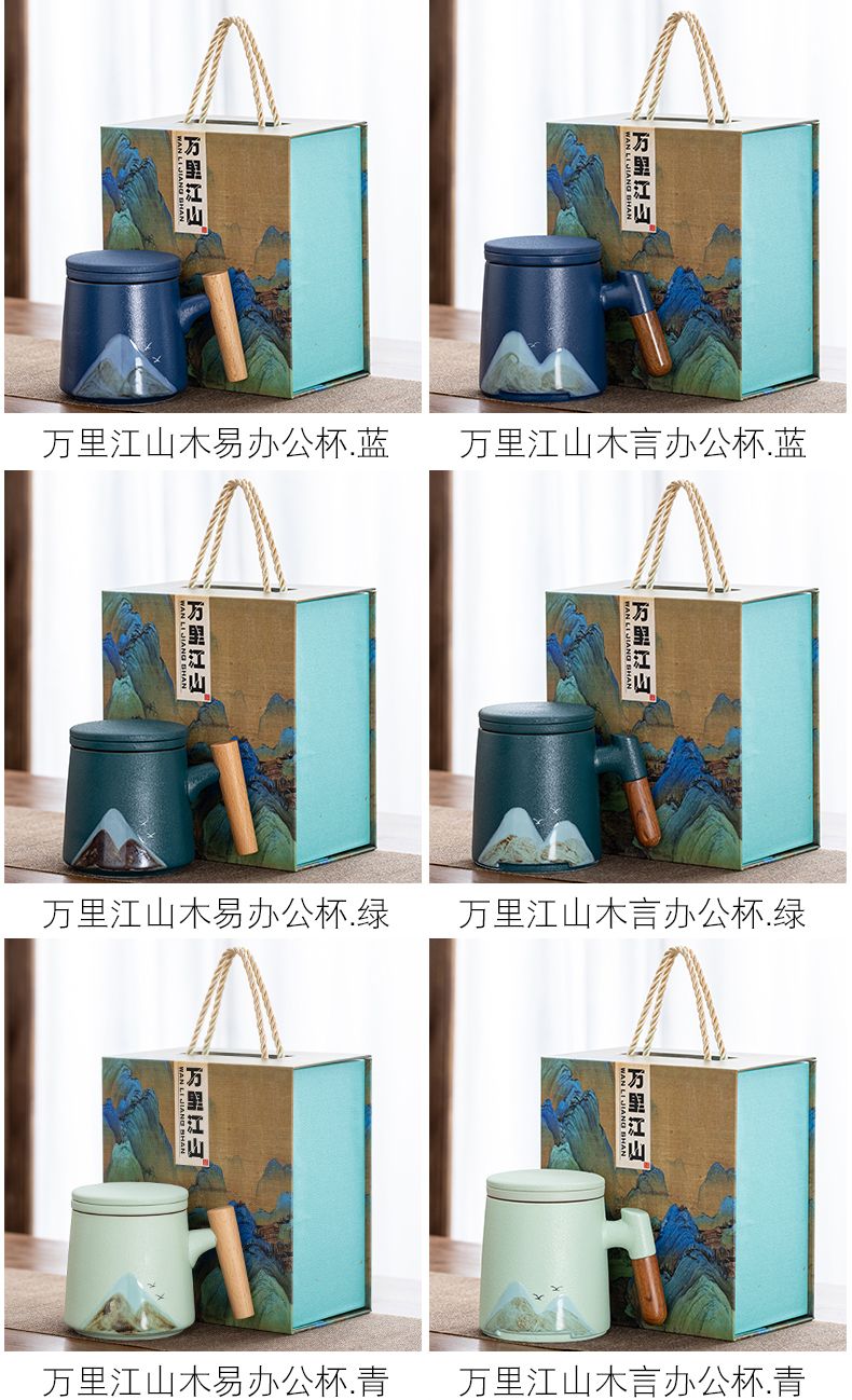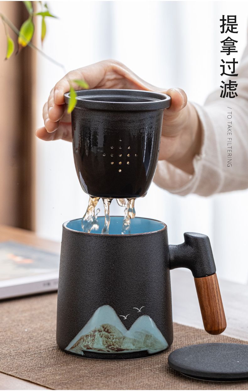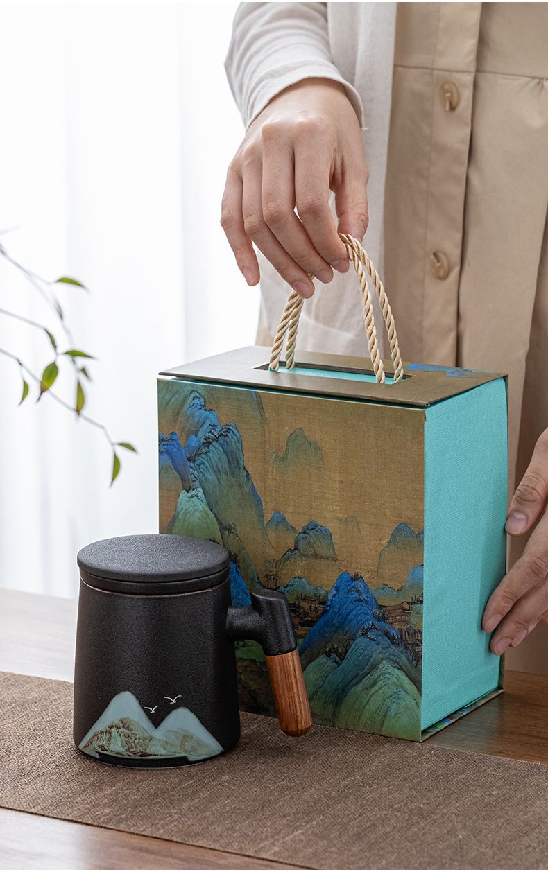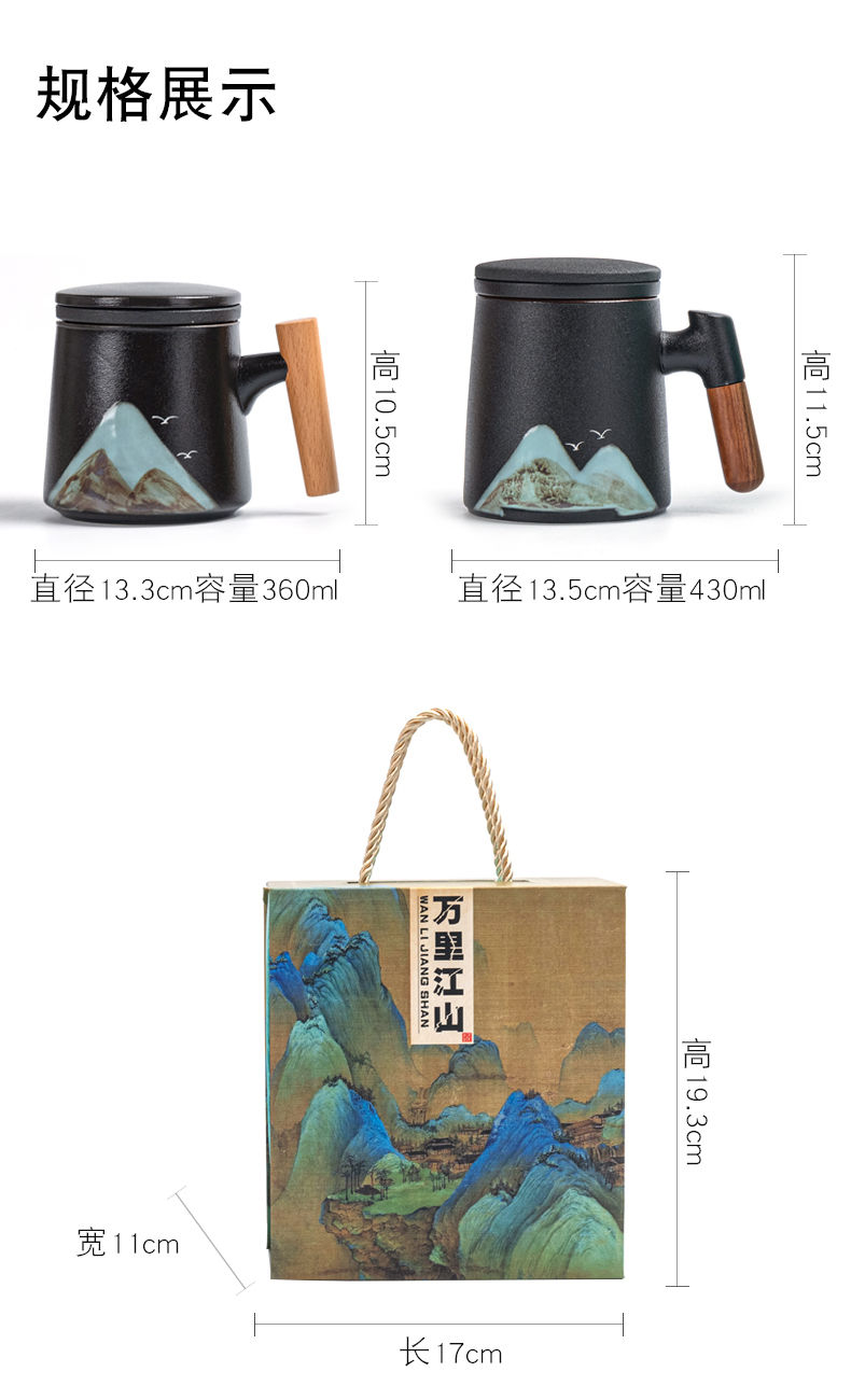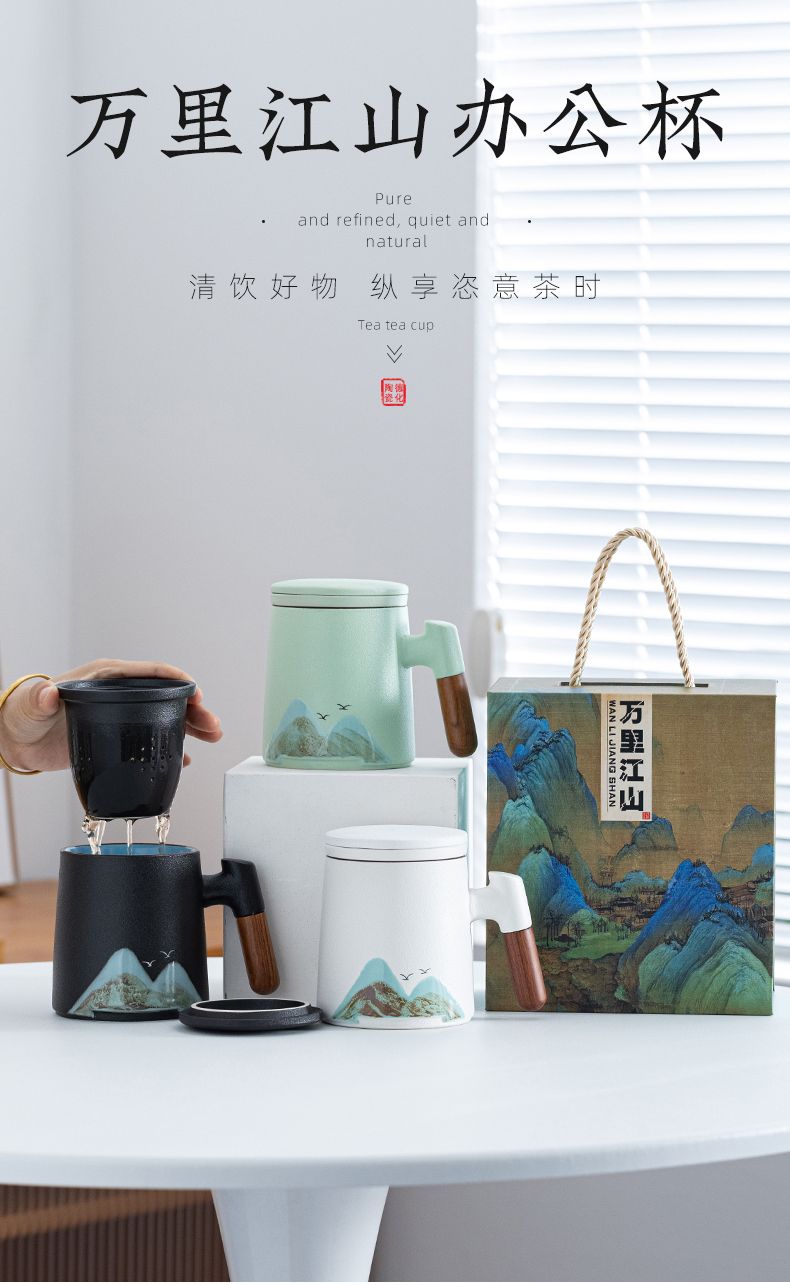 陶瓷茶水分离杯万里江山过滤泡茶杯办公室水杯马克杯带盖节庆礼品
