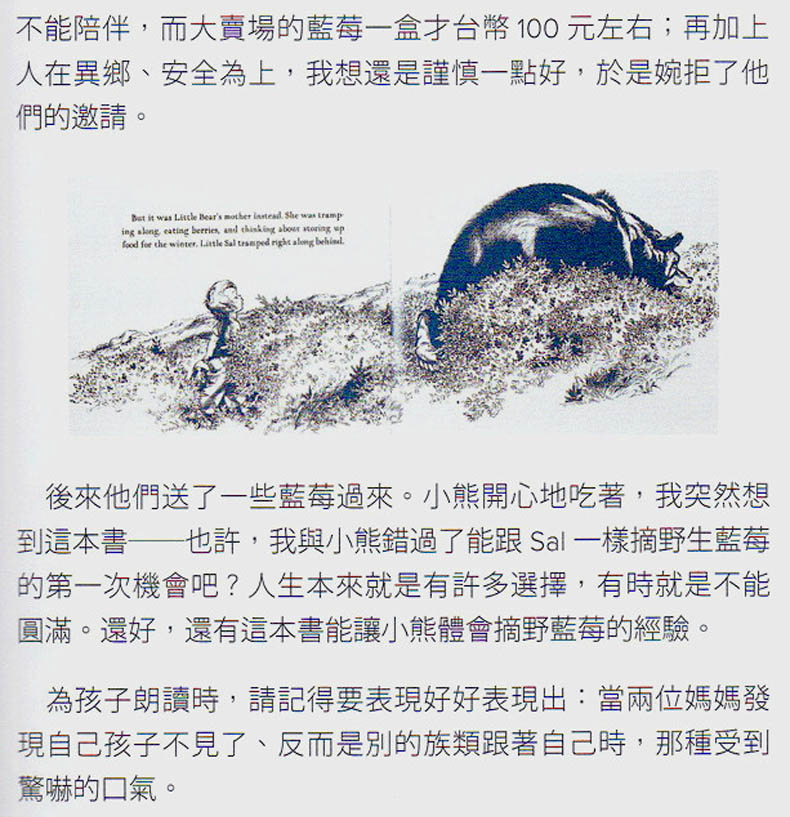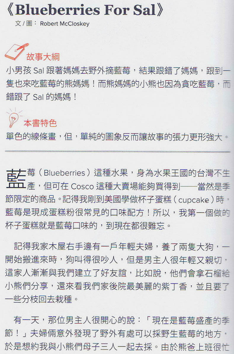 Blueberries for Sal《小塞尔采蓝莓》是一本关于爱和成长的作品,文字朴实,语言简单重复易于理解,绘画优美生动,将孩子带入一个单纯而隐藏悬念的故事之中。