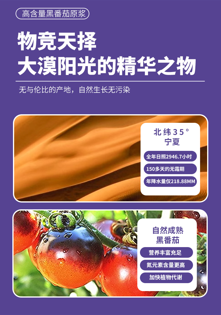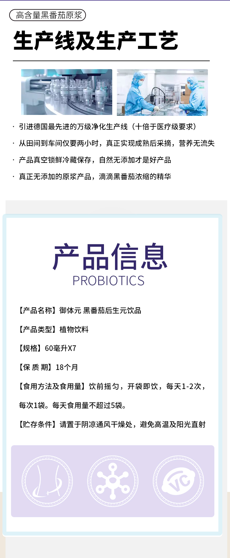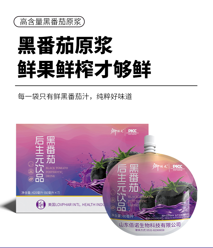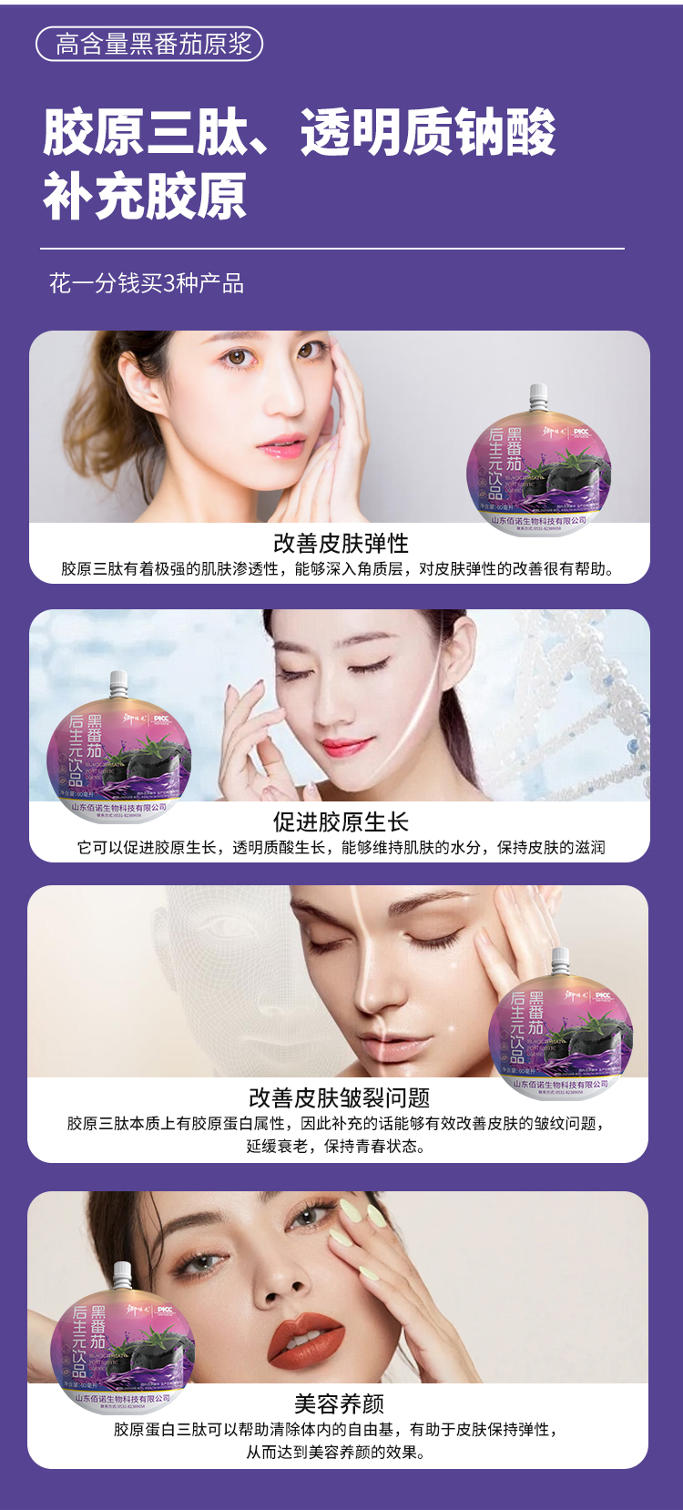 【成分】黑番茄原浆78%,综合浓缩果蔬发酵液[蔬果发酵液(苹果、香蕉、甘薯、菠萝、西兰花、球茎甘蓝、木瓜、青梅、西瓜、胡萝卜、葡萄柚、甜瓜、芥蓝、番石榴、杨桃、葡萄、莲雾、柠檬、花椰菜、芜菁、萝卜、山药、马铃薯、牛蒡根、芋头、苋菜、蕹菜、冬瓜、西葫芦、甘薯叶、苦瓜、根恭菜、豆瓣菜、丝瓜、黄瓜、南瓜、柿子、大白菜、芦笋、枣、芹菜、叶用芥菜、结球甘蓝、菠菜、叶用莴苣、青椒、番茄、银耳、木薯、佛手瓜、金针菇、草菇、火龙果、黑木耳、李子、茄子、木耳菜、姜、豌豆、油菜、雪里蕻、水蜜桃、西番莲、猕猴桃、柑橘、橙子、诺丽果浆、番荔枝)、低聚异麦芽糖、山梨糖醇]16.4695%,蓝莓浓缩汁5%,胶原三肽,雨生红球藻粉,银耳多糖,透明质酸钠,烟酰胺,后生元(灭活乳酸菌PostbioP-6)