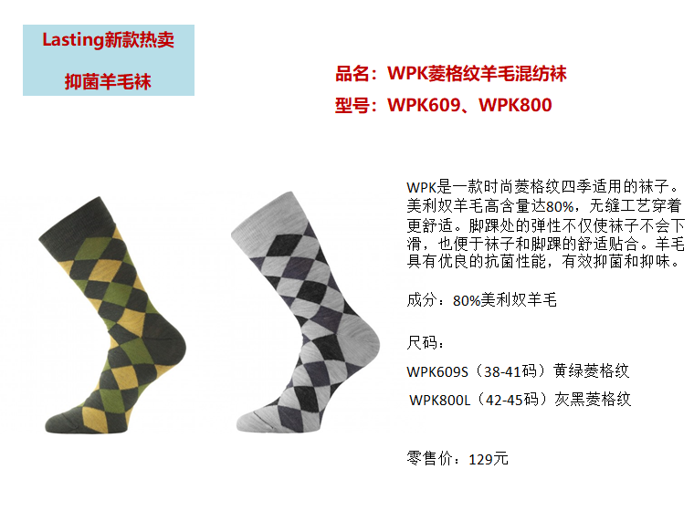 捷克LastingWPK菱格纹男士时尚薄款羊毛混纺袜
