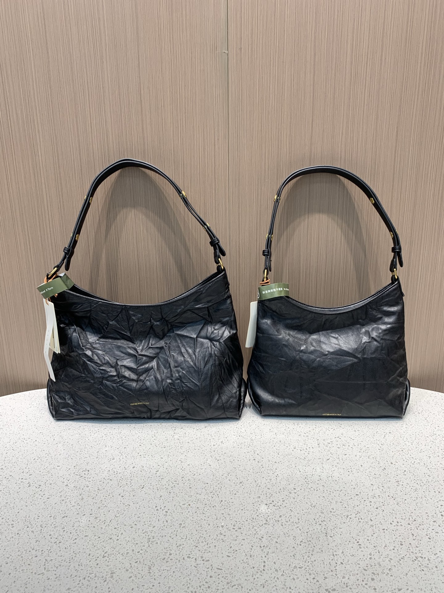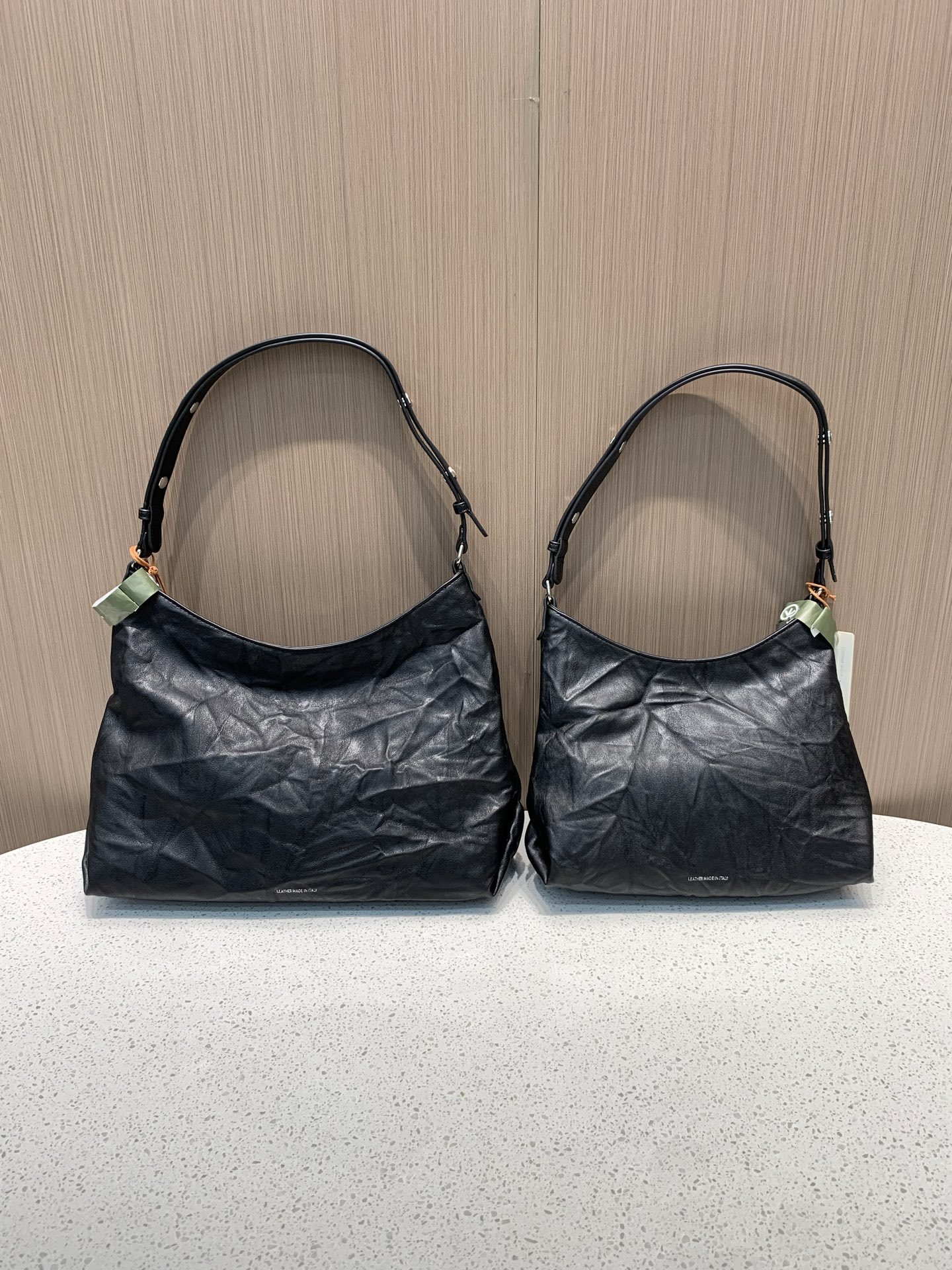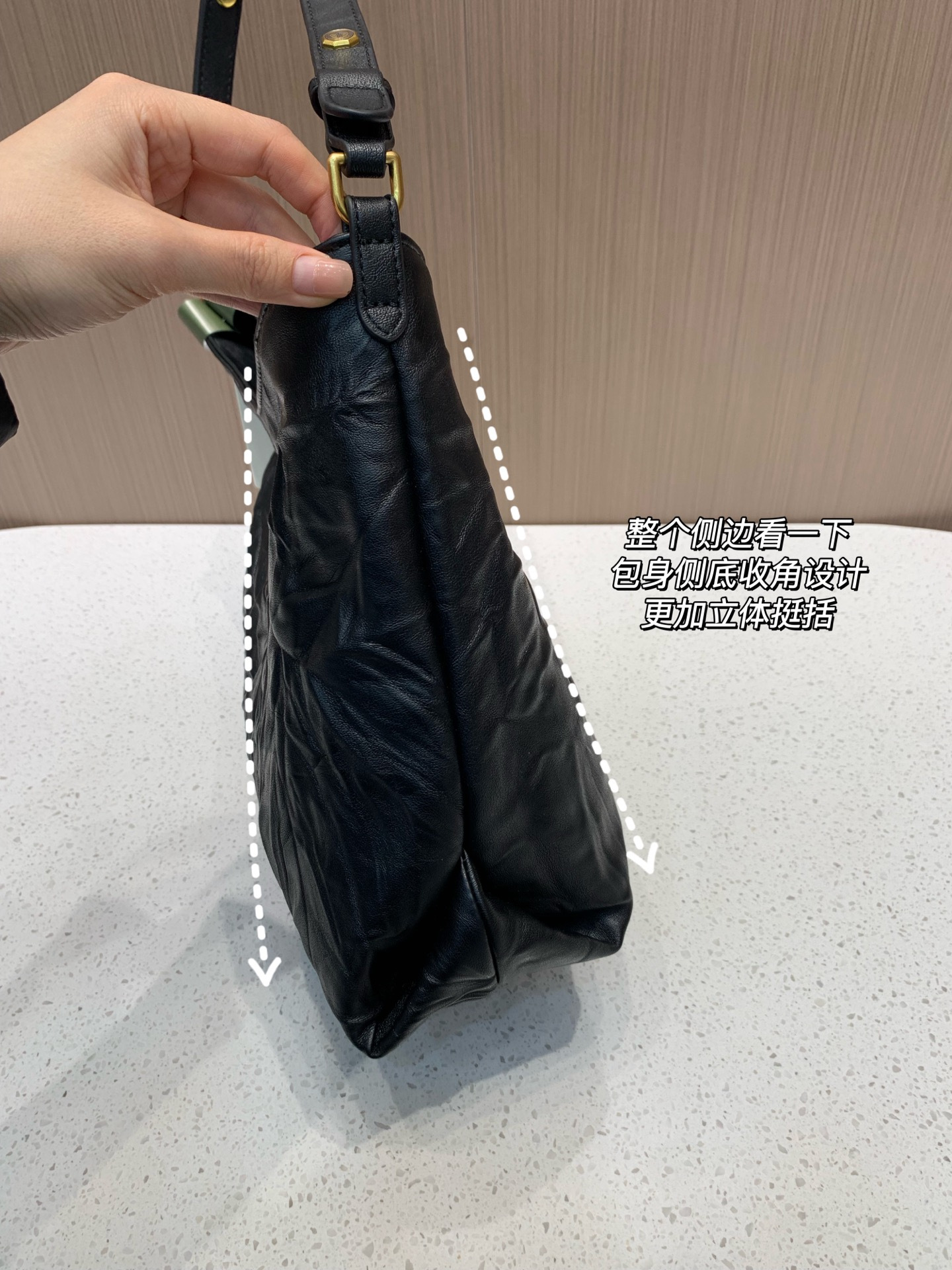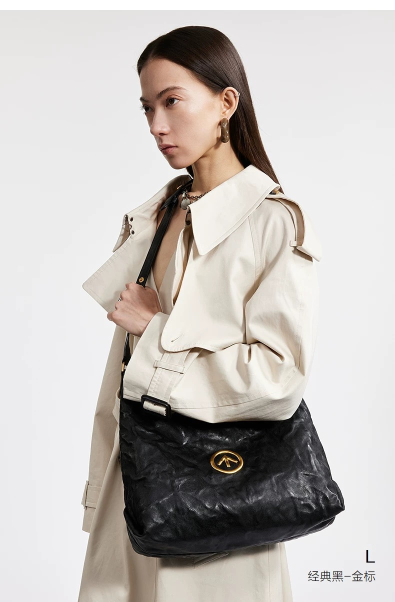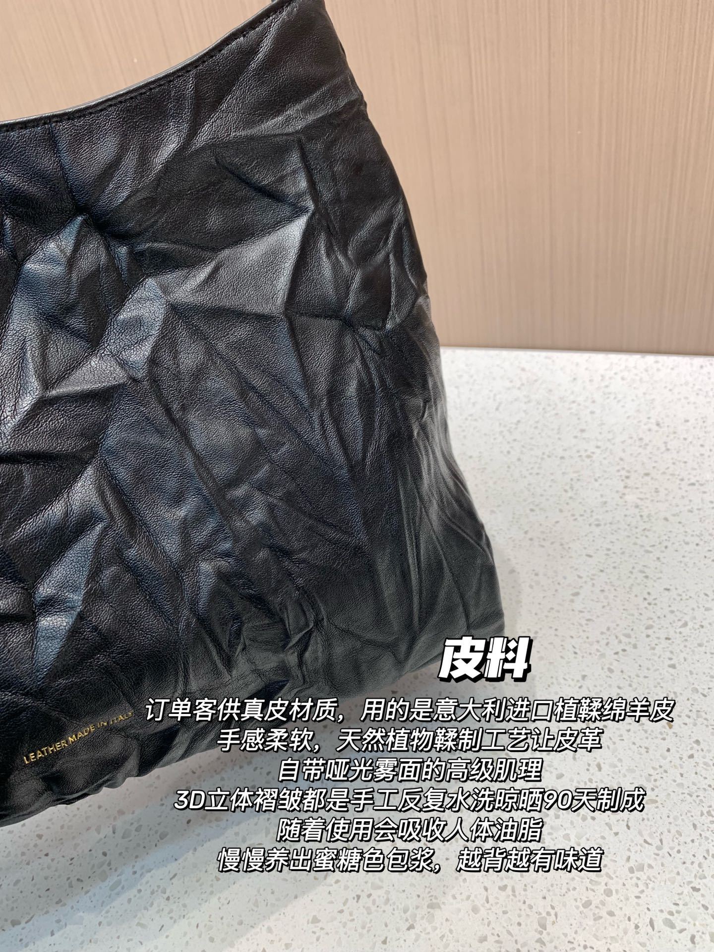 订单客供真皮材质,用的是意大利进口植鞣绵羊皮,手感柔软,天然植物鞣制工艺让皮革自带哑光雾面的高级肌理,3D立体褶皱都是手工反复水洗晾晒90天制成,随着使用会吸收人体油脂,慢慢养出蜜糖色包浆,越背越有味道