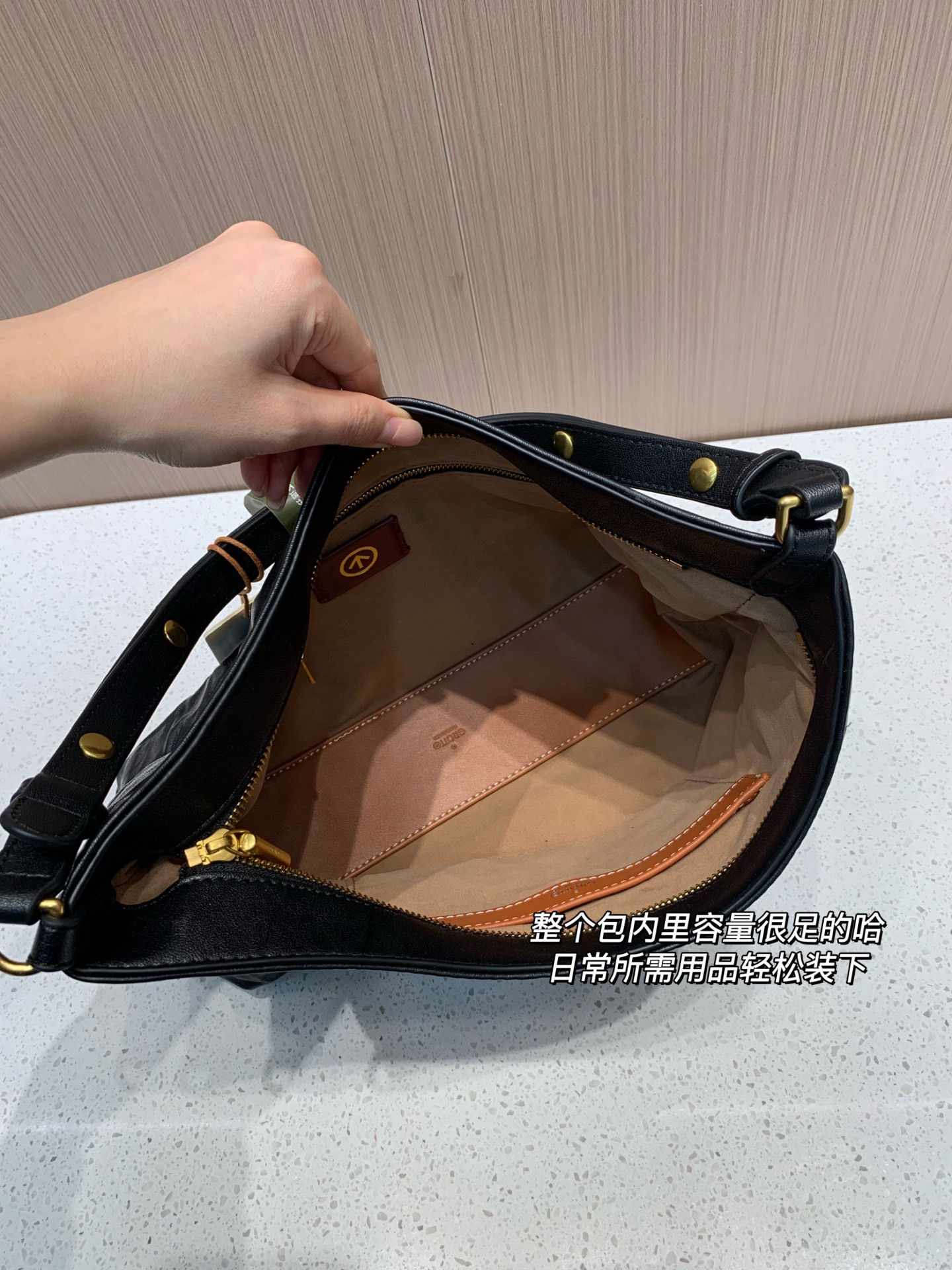黑色百搭不挑,有金标、银标点缀低调不浮夸,职场正装、日常休闲装都能无缝衔接,容量很充足的,日常出门的化妆品都OK,男女同款