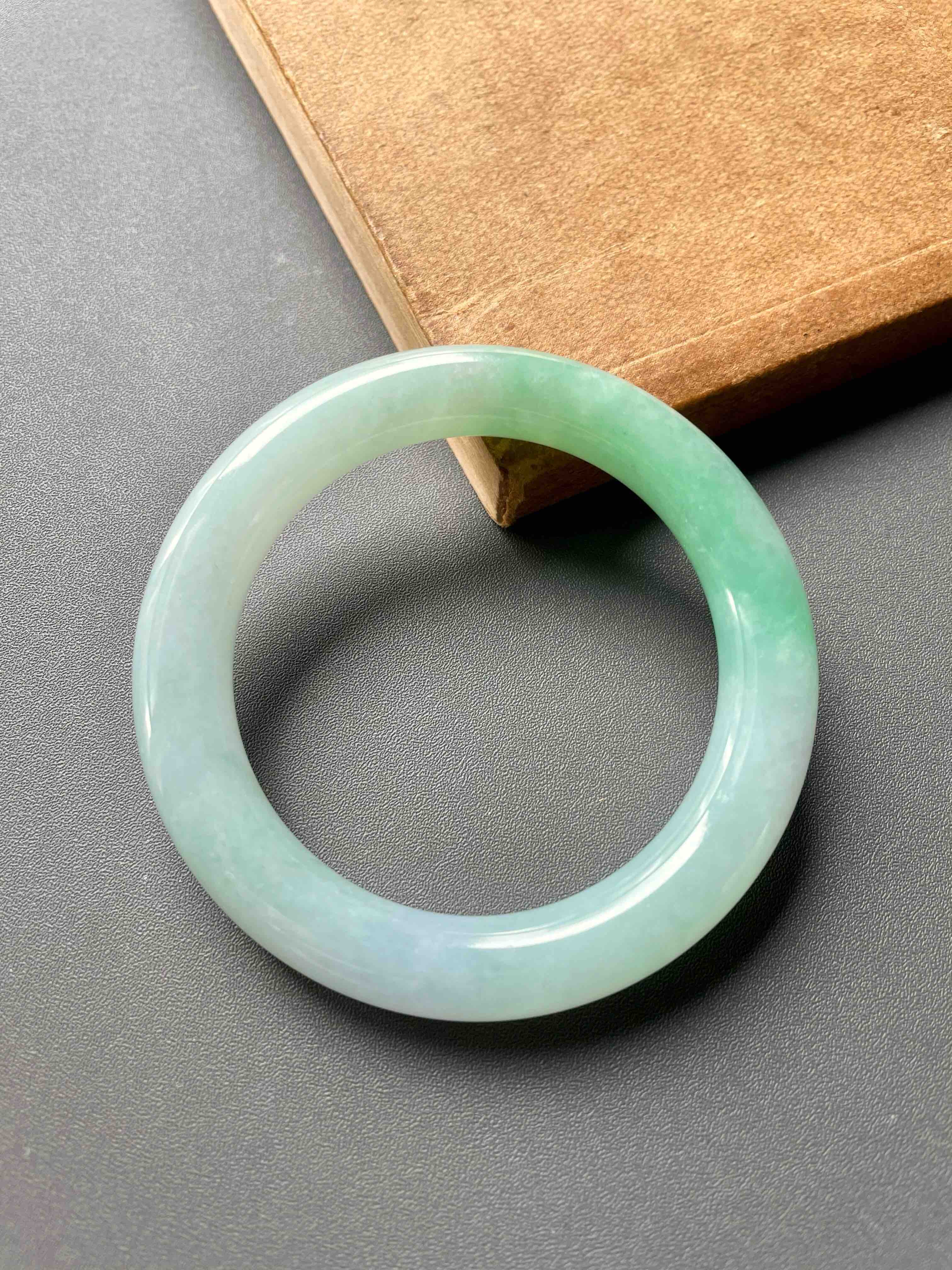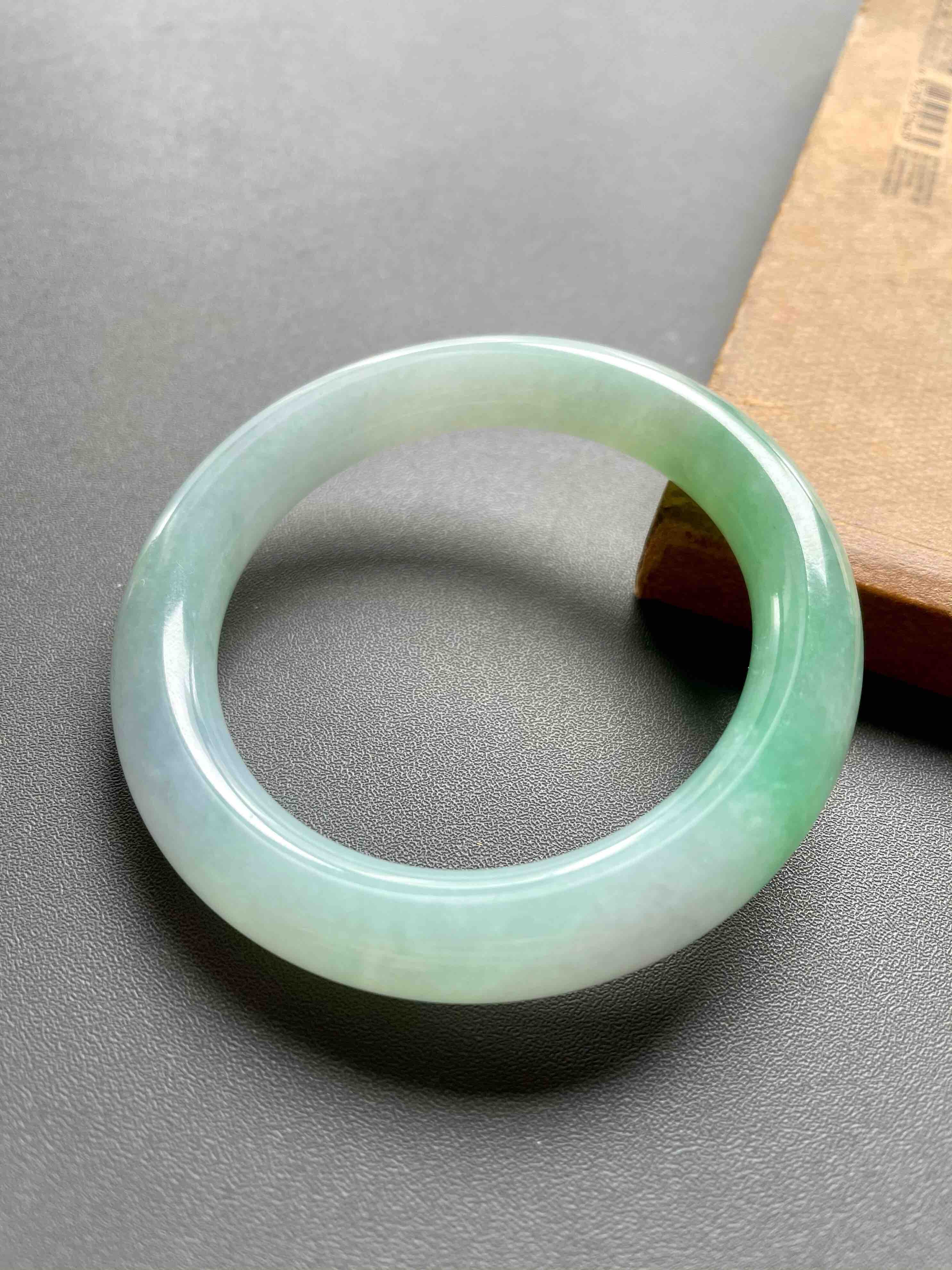 美镯来啦,糯冰种阳绿,有种有色,太漂亮了,种水晶莹剔透,阳绿甜美,上手特别衬肤色的那种,尺寸特别好,内径55.5mm,宽10.7mm,适合手寸55到57佩戴,怎么量你的尺码看最后一图
