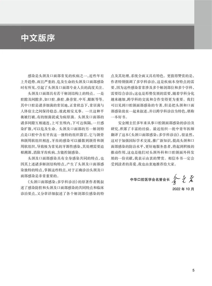 本专著将发生在这一区域的感染命名为“头颈口面部感染”(head, neck and orofacial infection),也正是由于发生在这一区域的感染性疾病除了涉及口腔颌面外科及其他口腔专业,还涉及其他多学科,主要包括头颈外科、耳鼻喉科、眼科、整形外科、神经外科等。头颈口面部感染的诊断和治疗必然会在各学科之间有所交叉,所以跨学科合作是该区域严重感染治疗的必由之路。目前,本书是头颈口面部复杂感染跨学科诊治方面的第一本专著。