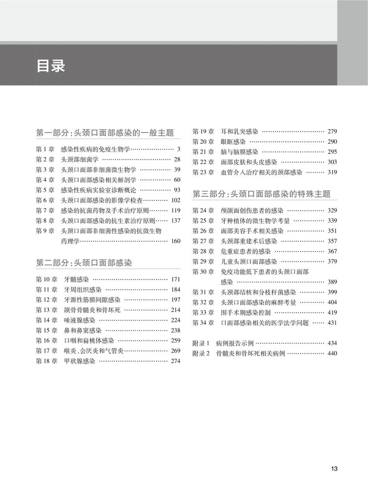本书分为三个部分,共34章。第一个部分是关于头颈口面部感染的一般主题,主要包括该部位的免疫生物学、微生物学、解剖学、药理学等基础知识,还有实验室诊断、影像学检查,以及感染的抗菌药物(包括抗生素)治疗及手术治疗的原则等。第二部分是头颈口面部各类型感染的个论,涉及口腔内科以及口腔外科的各类型感染,耳鼻喉各部位感染,眼科以及颅脑感染等。第三部分是头颈口面部感染的特殊主题,其中包括:特殊类型的手术(例如牙种植)相关的感染;特殊人群相关感染,例如儿童患者、危重症患者、创伤患者等;还包括特殊感染如结核杆菌感染;此外还介绍了感染的麻醉考量,围手术期感染控制,以及感染相关的法律问题考量。