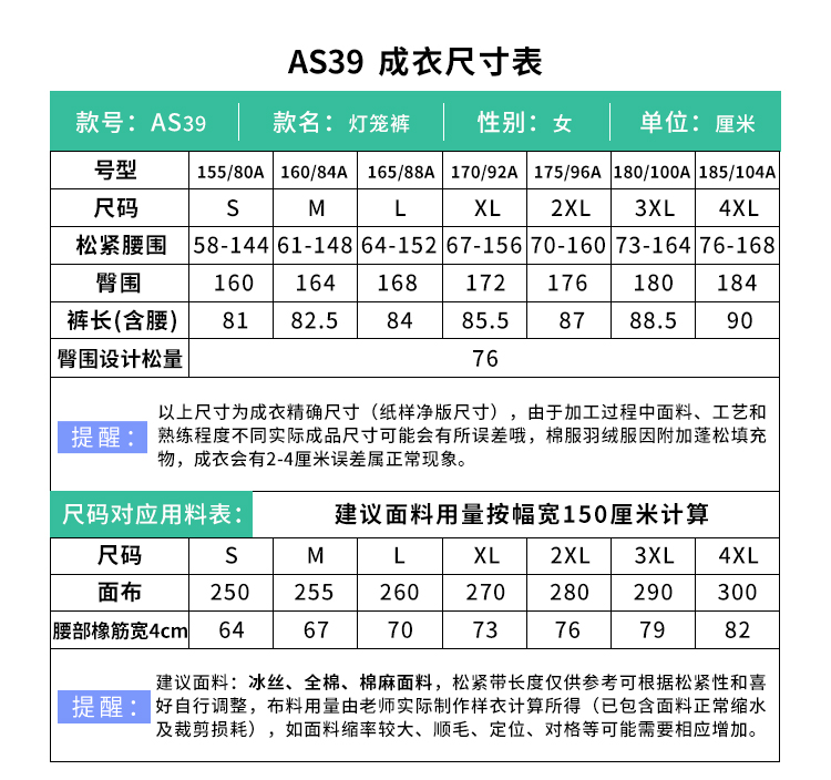 裁缝学苑AS39裤裙女高腰灯笼裤纸样女装萝卜裤子阔腿裤七分裤打板