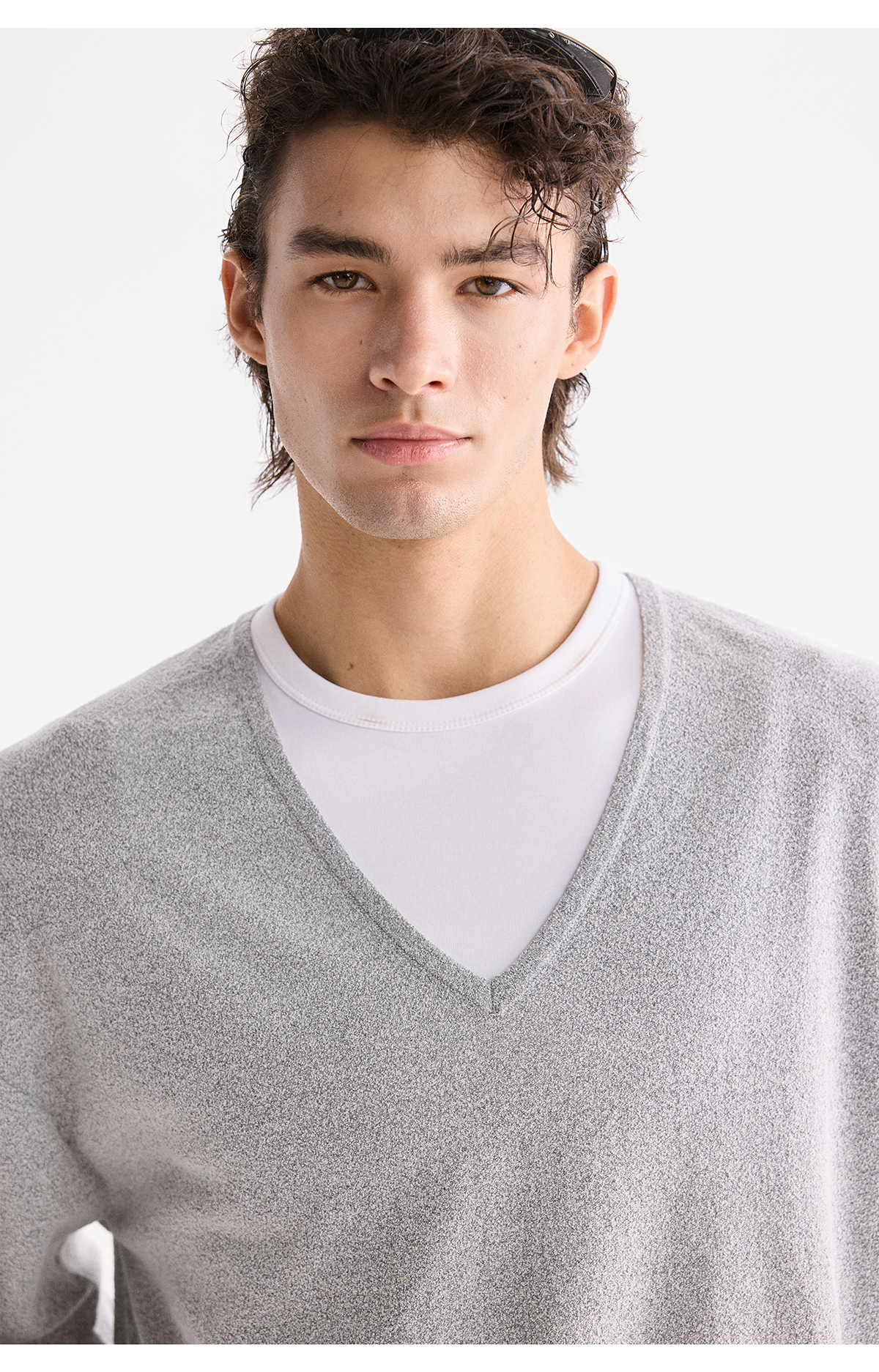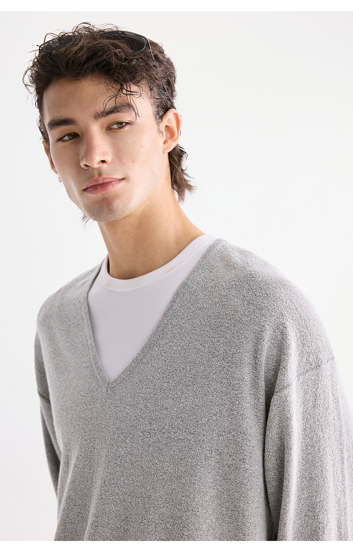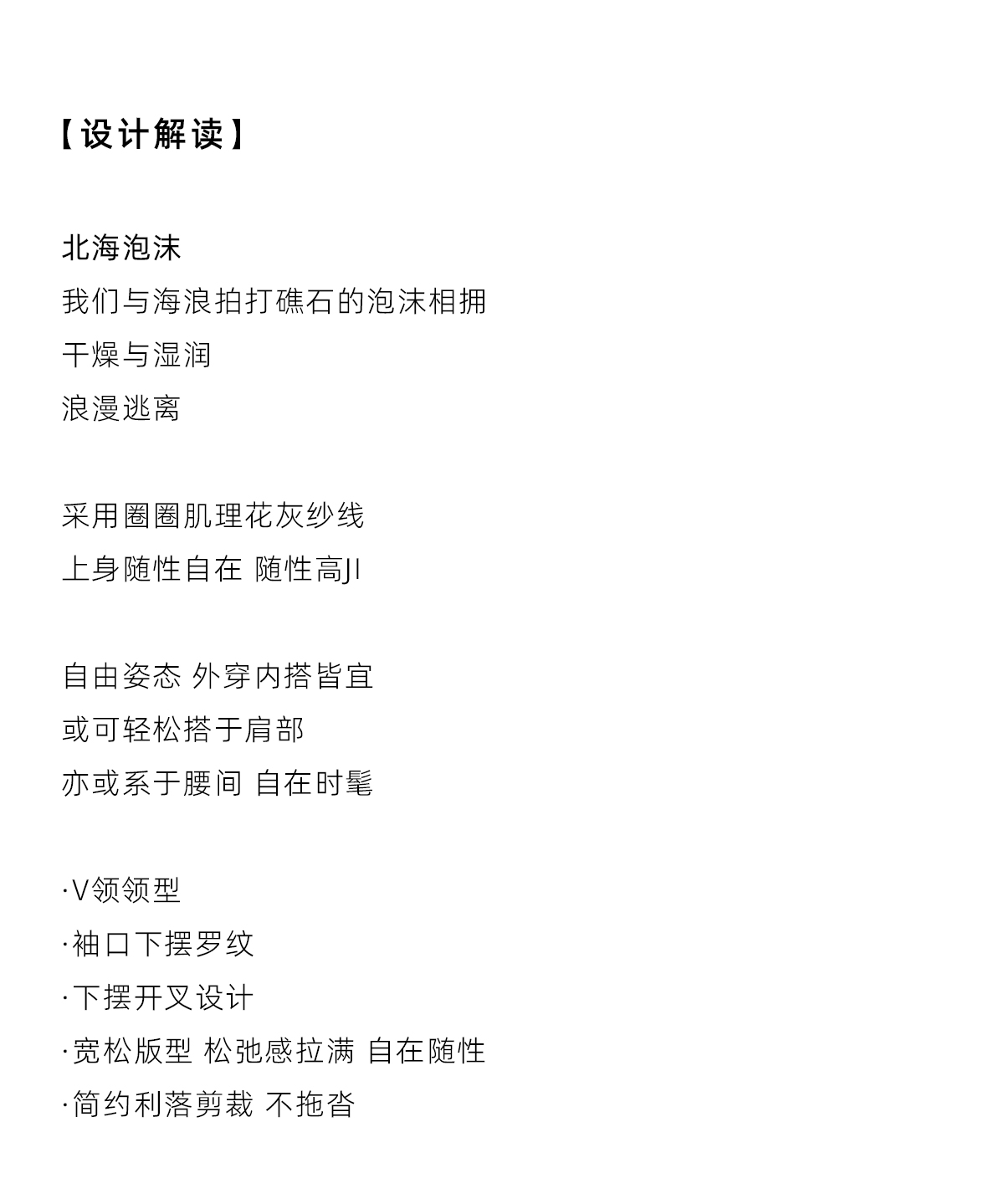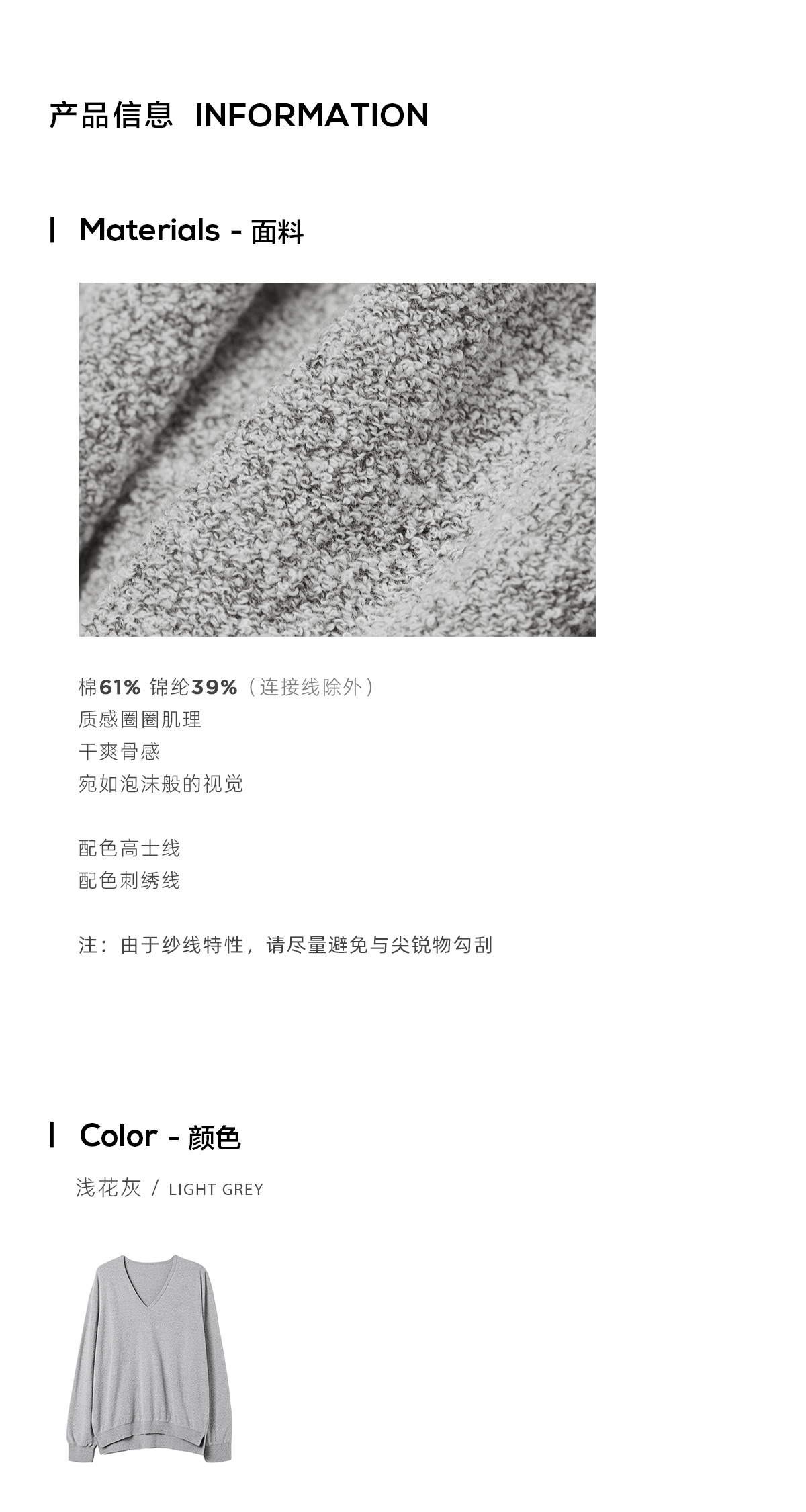 棉仓3621001001-【北海泡沫】浅花灰圈圈肌理深V领型编织长袖T
