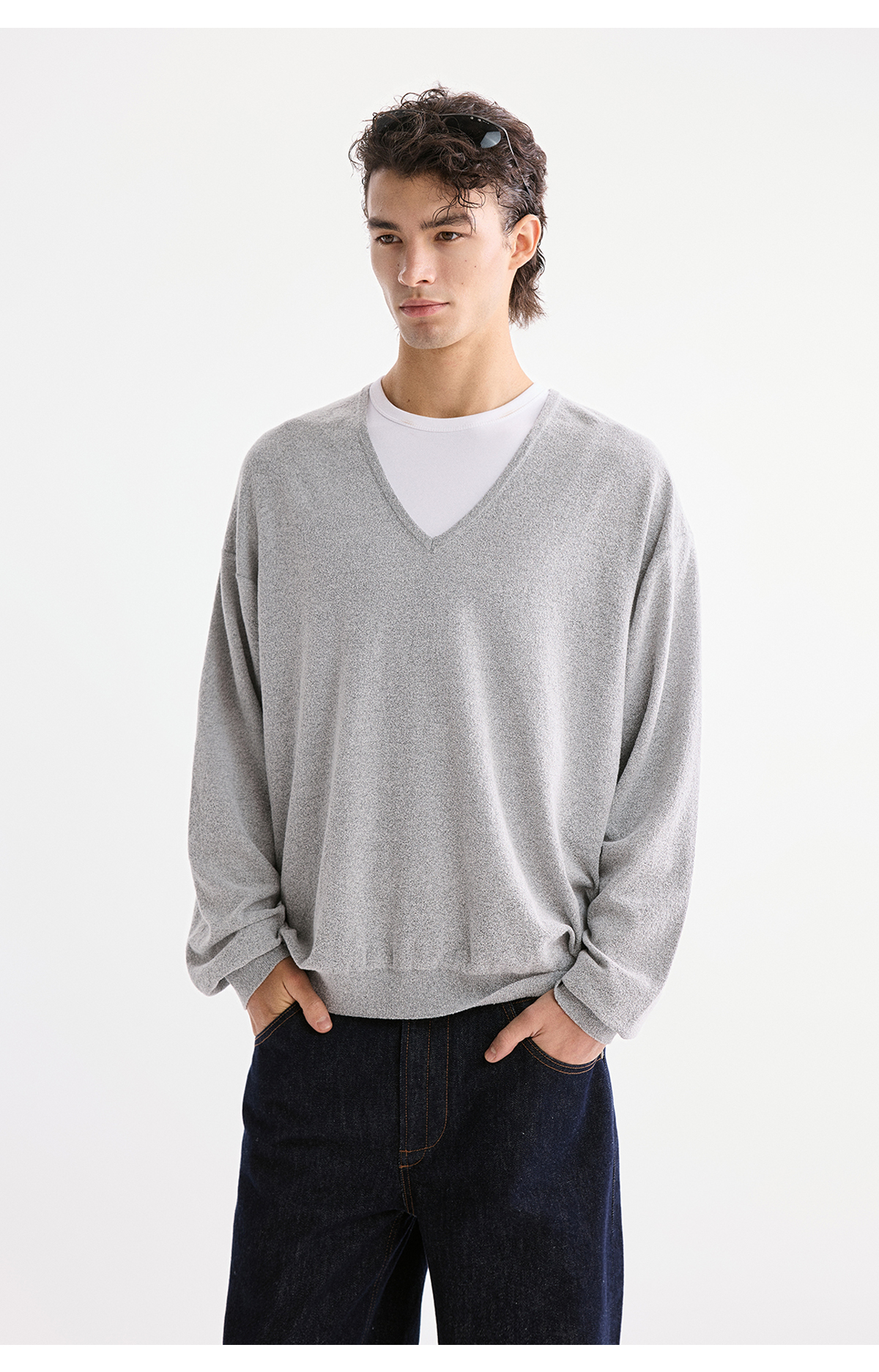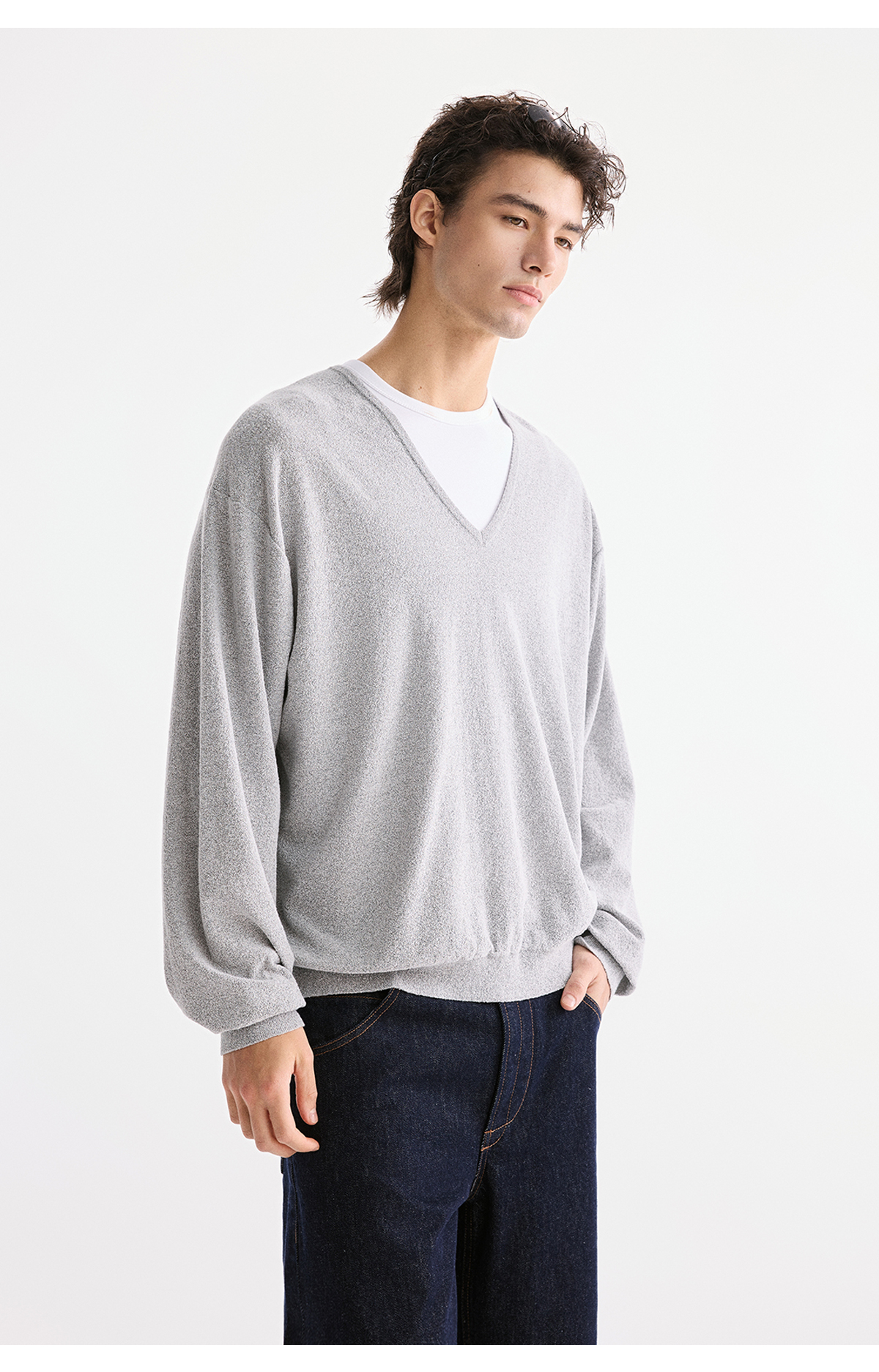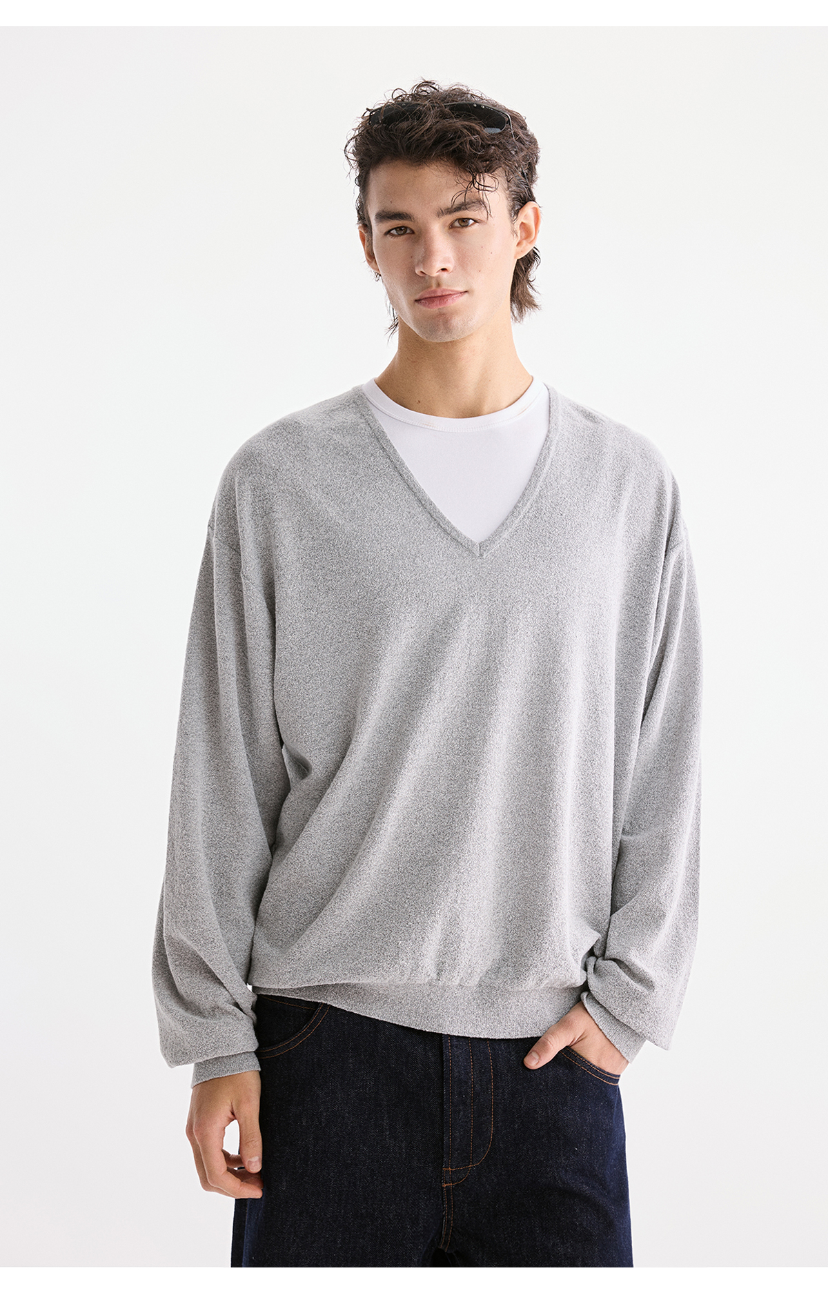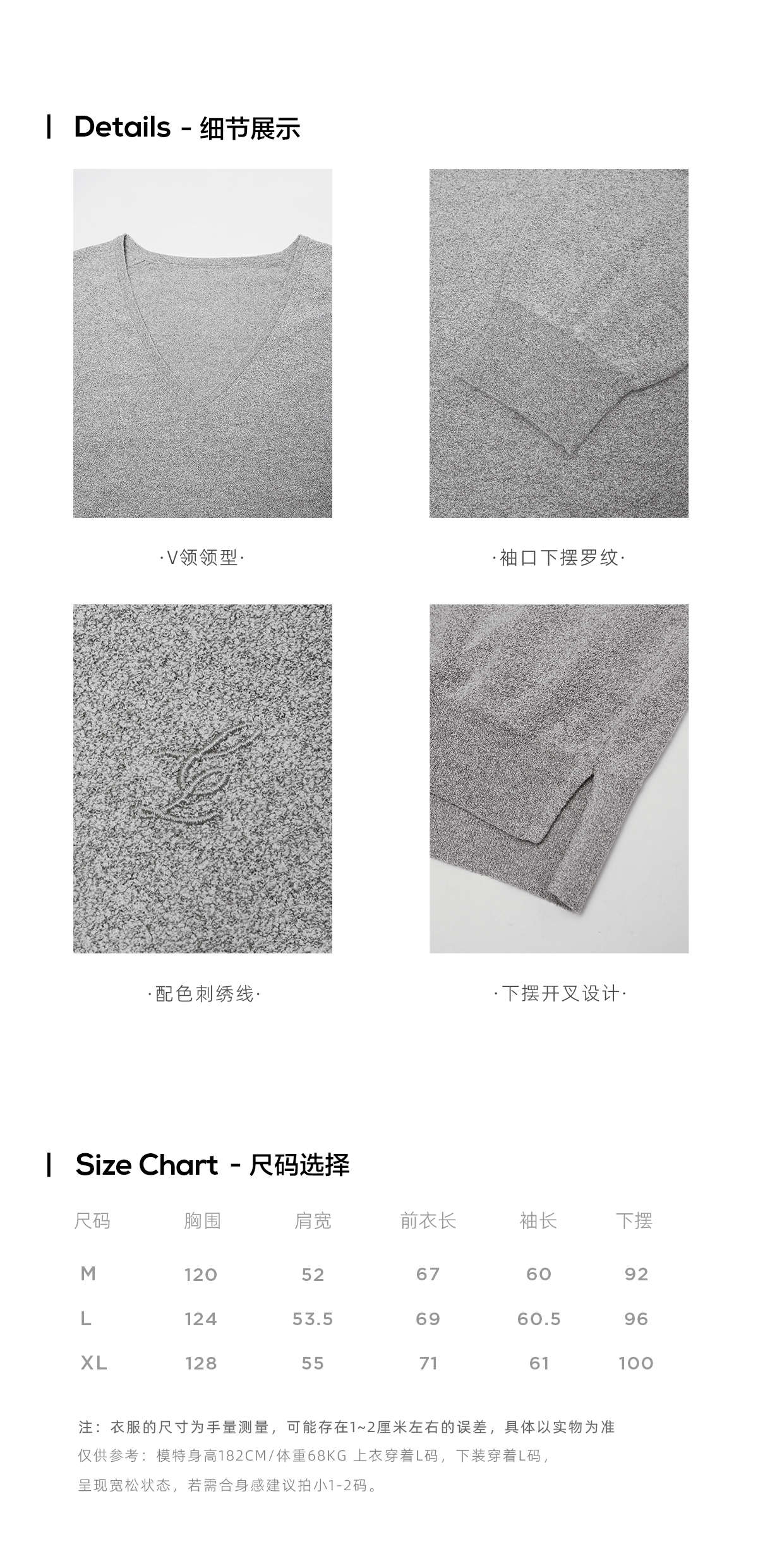 棉仓3621001001-【北海泡沫】浅花灰圈圈肌理深V领型编织长袖T