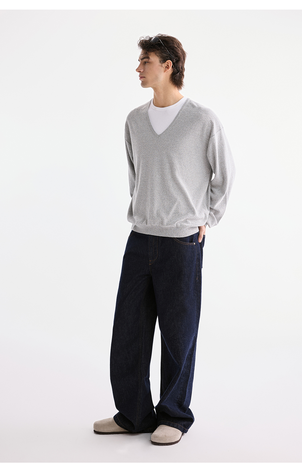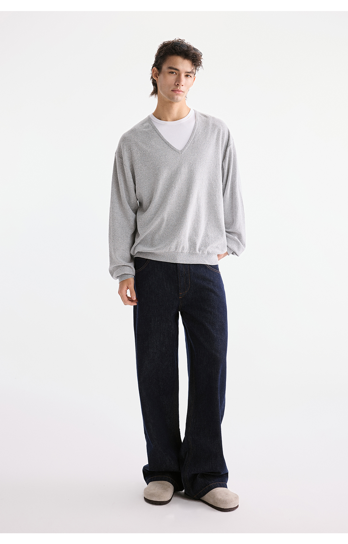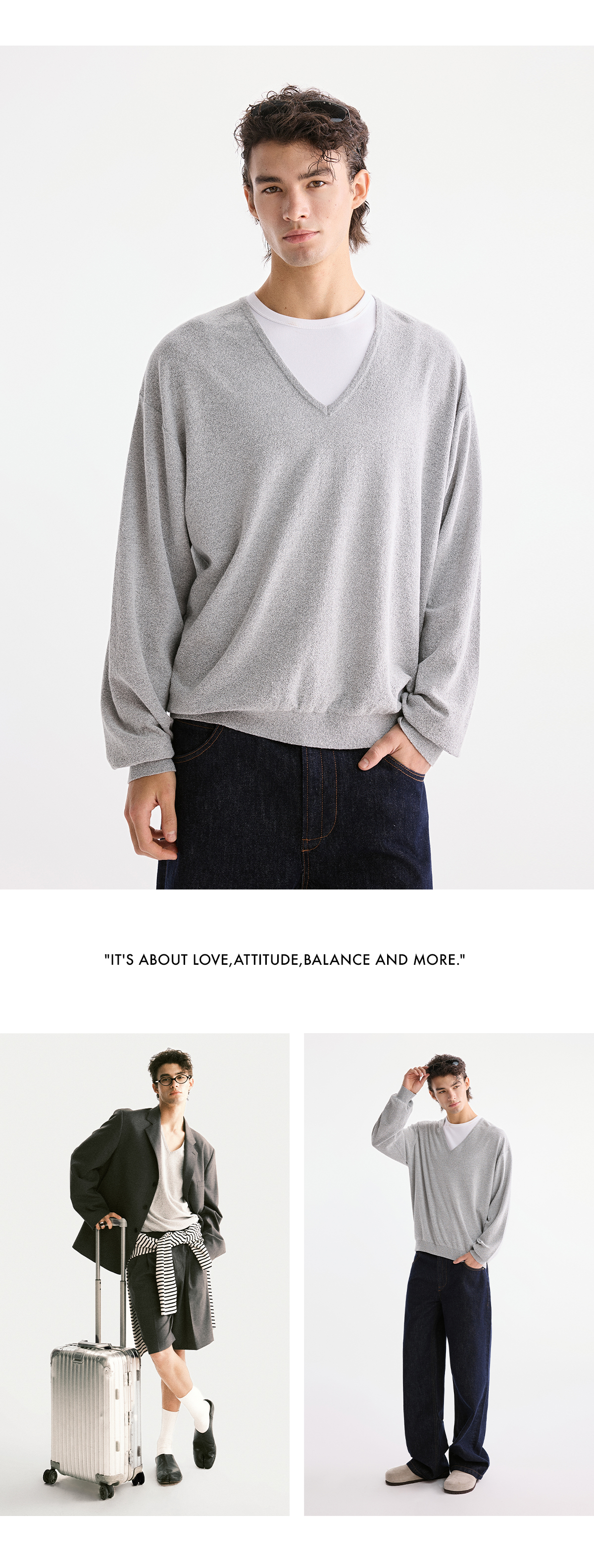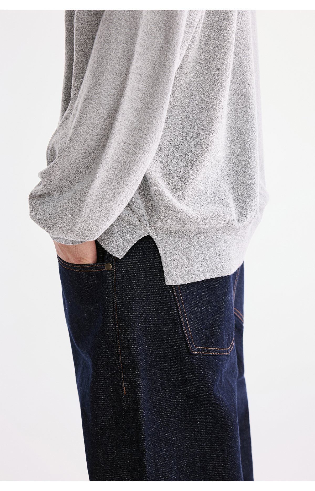 棉仓3621001001-【北海泡沫】浅花灰圈圈肌理深V领型编织长袖T