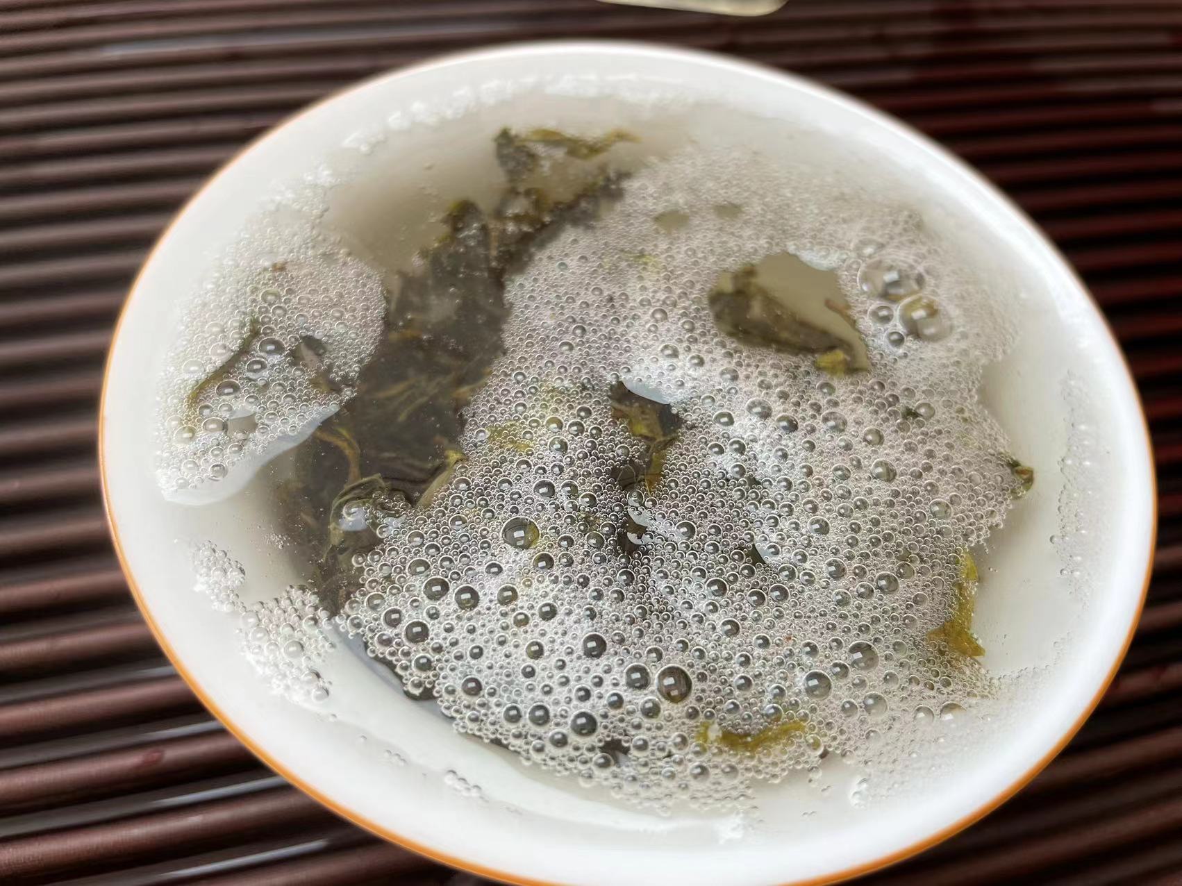 茶皂素有点多,泡泡细小且密集,这个是因为:茶叶表面茶毫比较多、比较细小、且内涵物质丰富,同时在开水的注冲下产生的,刮掉即可。