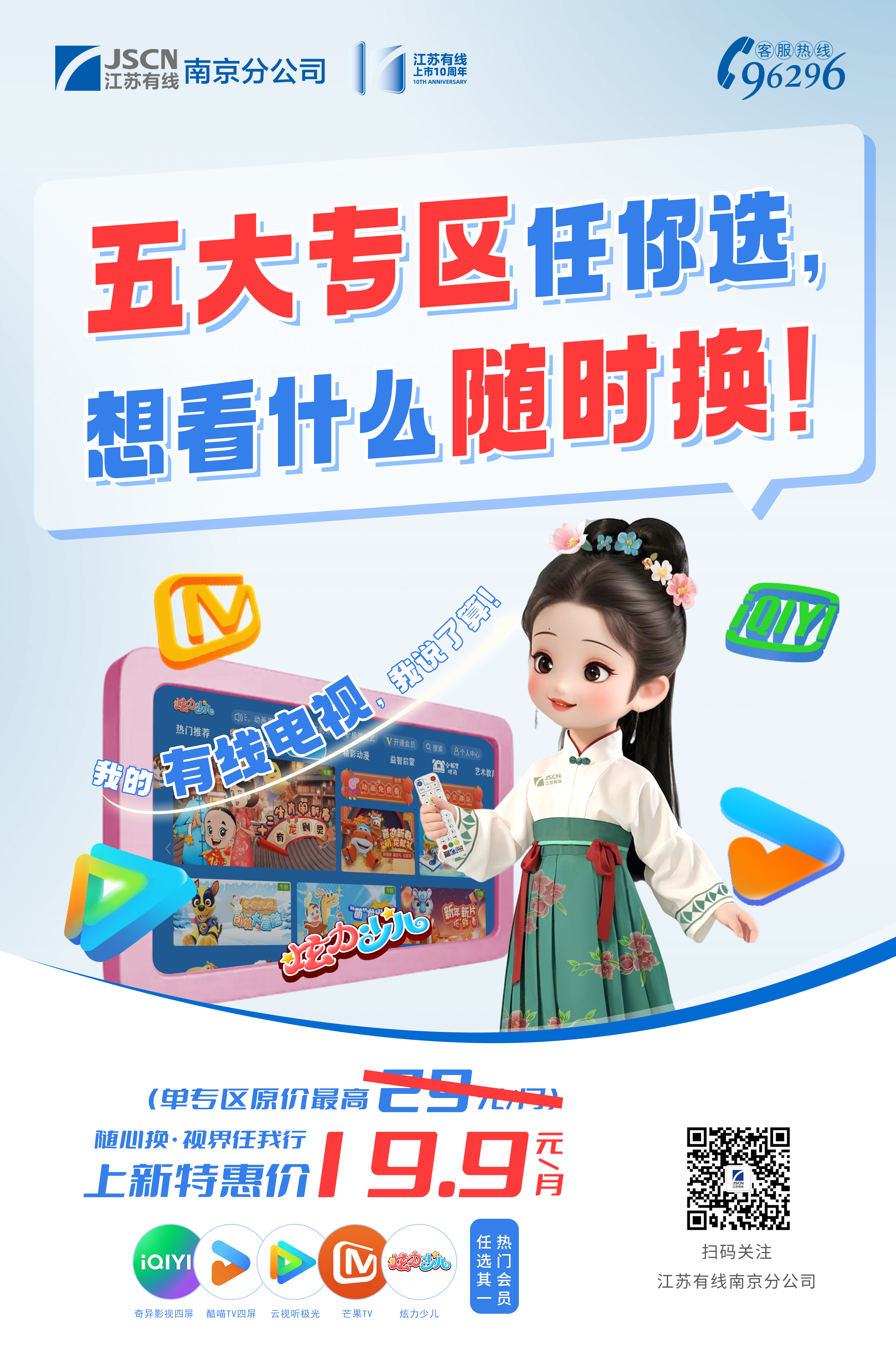 奇异影视四屏、酷喵四屏、 云视听极光大屏、芒果 TV、炫力少儿五大视频会员,每月随心换。