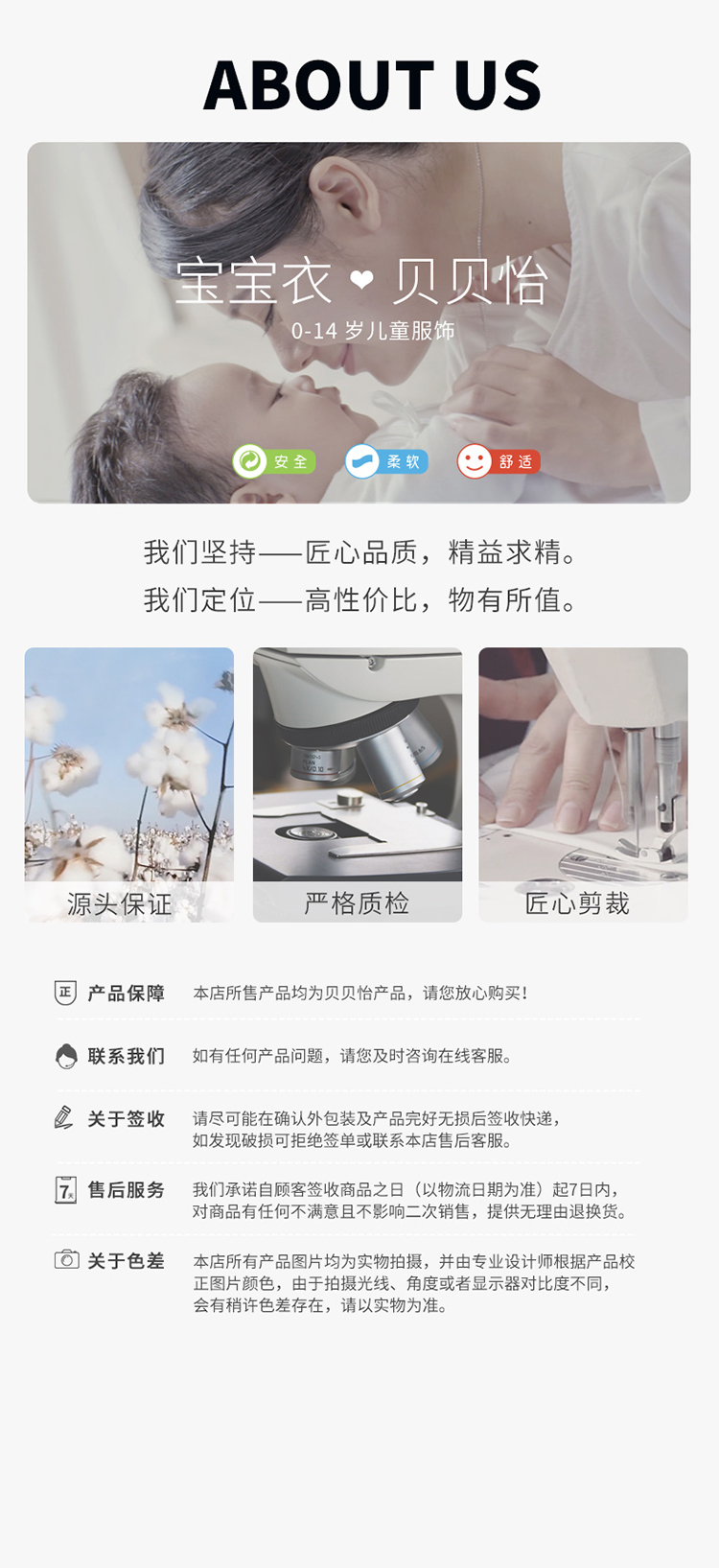 - 贝贝怡专注0-6岁婴幼儿服饰,坚持安全、柔软、舒适的产品理念,为千万中国家庭提供超高品质、安全可靠的婴幼儿服饰产品,妈妈放心,宝宝开心!