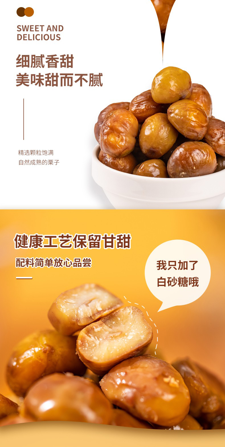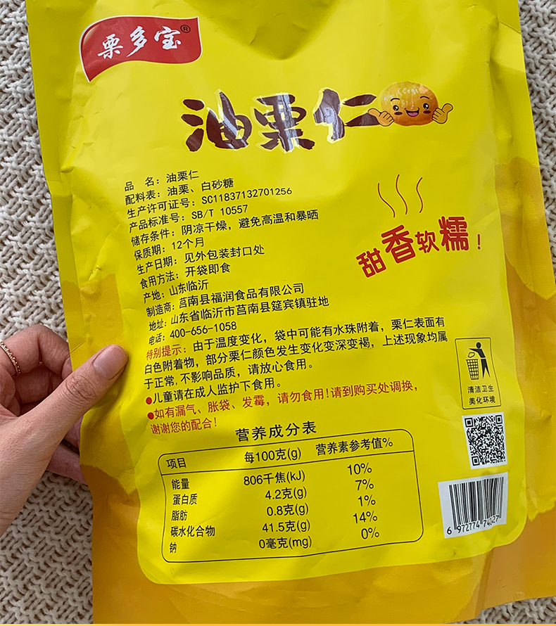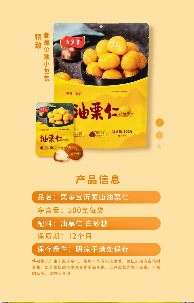 由于温度变化,袋中可能有水珠附着,栗仁表面有白色附着物,部分栗仁颜色发生变化变深变褐,上述现象均属于正常,不影响品质,请放心食用