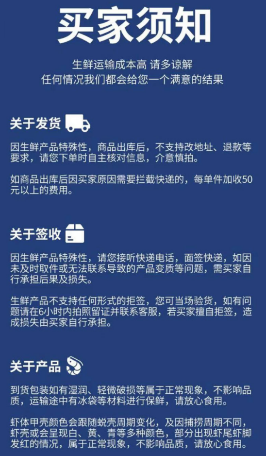 | 【品名】海鑫怡 厄瓜多尔进口白虾 【规格】2030(净重1.4kg/份 内含38-45只虾) 3040(净重1.4kg/份 内含42-60只虾) 【产地】厄瓜多尔 【保质期】24个月 【发货包装】独立包装箱 【发货地】山东,天津 【发货快递】顺丰 【不发货区域】 四川省 攀枝花市 四川省 凉山彝族自治州 四川省 甘孜藏族自治州 四川省 阿坝藏族羌族自治州 内蒙古自治区 呼伦贝尔市 内蒙古自治区 阿拉善盟 贵州省 黔西南布依族苗族自治州 广西壮族自治区 新疆,西藏,青海,甘肃,黑龙江,云南,海南,港澳台 【发货时效】48-72小时,周末节假日顺延 |