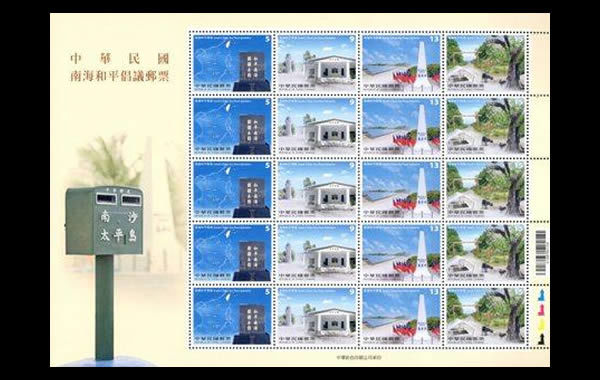 四枚邮票面值分别为新台币5元、9元、13元和15元,邮票展示了南海四沙群岛分布略图,前景为太平岛码头整建纪念碑。透过太平岛上“和平南海,国疆永固”的铭文,藉期盼以和平手段解决南海争端。