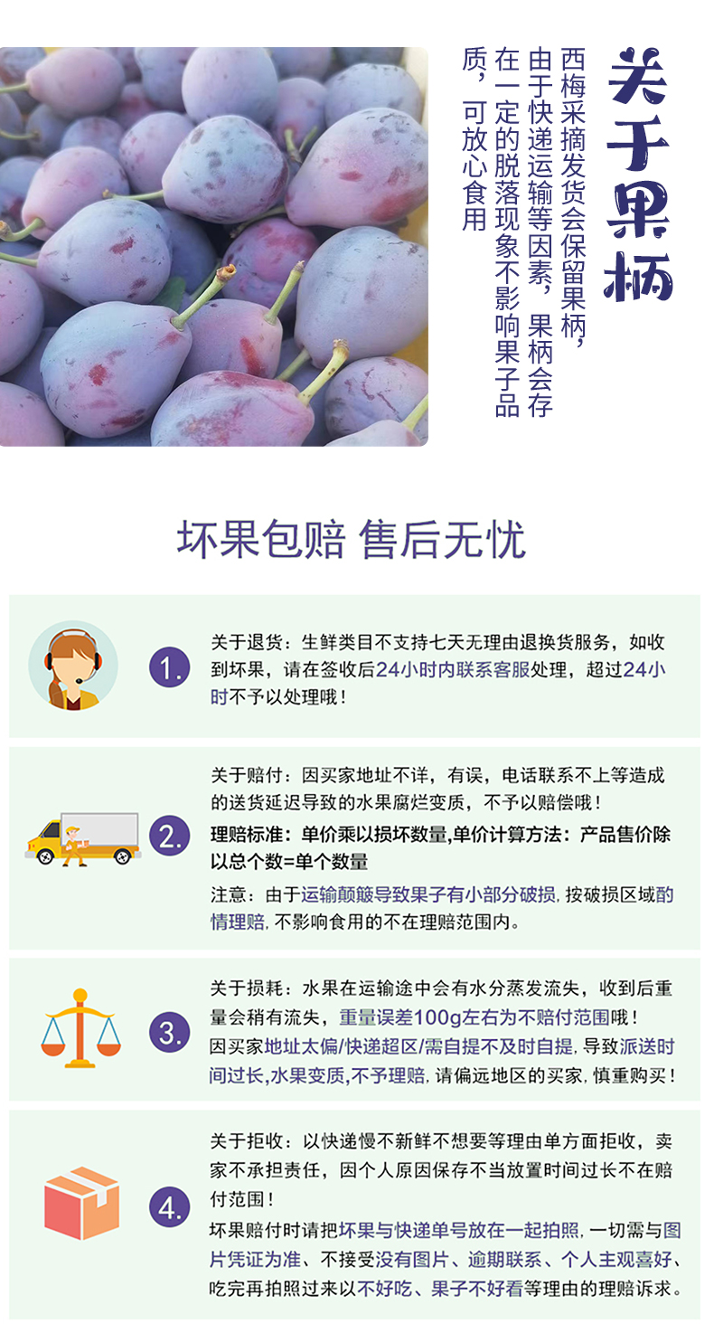 3、生鲜产品请及时签收,如有坏果,请在快递送达的24小时内拍照,并反馈给客服(将所有坏果放在一起拍照);