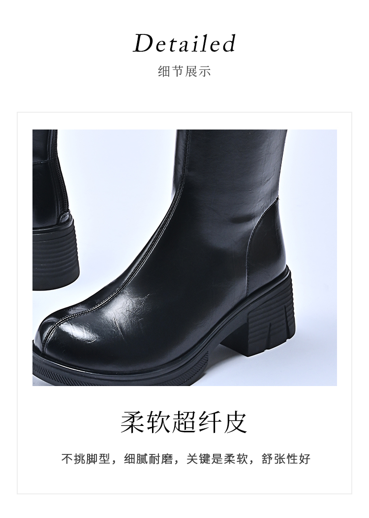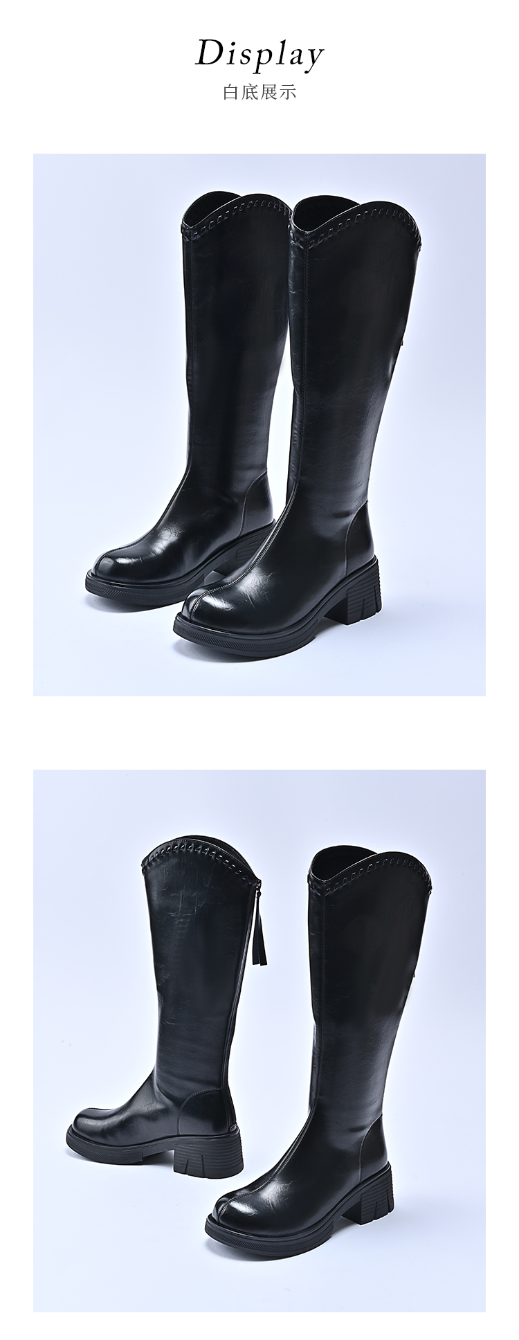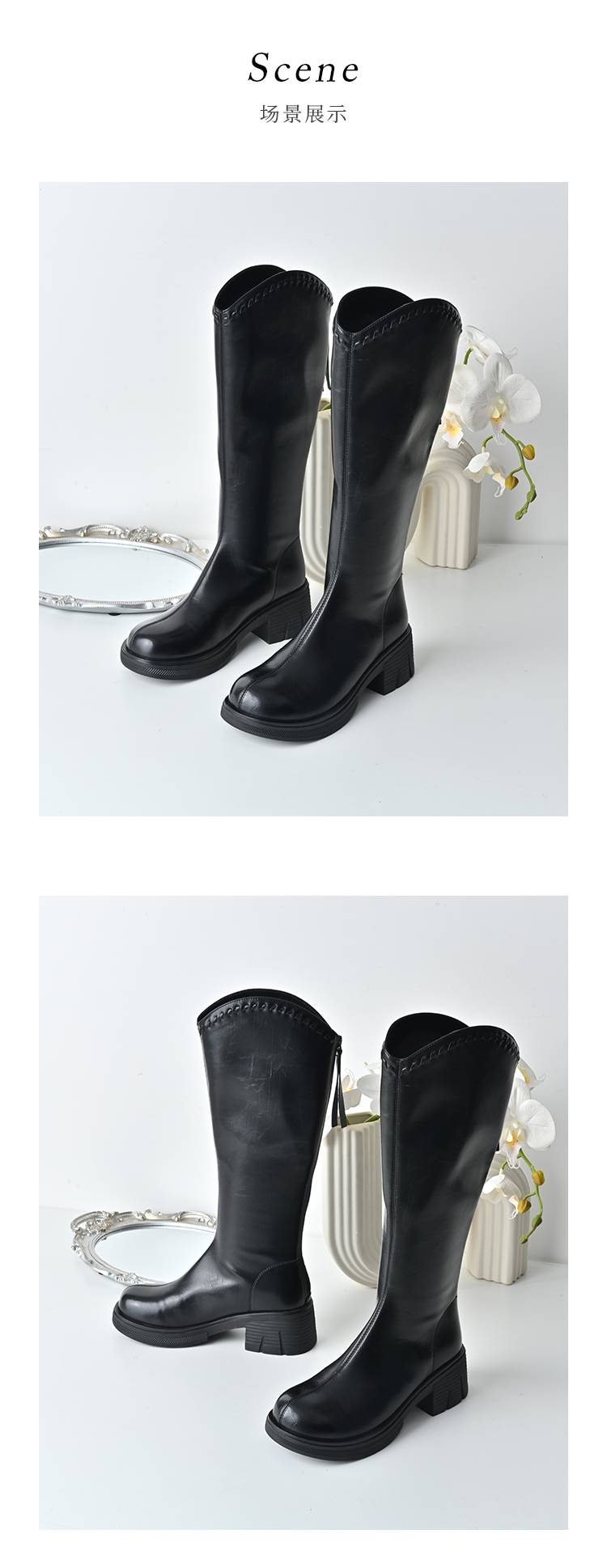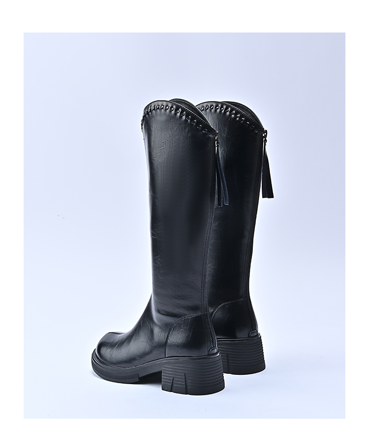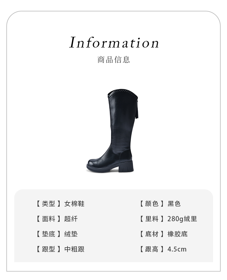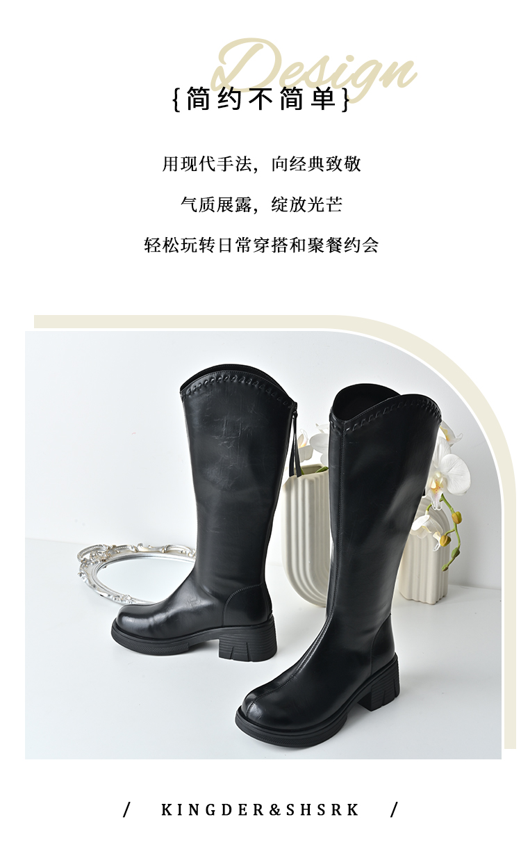 经典鲨2025冬季专柜新品百搭圆头加绒中粗跟后拉链长筒靴女KW87-558131