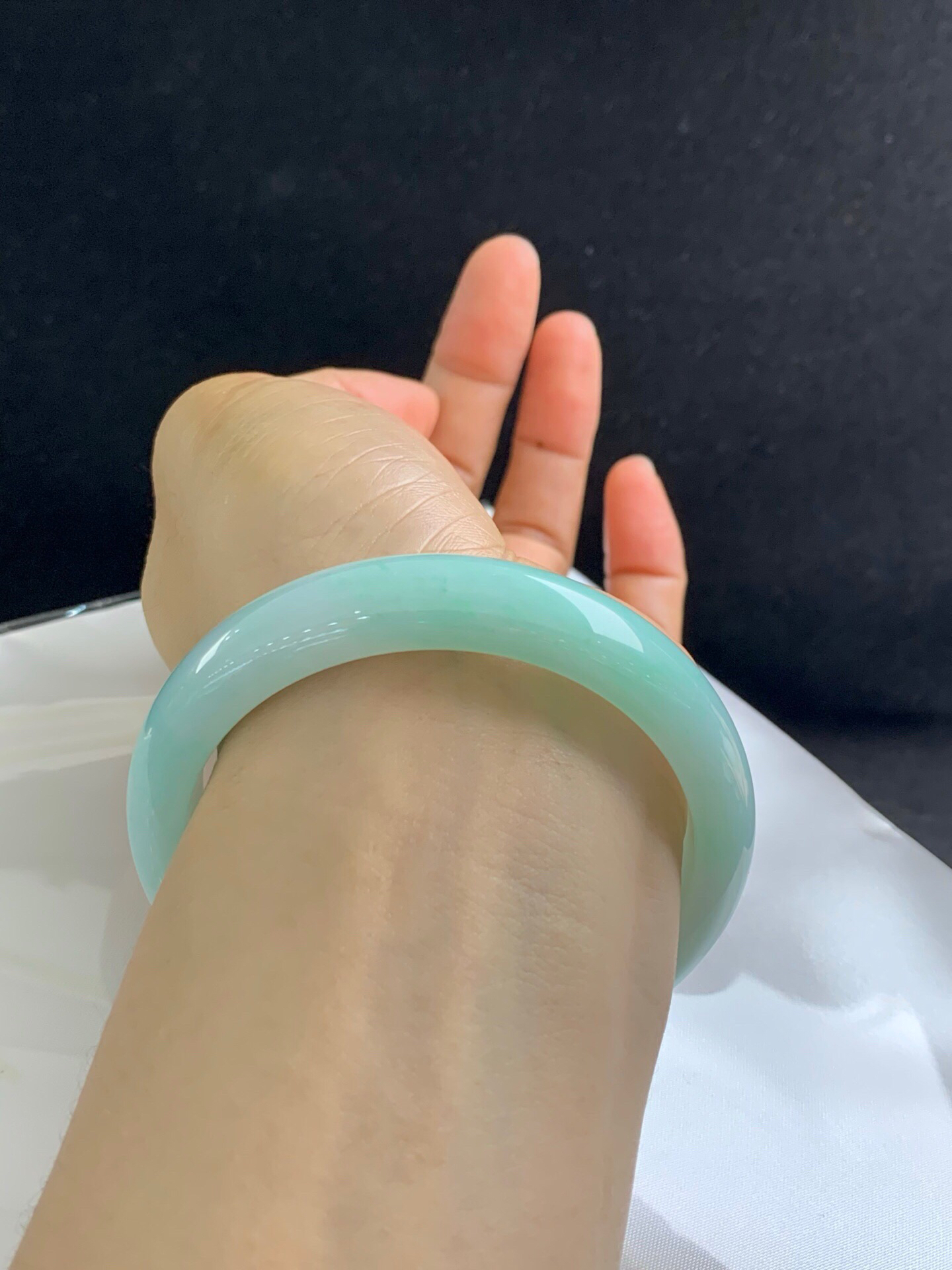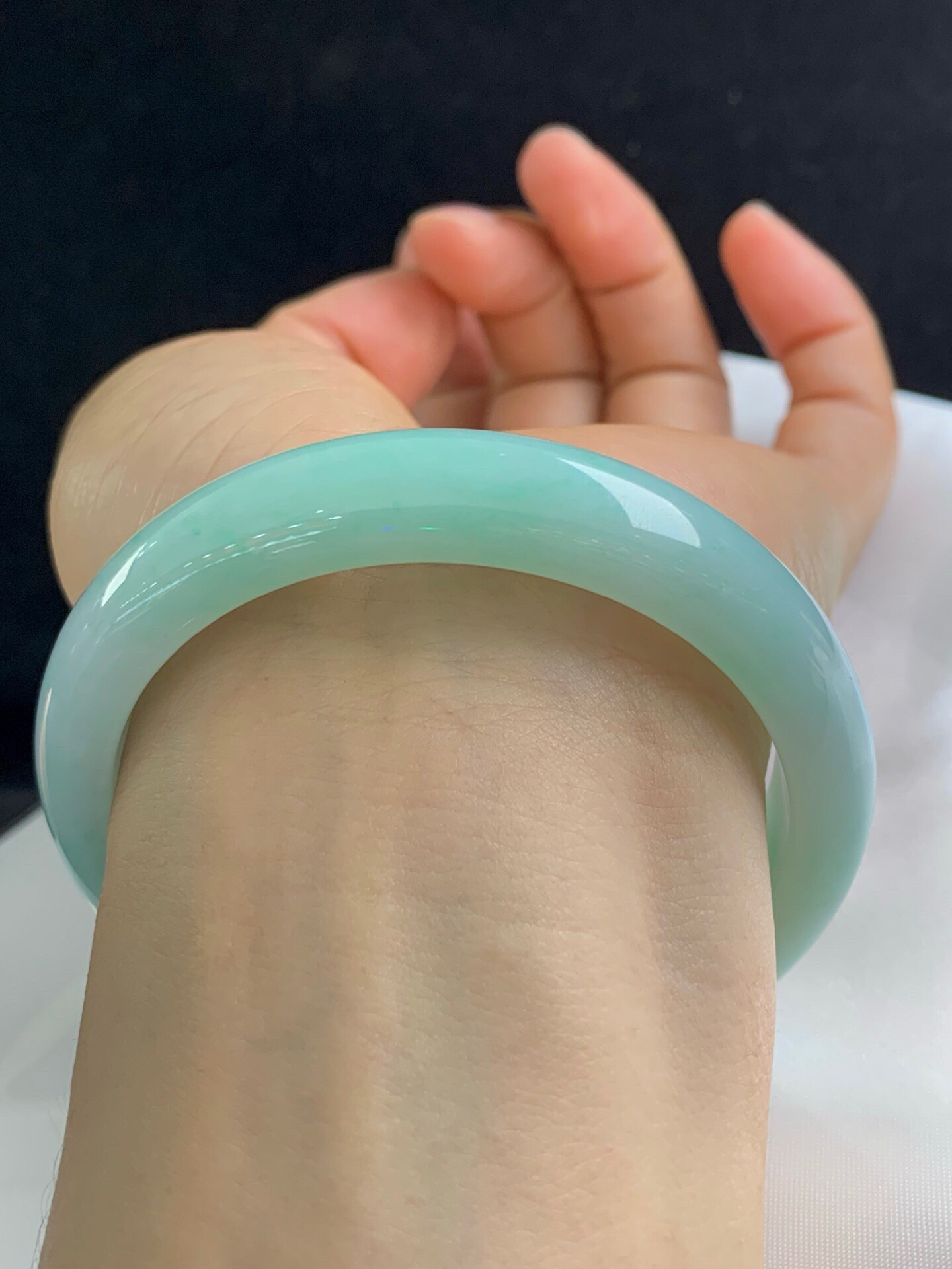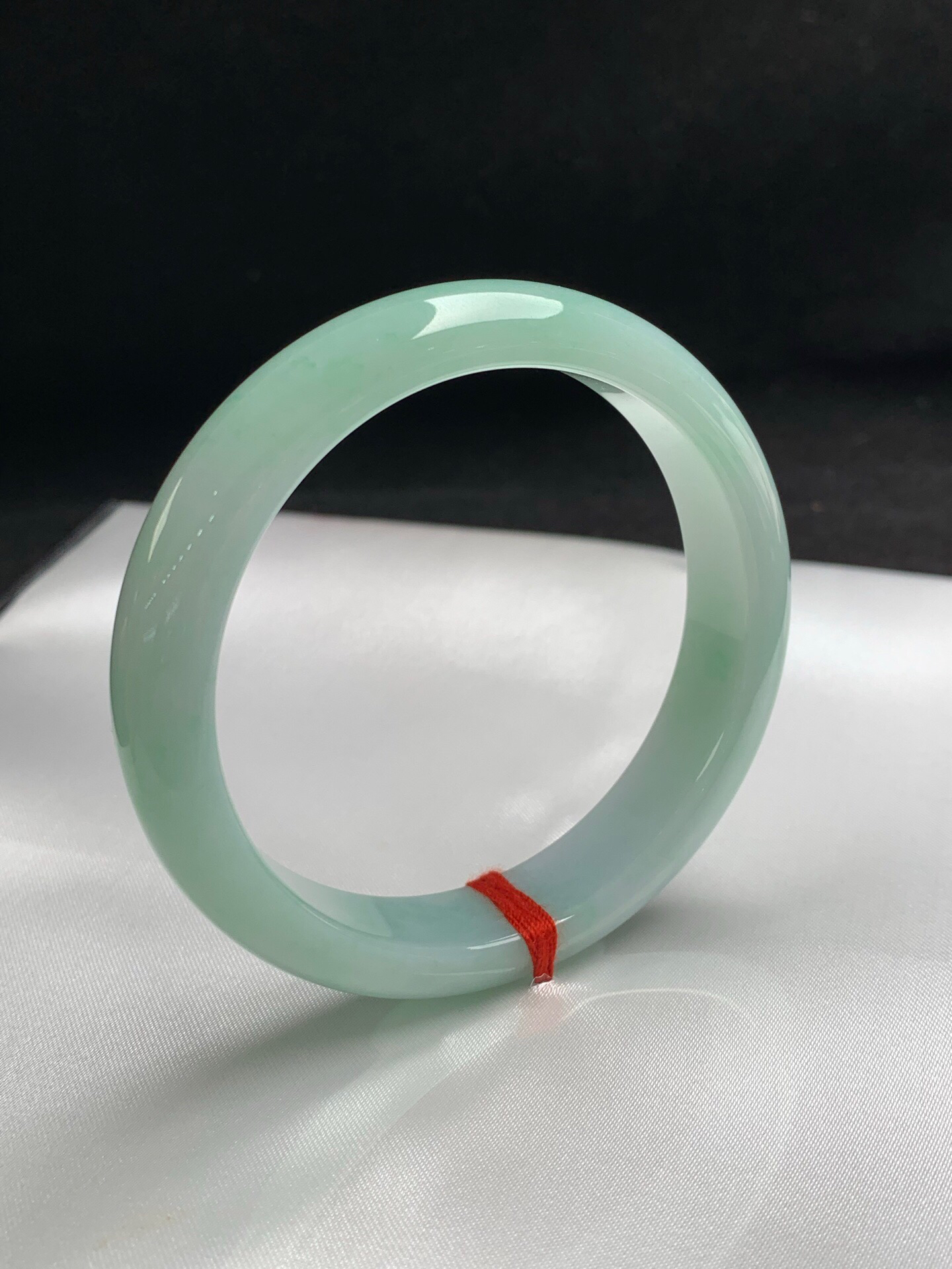 620726,56.3飘绿圆条手镯。12.5mm,条形好,整条带浅绿底,干净清爽,完美的