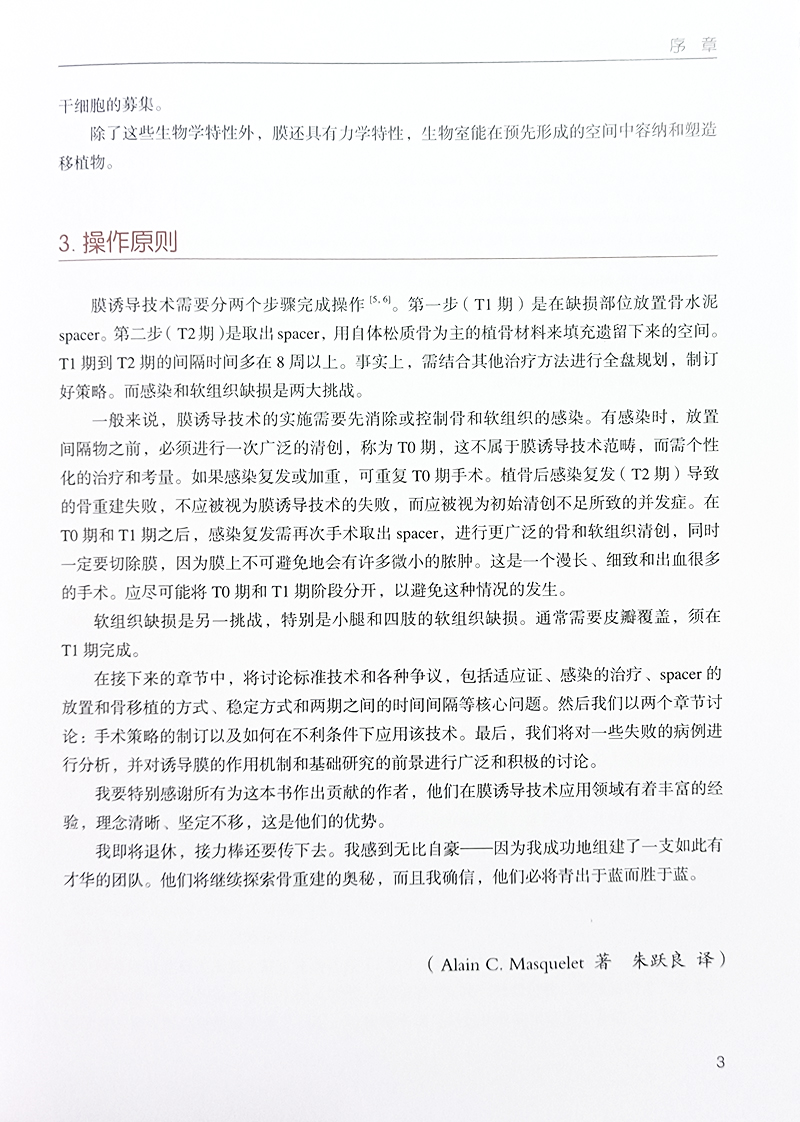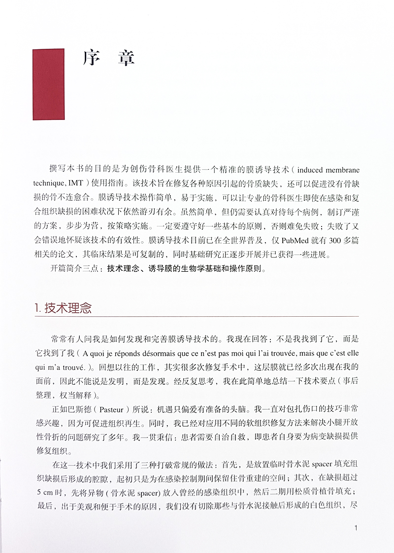 膜诱导技术的产生是骨缺损领域相关技术发展的结果,而发现、命名、深入研究、规范应用则是Masquelet先生的巨大历史贡献——这一技术的广泛应用对骨缺损难题的解决有重大推动作用。作为该技术原创者,在本书中,Masquelet先生对既往应用经验、教训、研究成果进行了系统的归纳总结,并为未来发展指明了方向。书中详尽阐述了该技术的由来、实施方法以及卓有成效的治疗实践。从手术指征到每个环节的技术细节,本书仿佛手把手、面对面地讲授知识和技术。非常有利于读者学习、掌握该项技术。
