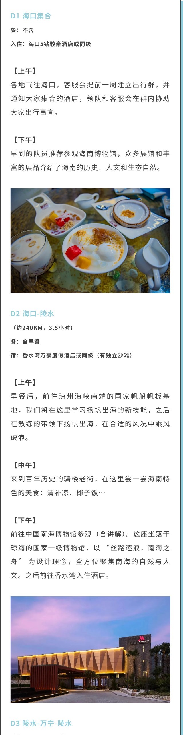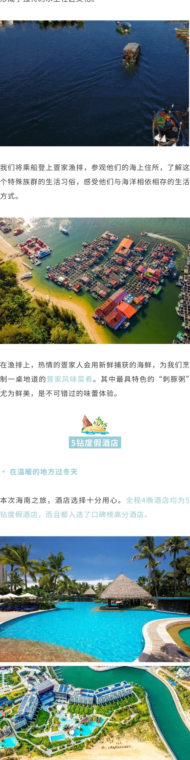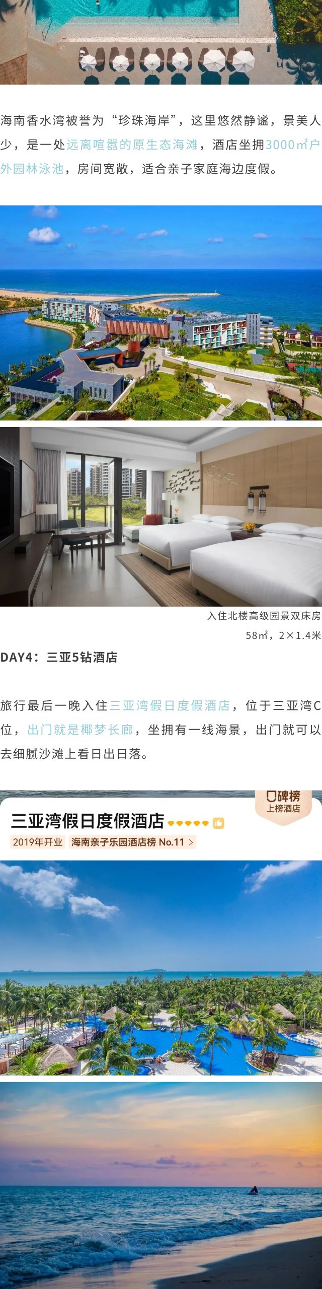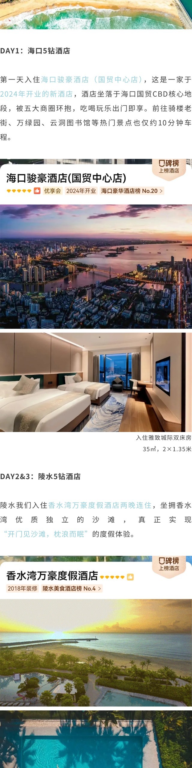 全程4晚住宿:海口5钻1晚, 香水湾5钻2晚, 三亚5钻1晚。