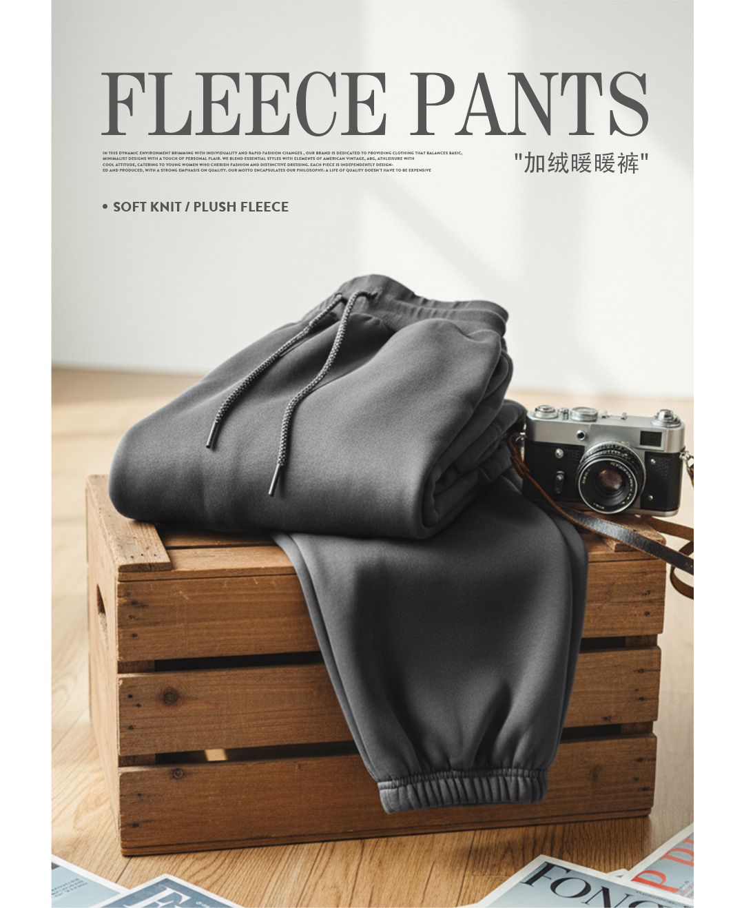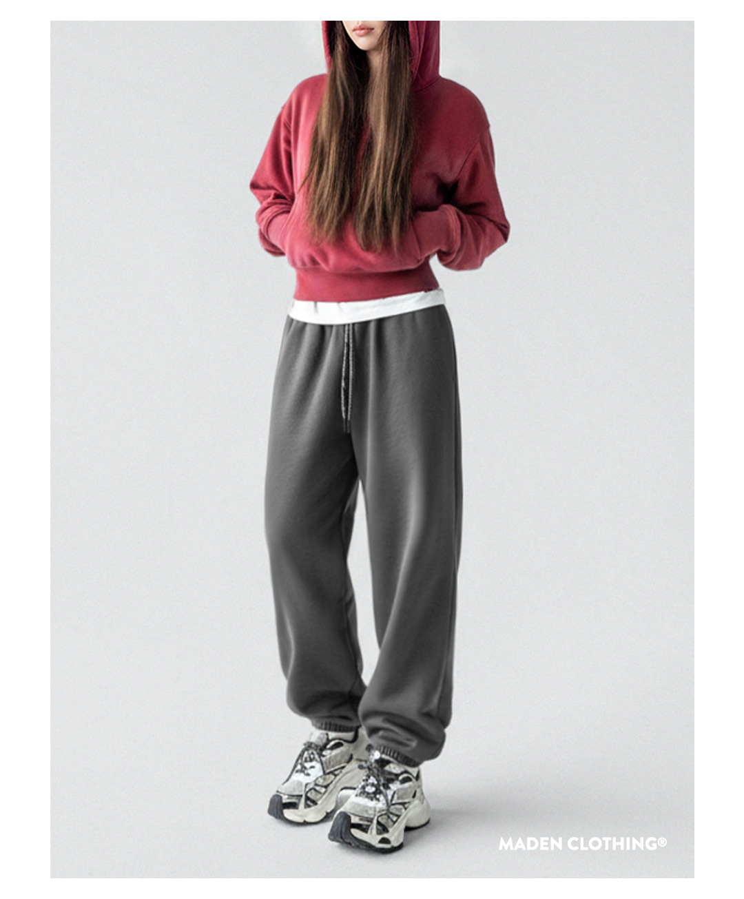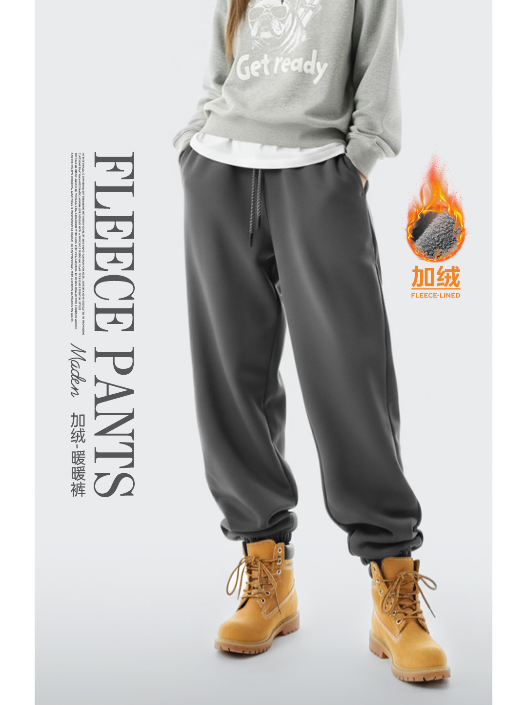 马登深灰色针织加绒厚保暖卫裤抽绳收口束脚休闲直筒长裤子女士冬