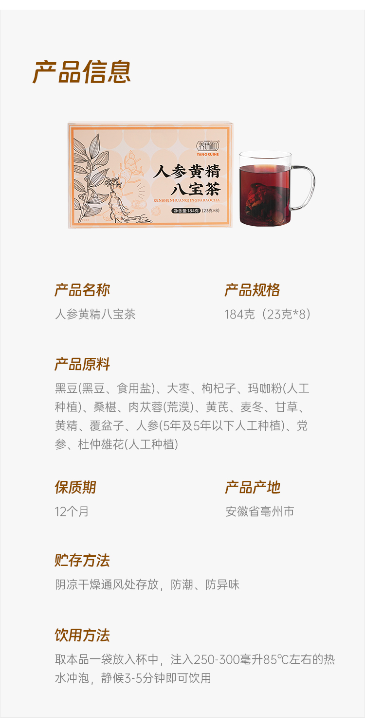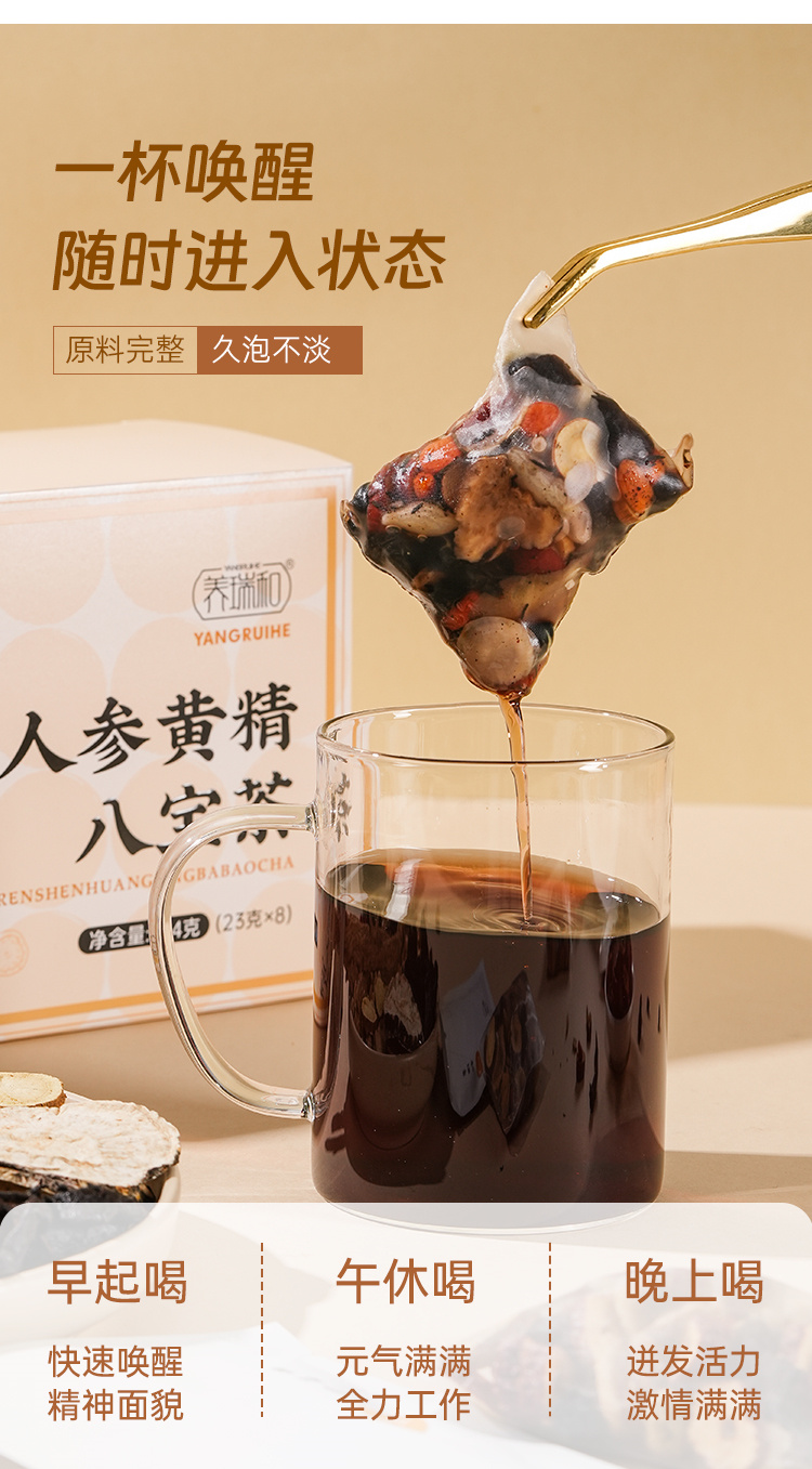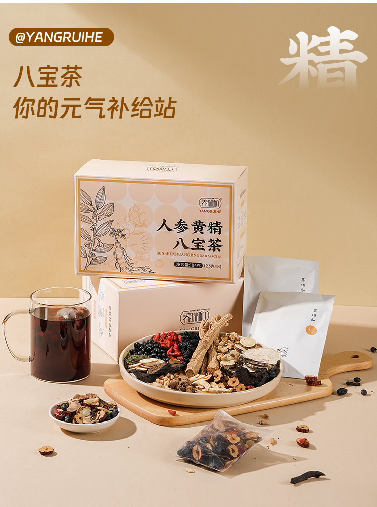 养瑞和丨人参黄精八宝茶184克·23g*8包·大容量四角包·元气满满·人参·黄精·桑椹·肉苁蓉·黄芪·麦冬·甘草·党参·覆盆子