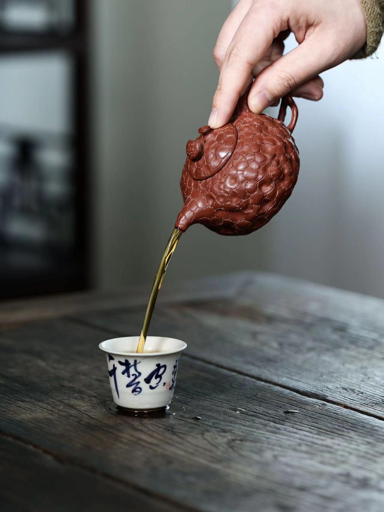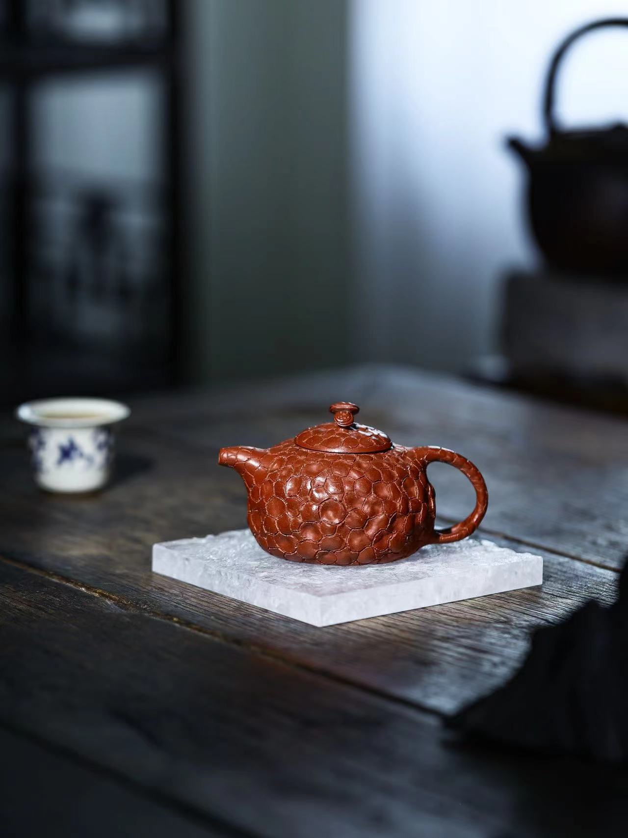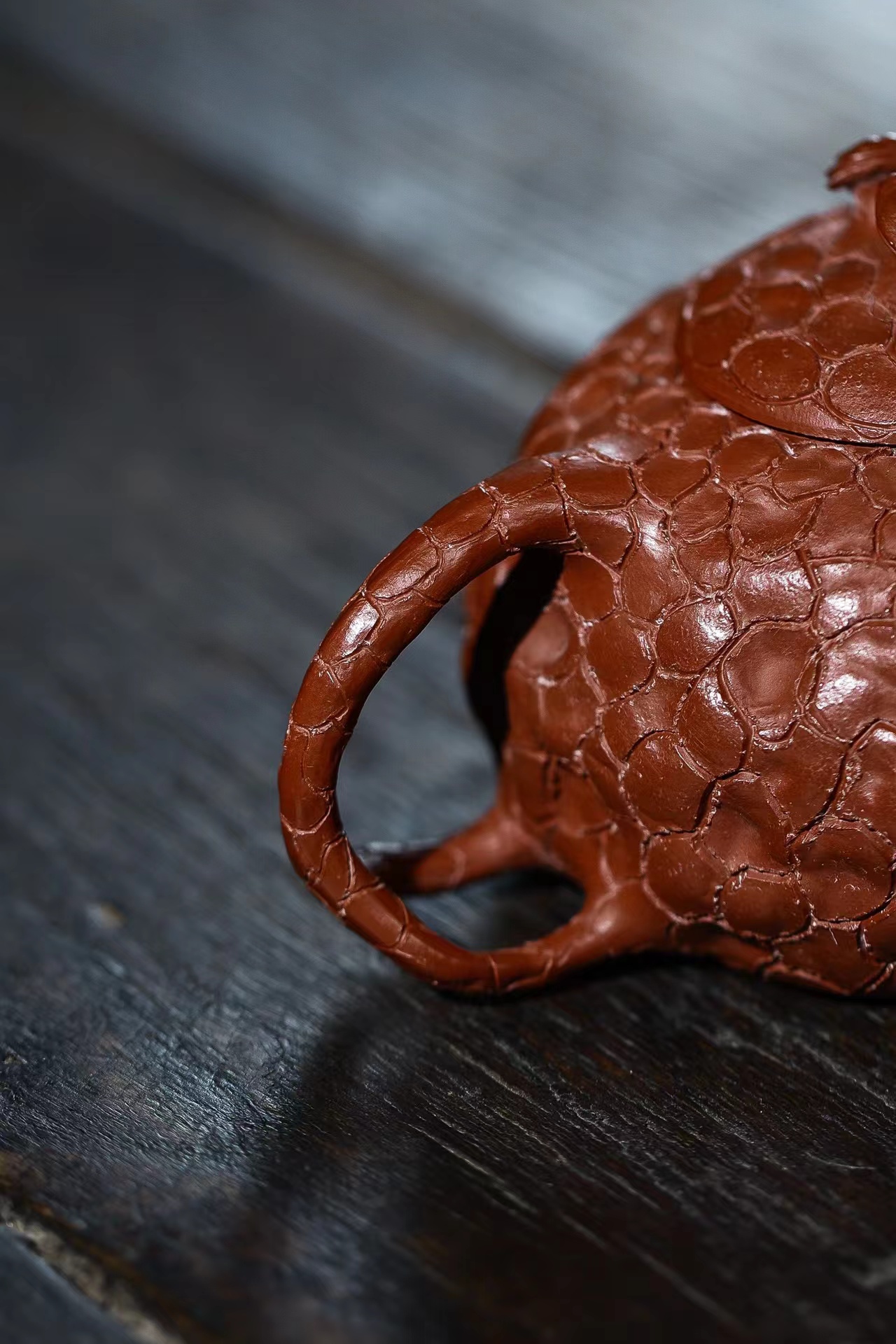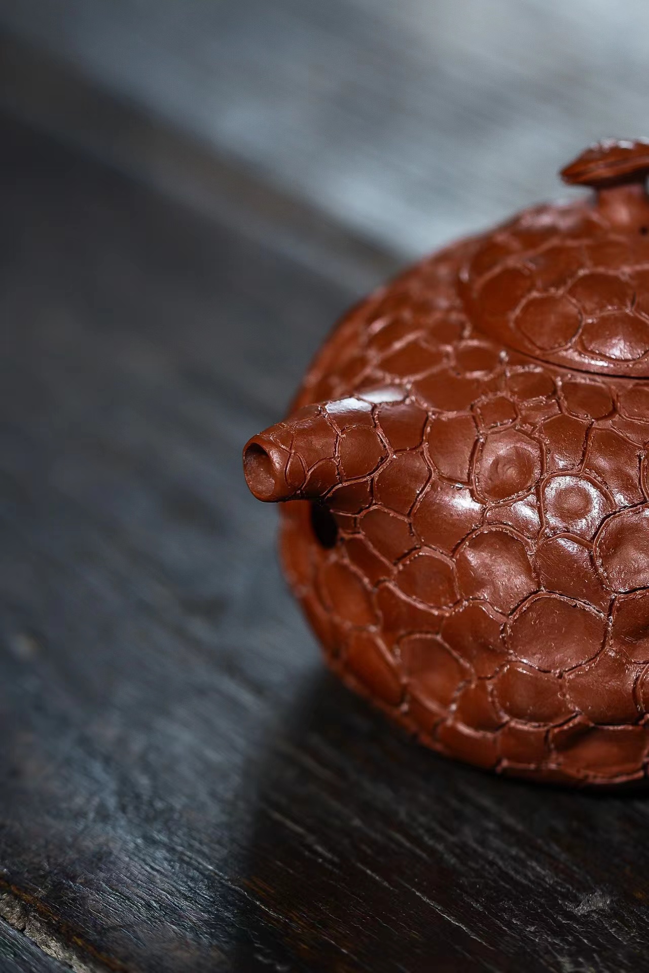 这一款精品紫砂壶,收藏送礼都是很不错的。优质稀缺的大红袍朱泥,颜色红润,油性足,日常把玩泡养很快就能出包浆,褶皱感明显。国家高级工艺师王文浩是紫砂壶王寅春的传人,深得真传,对于器型把控、细节处理都非常之到位。