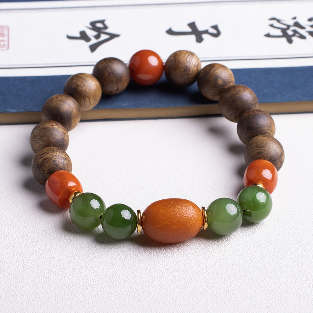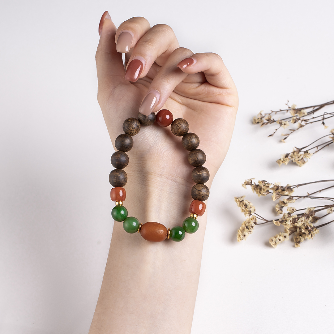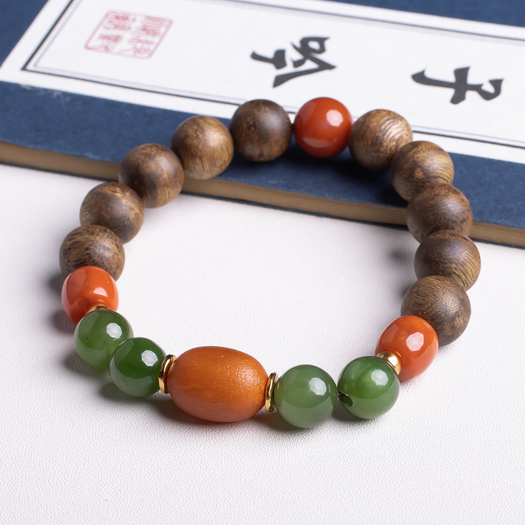 xy0407沉香+老蜜蜡南红碧玉手串.银,天然沉香约10.3mm,原色原味,香味自然清甜,经典南红碧玉的红绿配色,再加一枚老蜜蜡枣珠,款式典雅大方,古色古香,韵味十足。