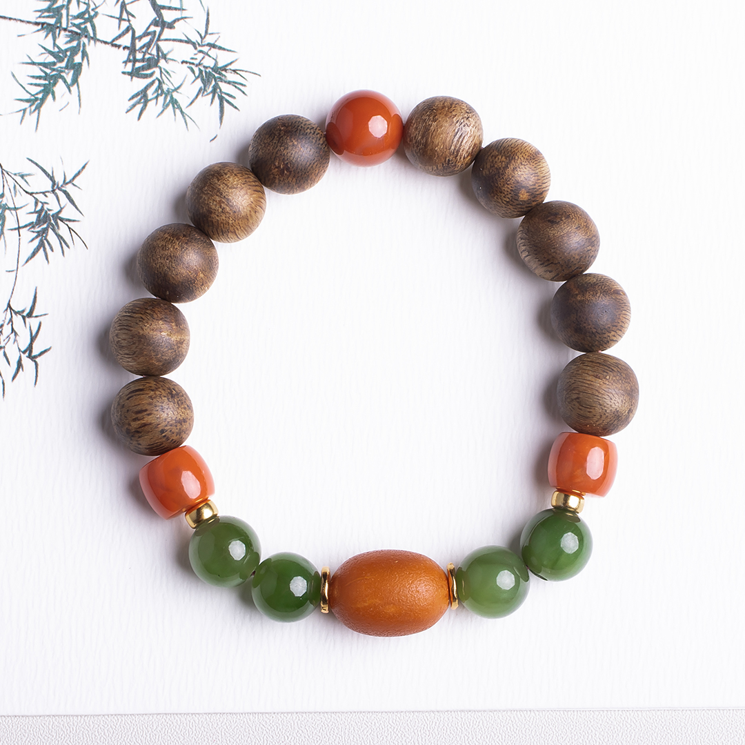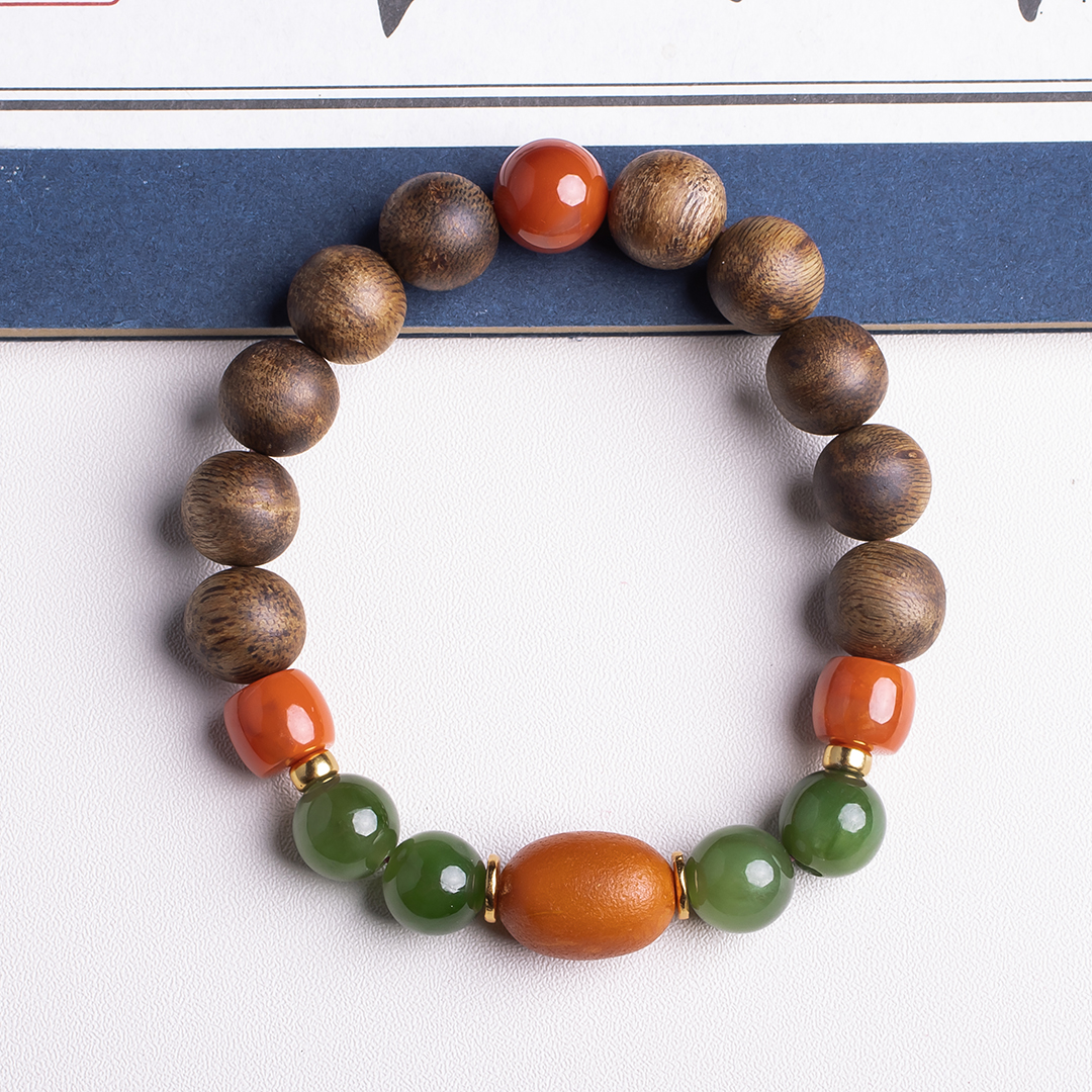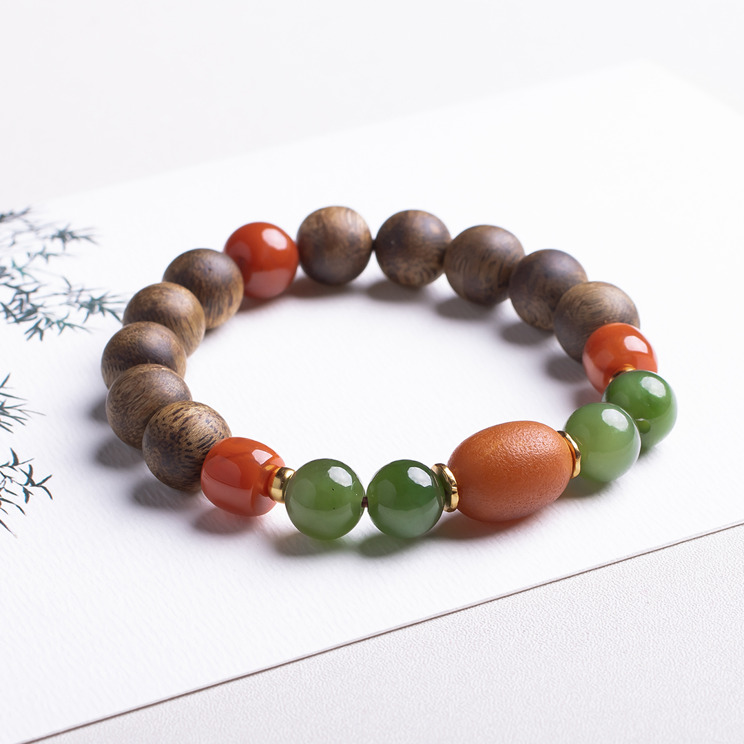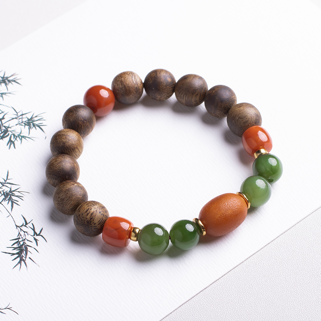 xy0407沉香+老蜜蜡南红碧玉手串.银,天然沉香约10.3mm,原色原味,香味自然清甜,经典南红碧玉的红绿配色,再加一枚老蜜蜡枣珠,款式典雅大方,古色古香,韵味十足。