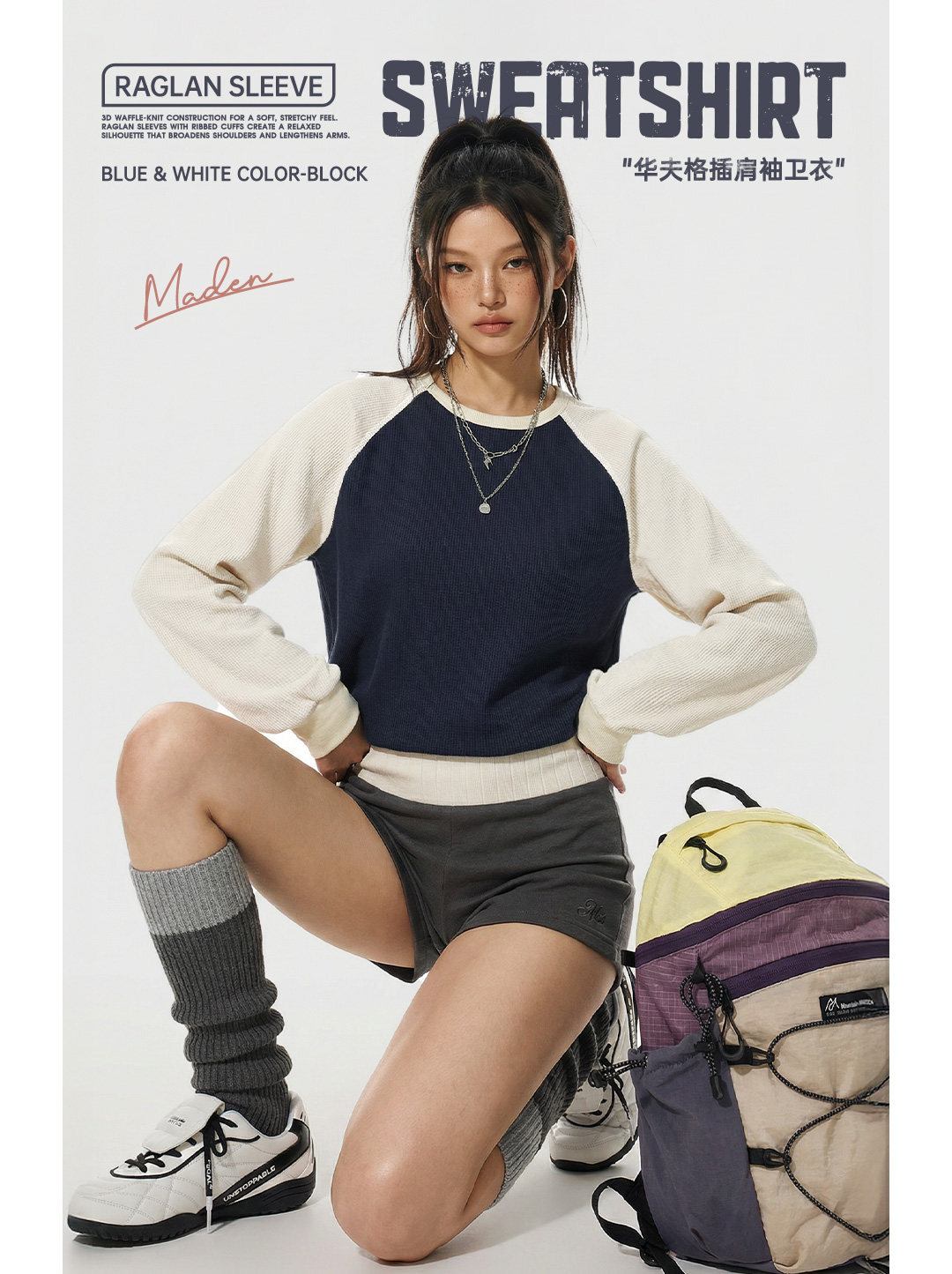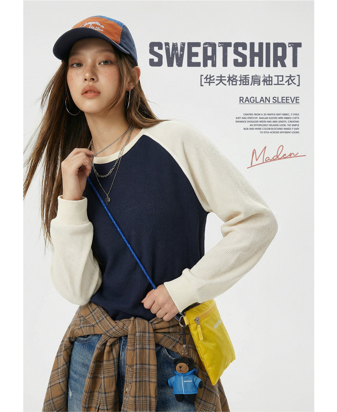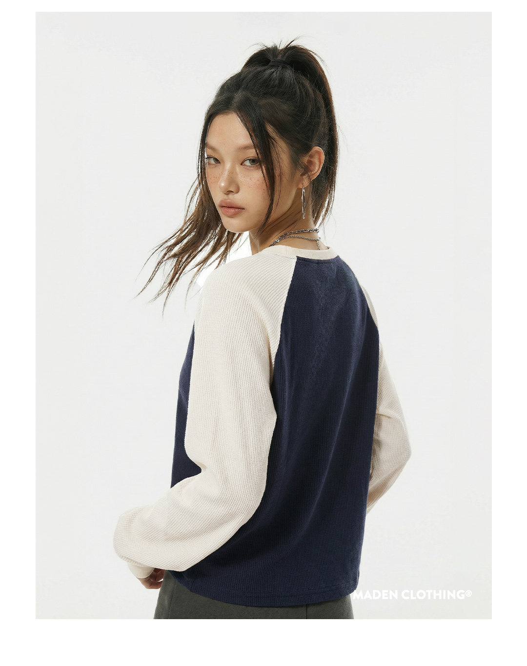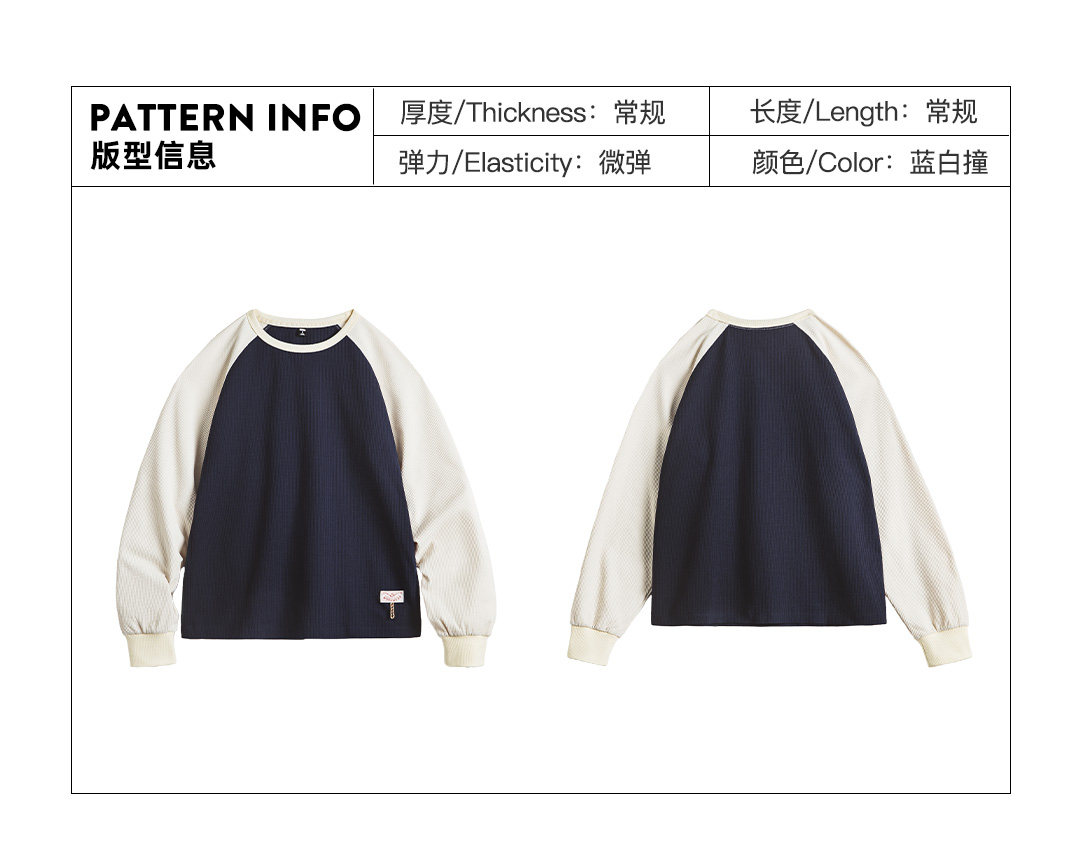 马登美式复古华夫格圆领蓝白撞色无帽长袖t恤打底衫内搭卫衣女春