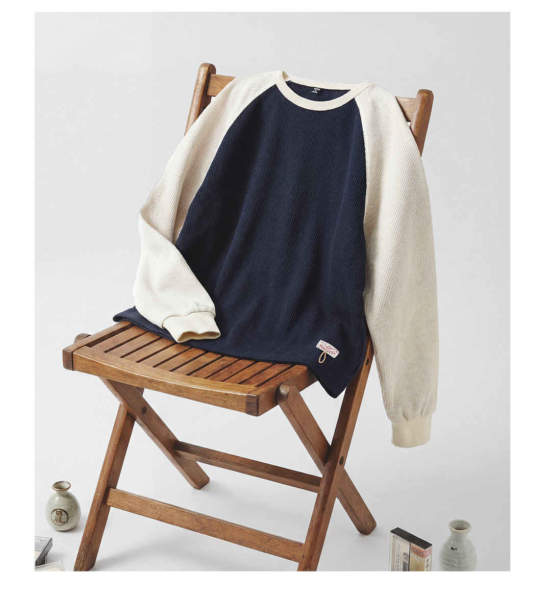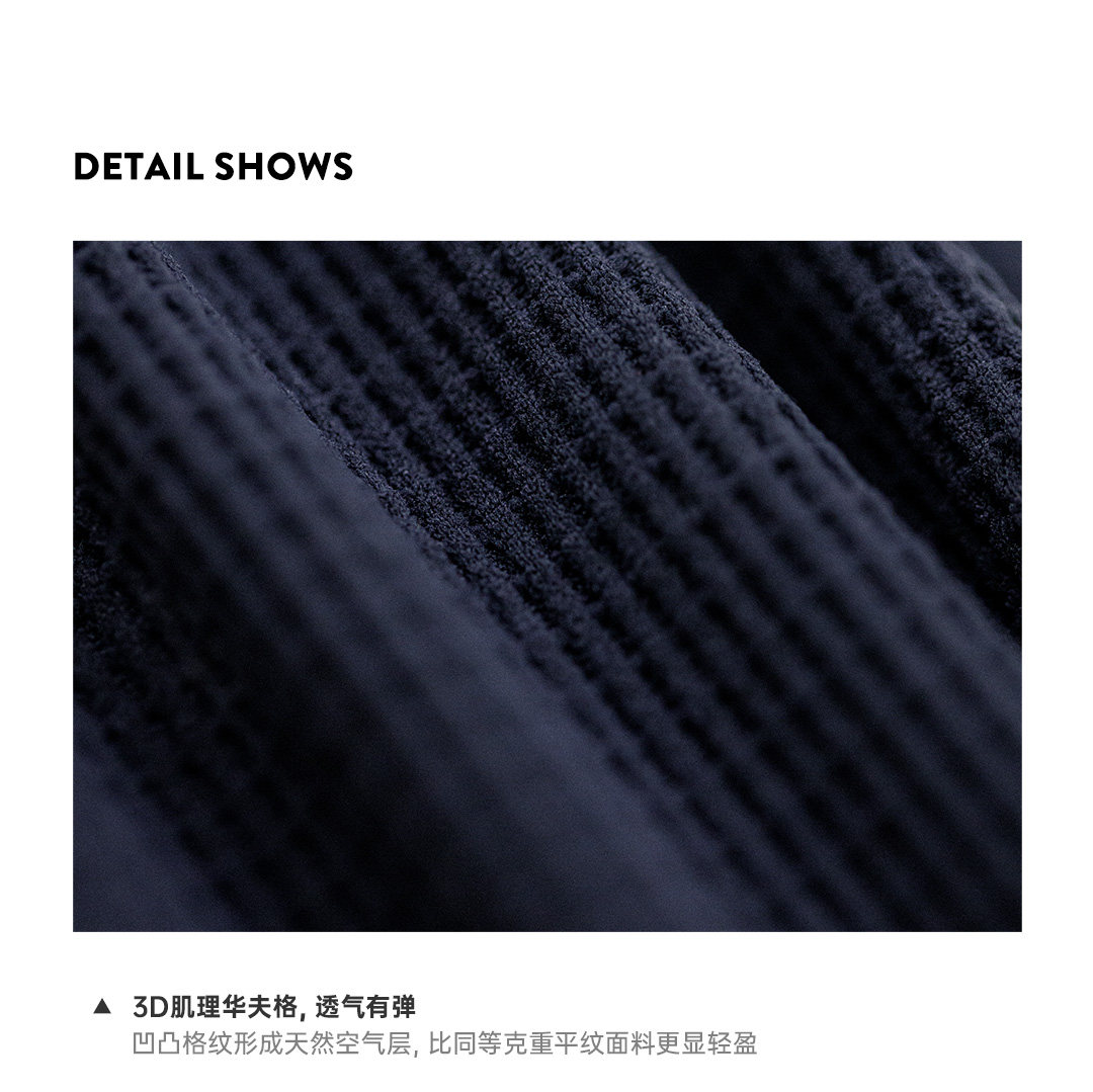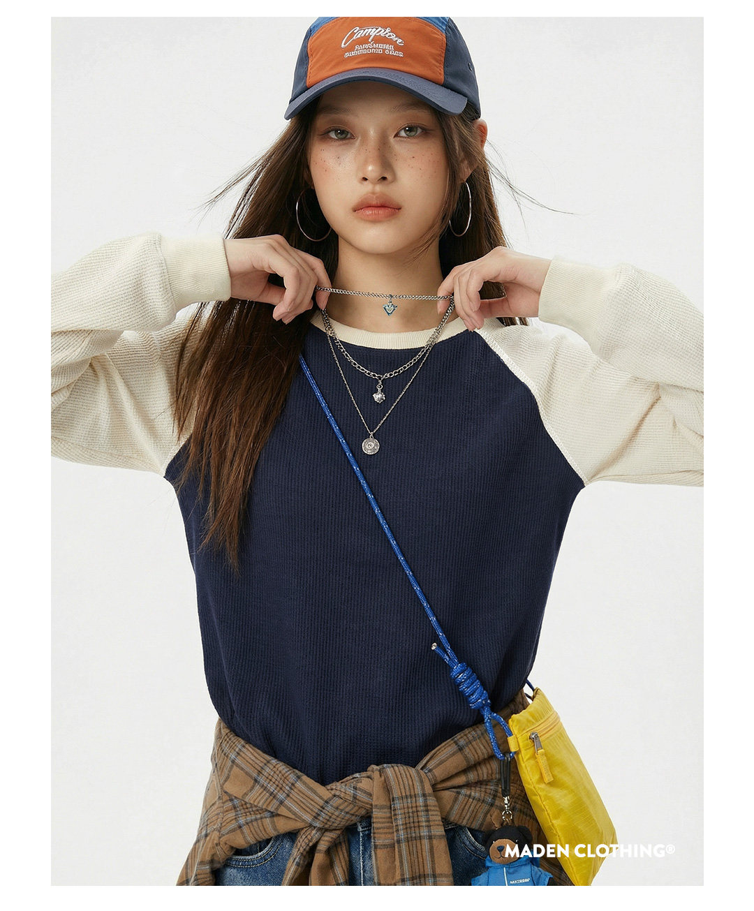 马登美式复古华夫格圆领蓝白撞色无帽长袖t恤打底衫内搭卫衣女春