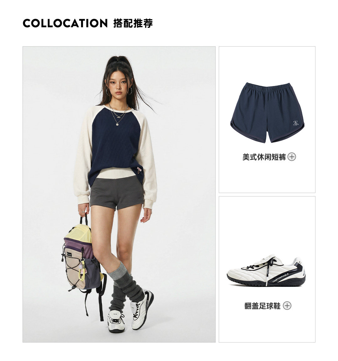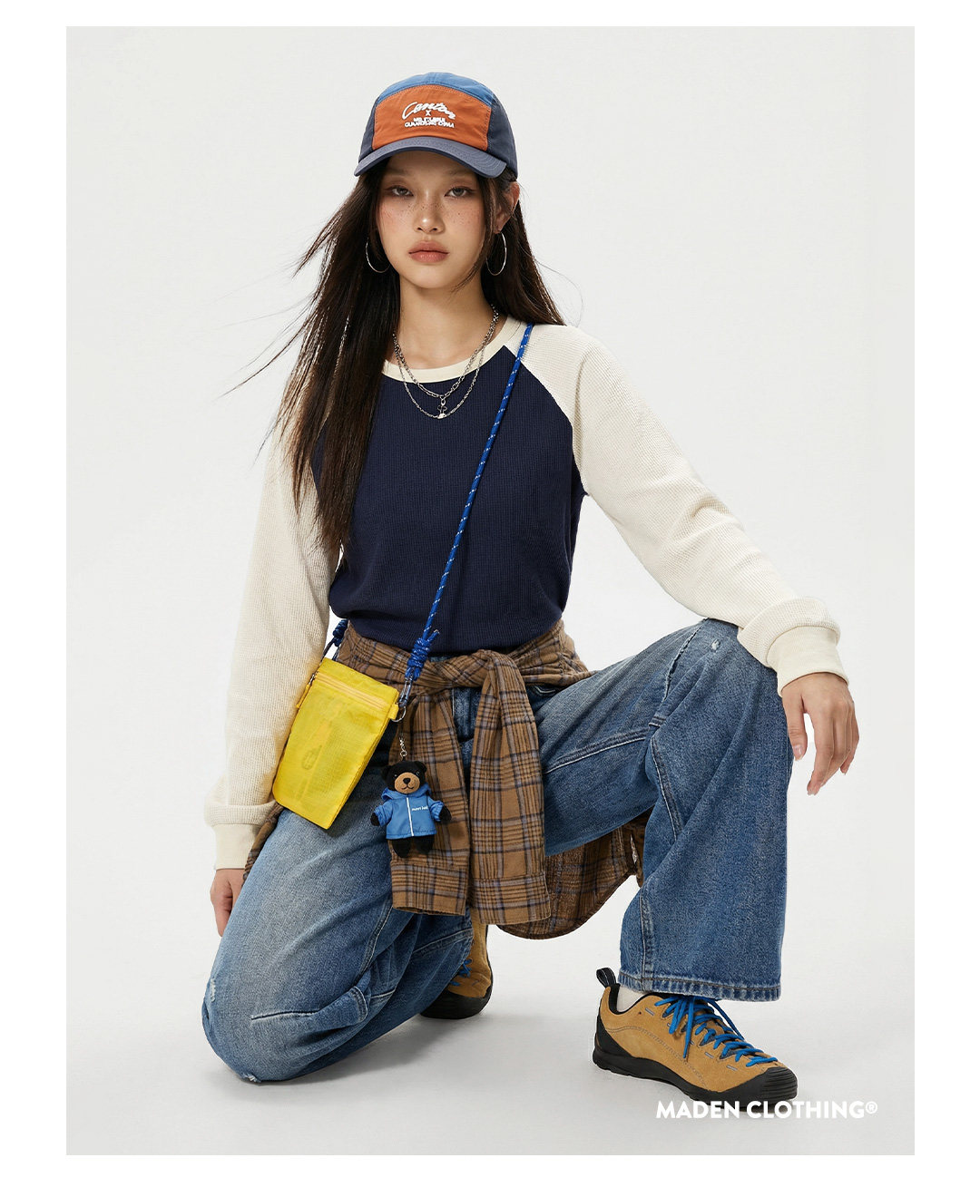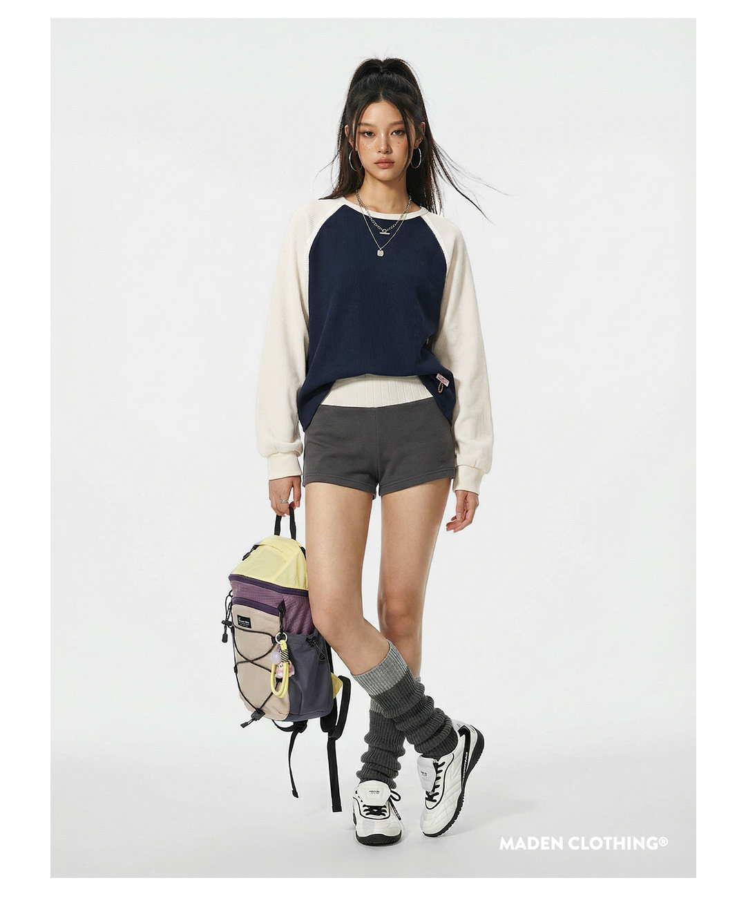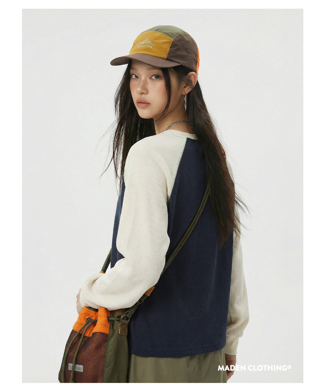 马登美式复古华夫格圆领蓝白撞色无帽长袖t恤打底衫内搭卫衣女春