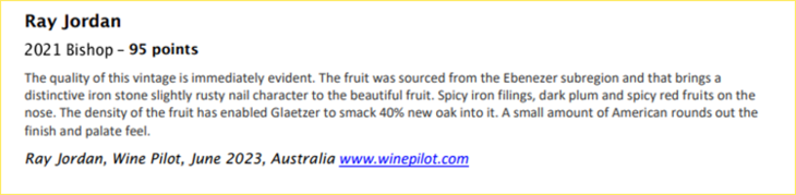 “复古的质量显而易见,葡萄来自埃比尼泽产区(Ebenezer),这些美丽的水果带来独特略微生锈的铁石特征,鼻尖上辛辣的铁味交织,深邃李子和辛辣红色水果,紧密的果味酱40%新橡木桶融合,少量的美国橡木桶清晰其饰面和口感。”