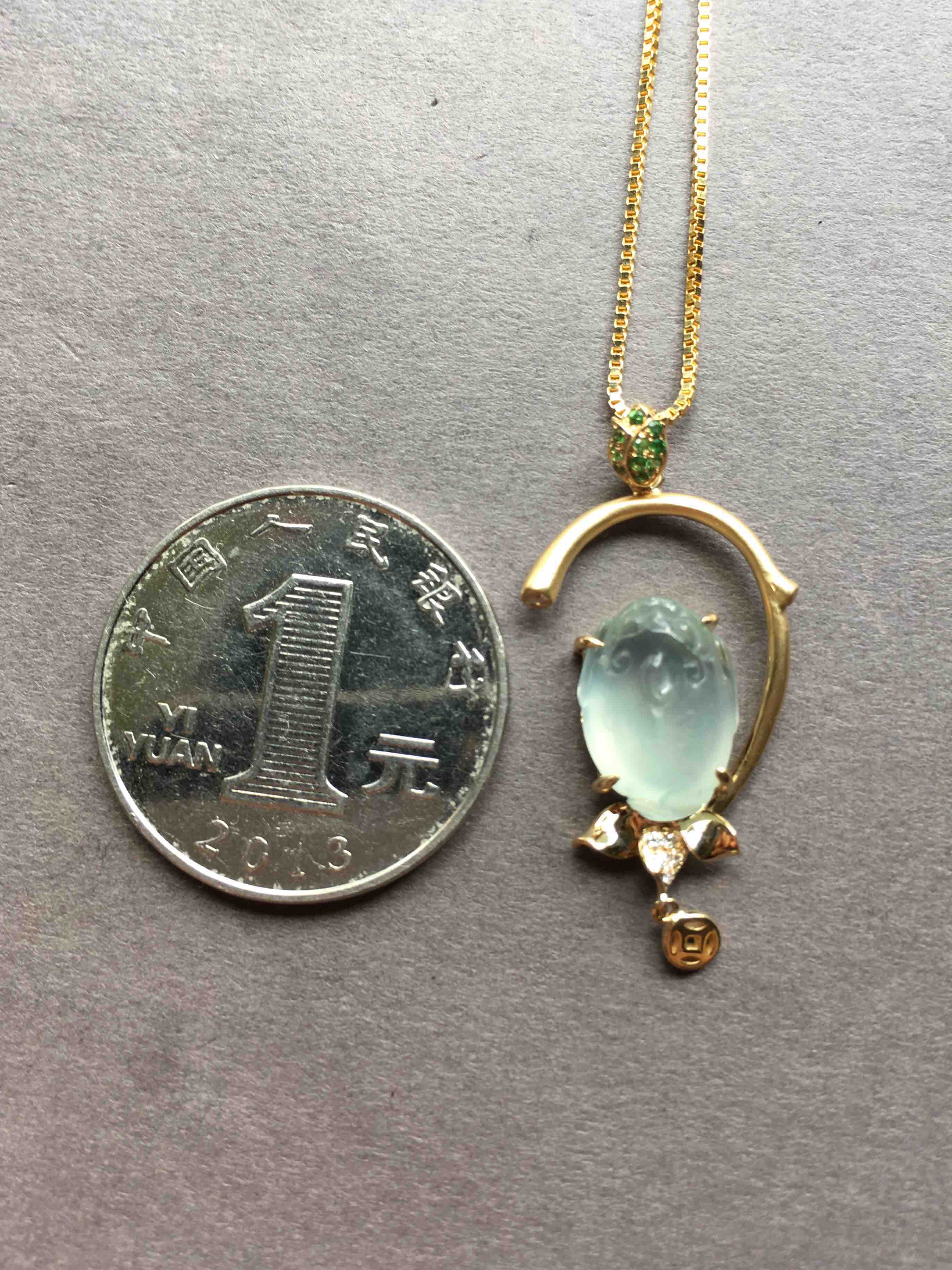 高冰种翡翠金蟾吊坠,12.8×9.1×5.8mm,镶嵌后33.8×16.2×6.1mm,翡翠禄来原创设计系列,荧光四射的种水,有玻璃种的感觉,18k黄金钻石镶嵌,点缀绿色沙弗莱扣头,时尚而又别致,小四价位不容错过