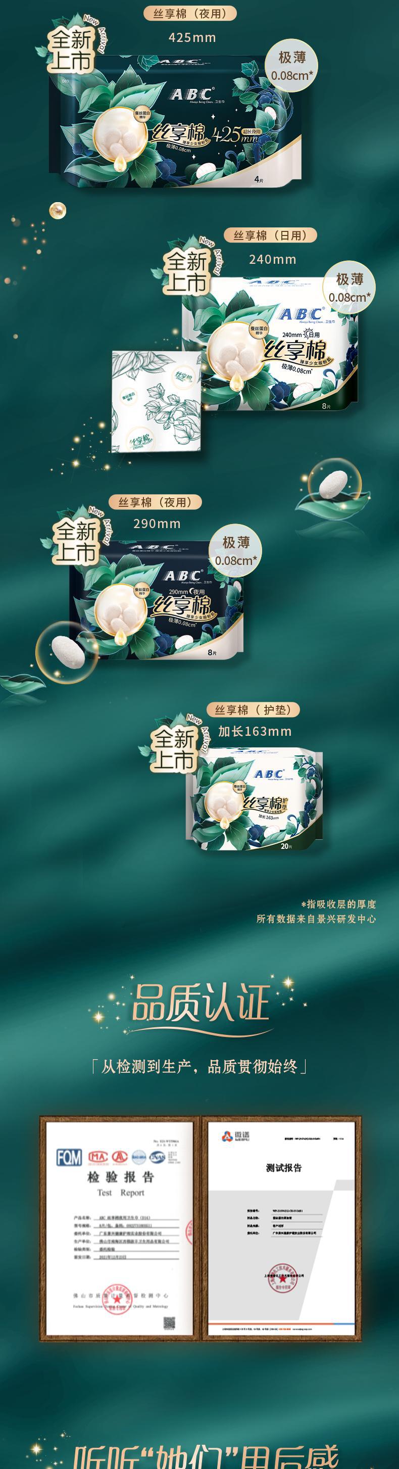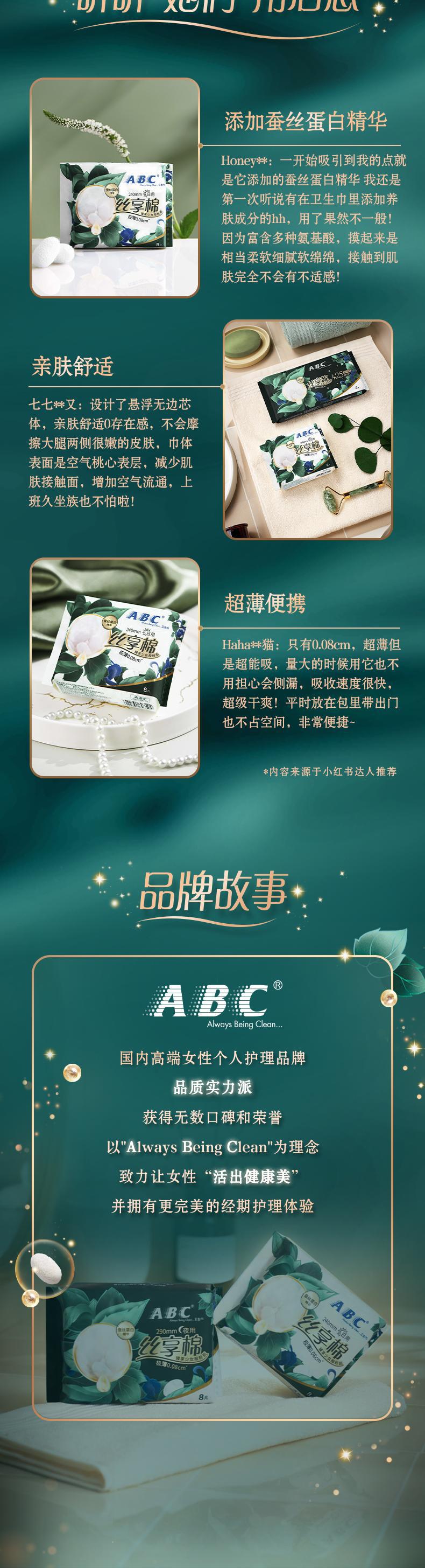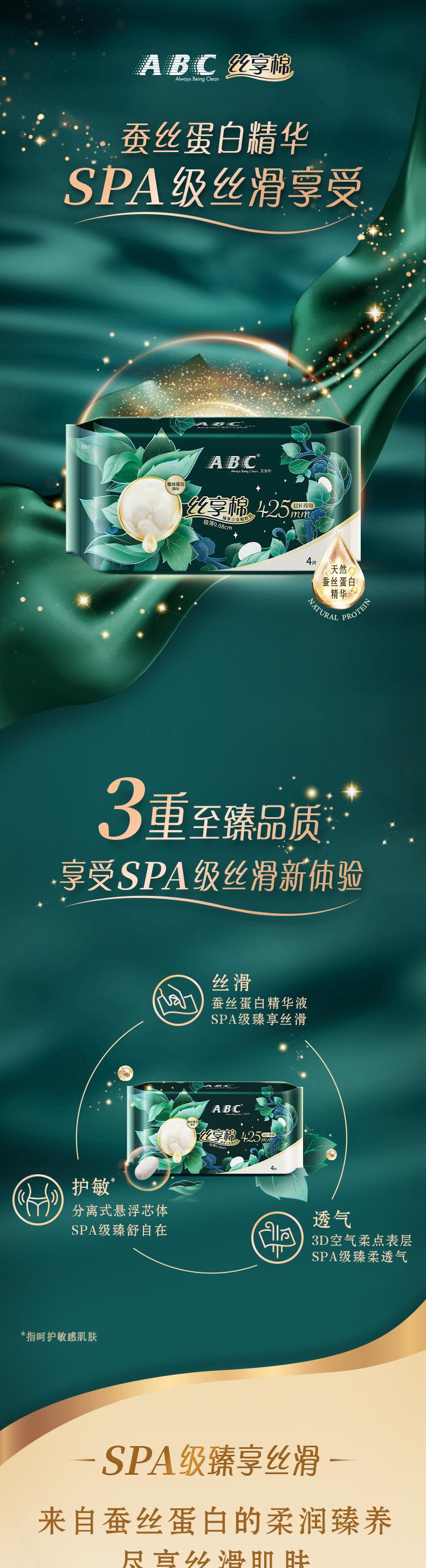 ABC卫生巾425mm*4片丝享棉柔量大夜用超薄女生姨妈透气卫生巾