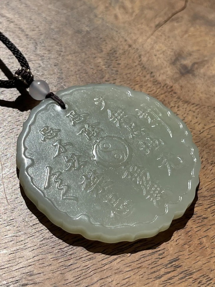 此籽料白玉道教尊者与经文吊坠牌,玉质洁净、细腻温润,减地浮雕精湛高雅,搭配绳结項链,入手即可佩戴,或是可以镶贵金属融入当代珠宝首饰设计,圆牌造型,道教纹饰雕琢精美,典雅大方,搭配时尚服饰气质非凡、不落俗套。此籽料白玉道教尊者与经文吊坠牌保存完好,包浆皮壳细腻温润。