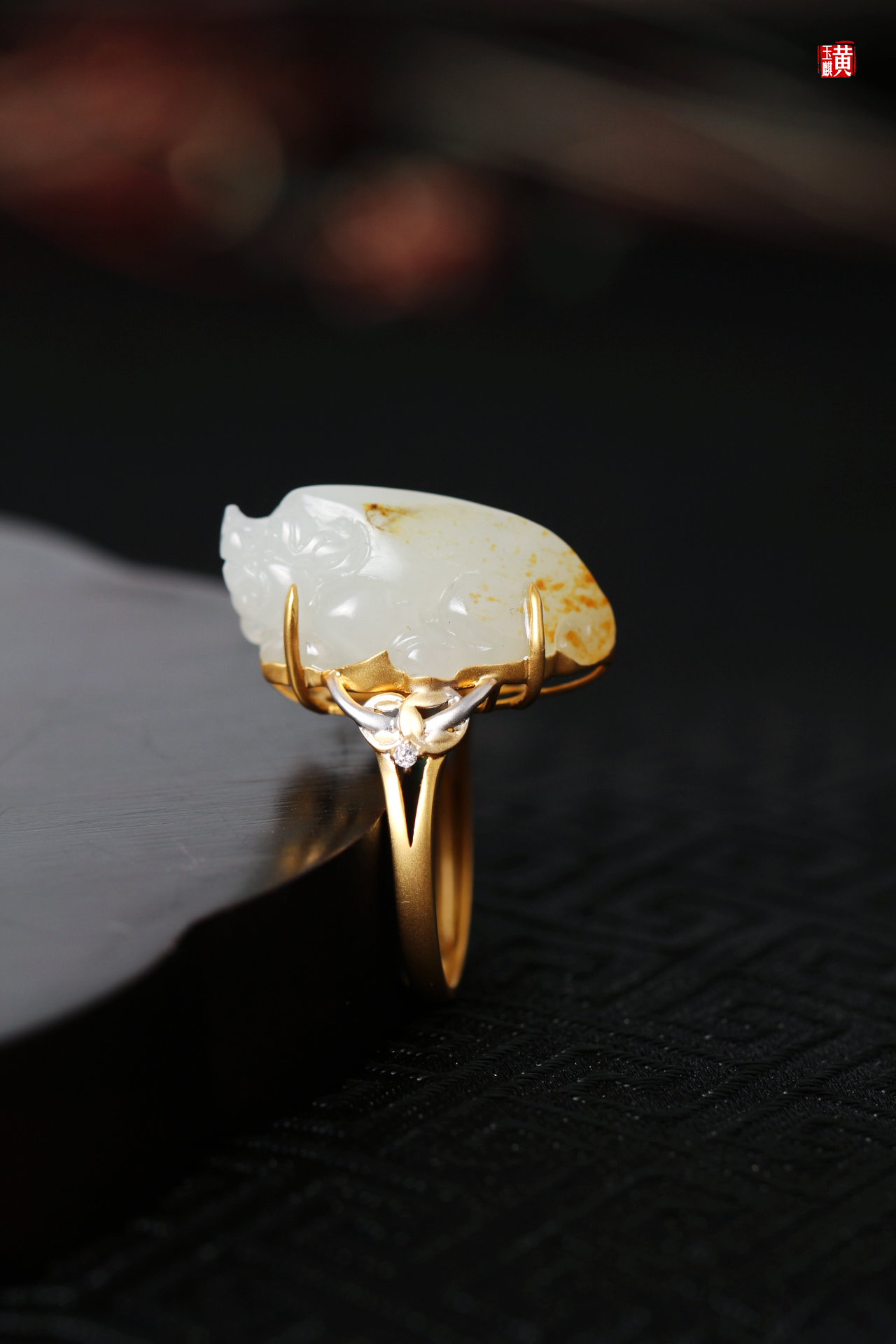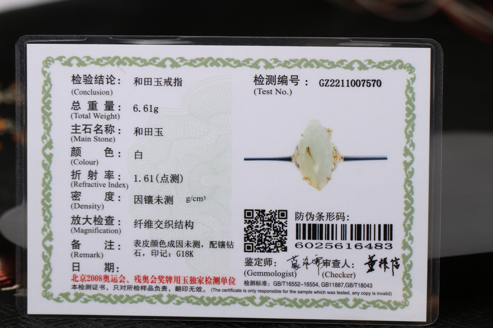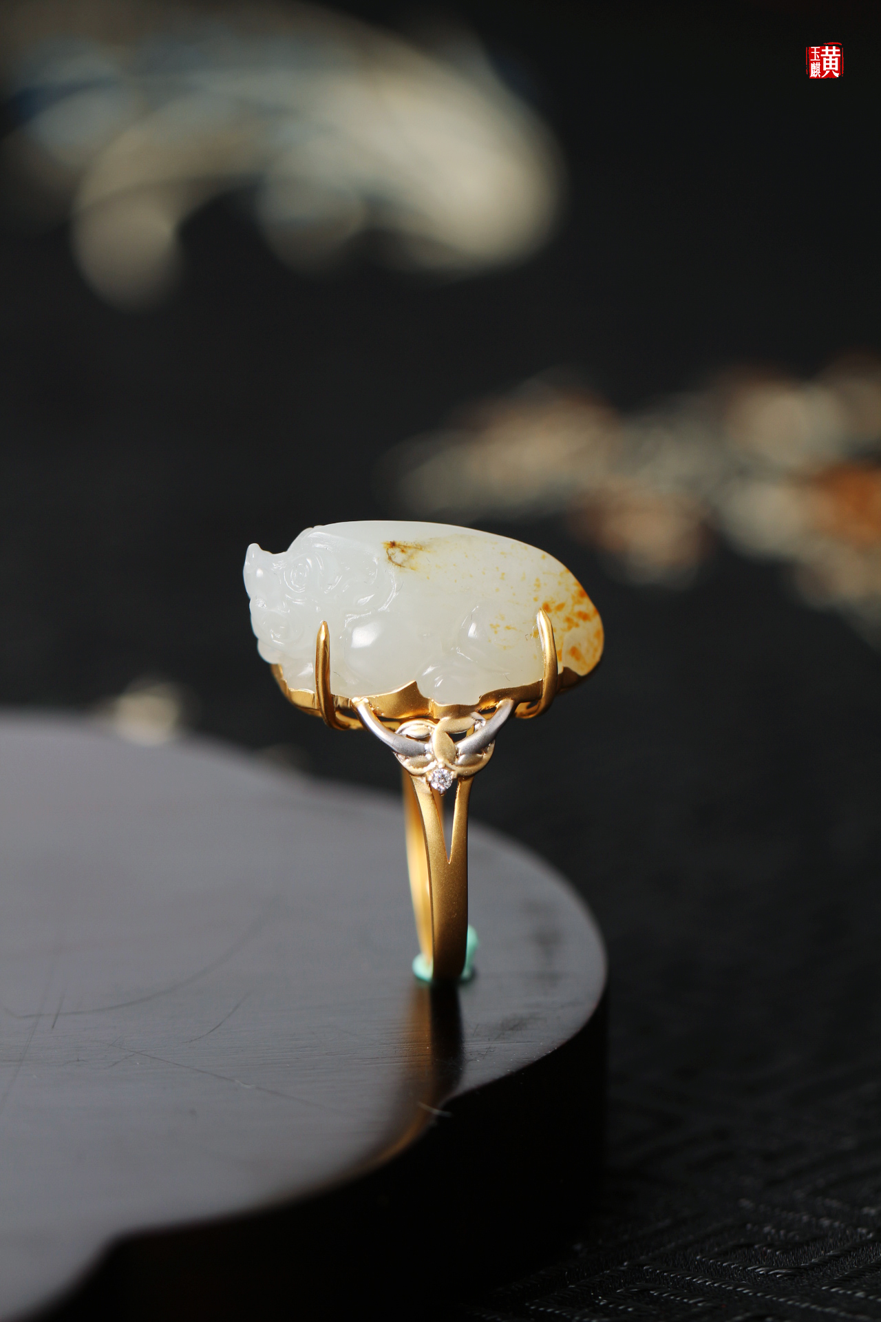 籽料貔貅戒指镶嵌:18K金伴钻赠证书克重:6.61g尺寸:23.6*13*13.4mm戒圈:14.5mm(可改)