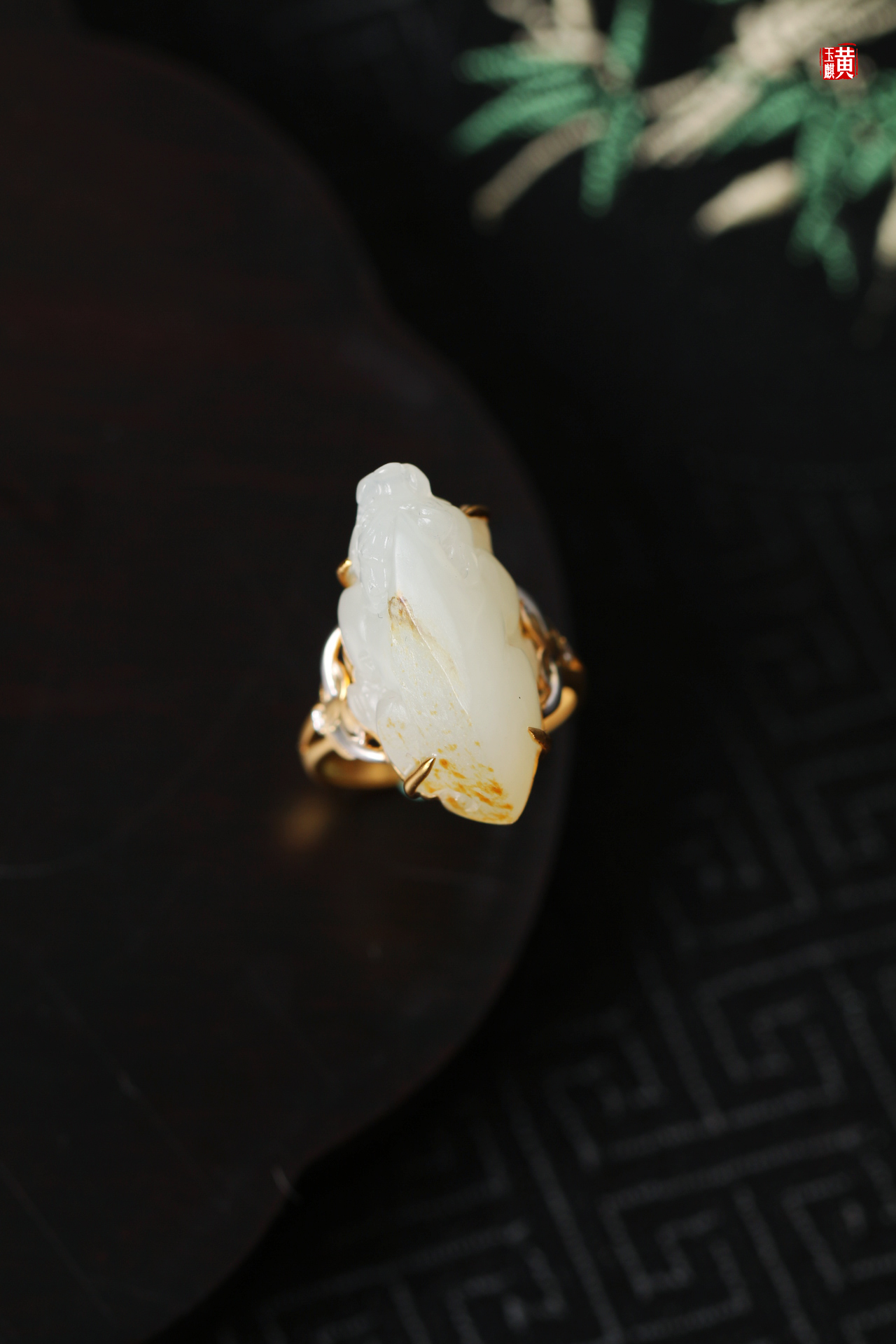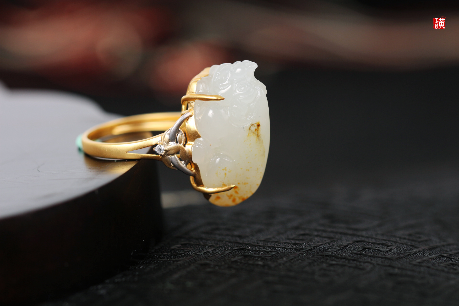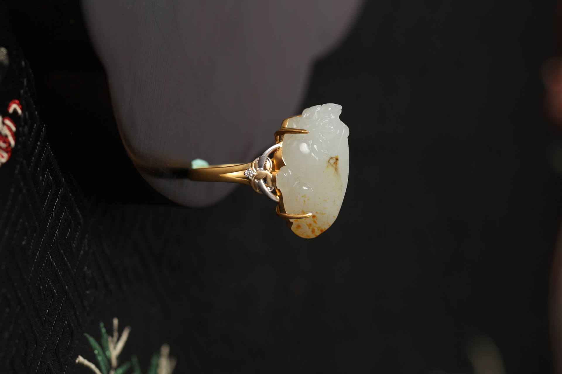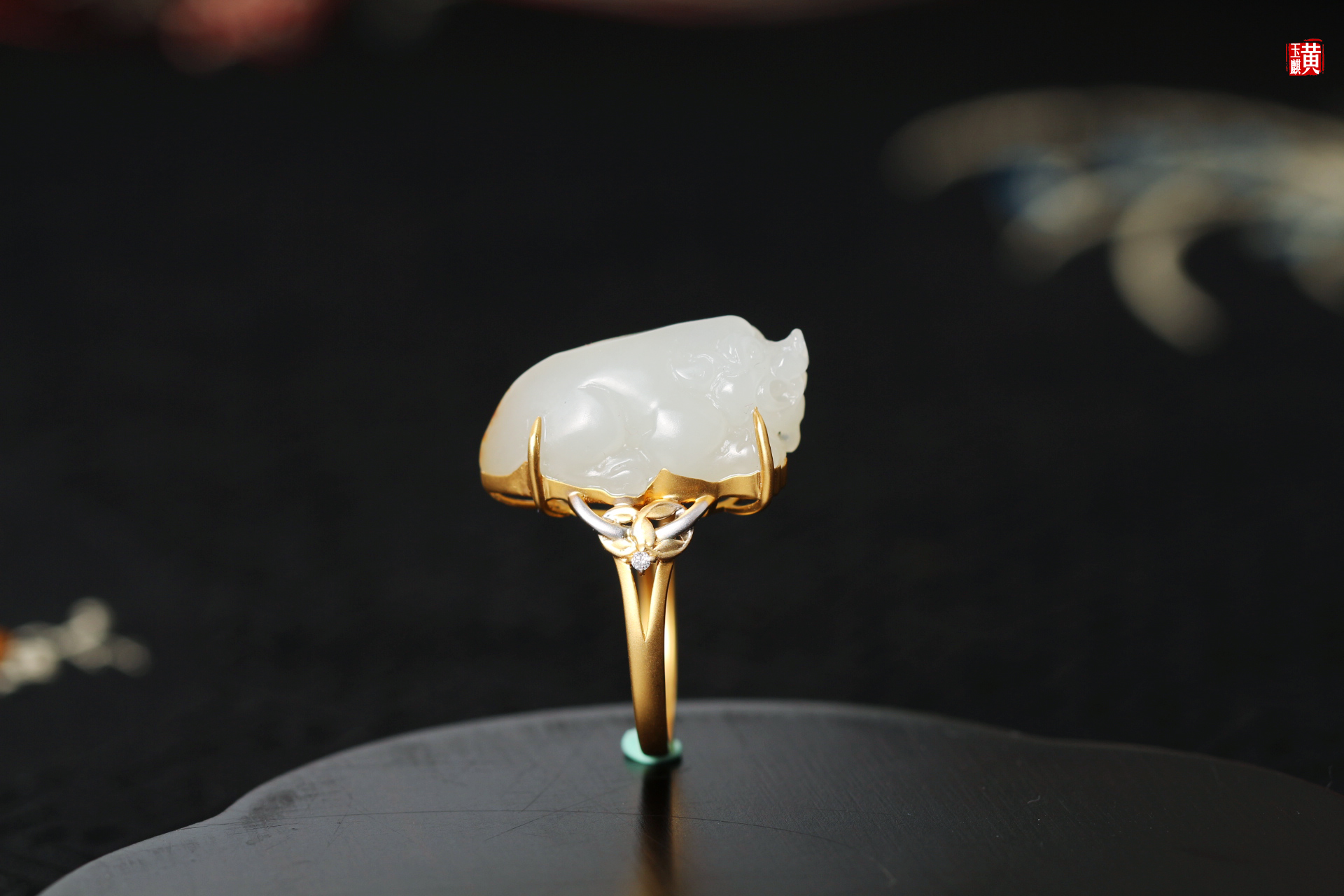 籽料貔貅戒指镶嵌:18K金伴钻赠证书克重:6.61g尺寸:23.6*13*13.4mm戒圈:14.5mm(可改)
