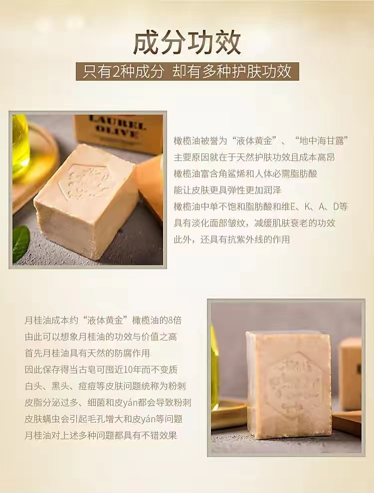 【使用方法】由于古皂风干的时间较长,外表的皮比较硬,所以使用方法比较特殊。初次使用需激活:将古皂在温水浸泡2分钟,是表皮软化,然后清洗一下古皂外表,激活后可以有拉丝的效果,遇水使用后,最好在三年内使用完毕