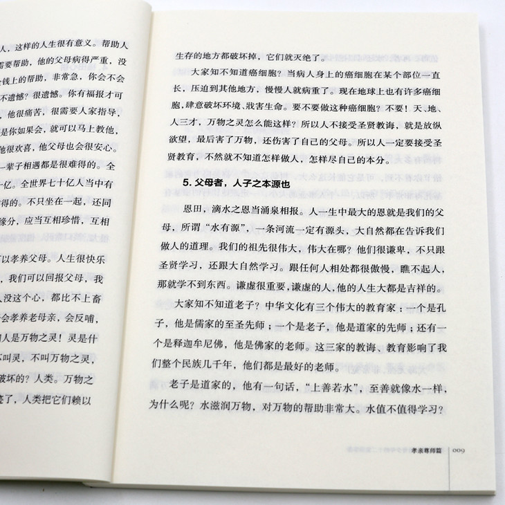 老子是道家的,他有一句话,“上善若水”,至善就像水一样,为什么呢?水滋润万物,对万物的帮助非常大。水值不值得学习?值得。再者,水还可以把污垢洗干净。我们每天有没有把我们的坏习惯不断地洗干净,把它改过来?这都是可以向水学习到的。所以,大家有没有发现,为什么我们的祖先智慧这么高?因为他们时时虚心学习,正如流水都有源头,源远才能流长。