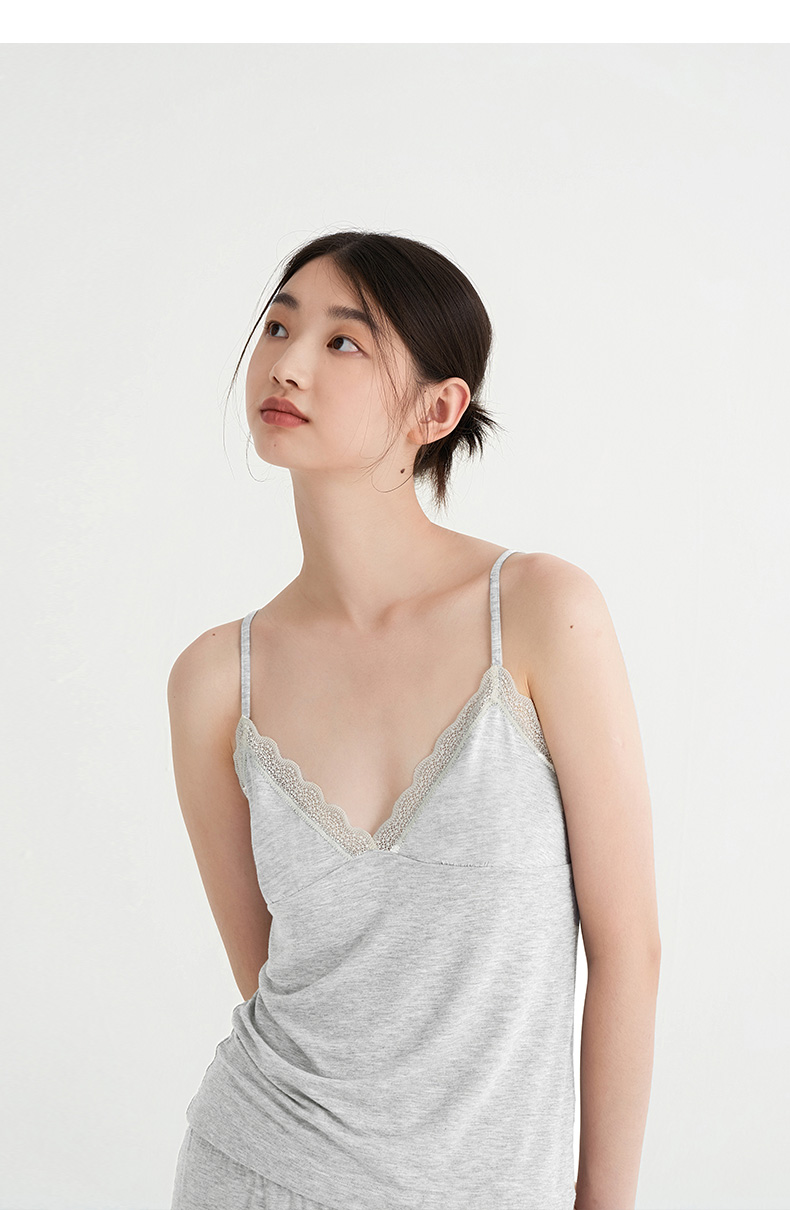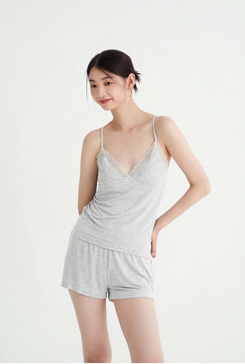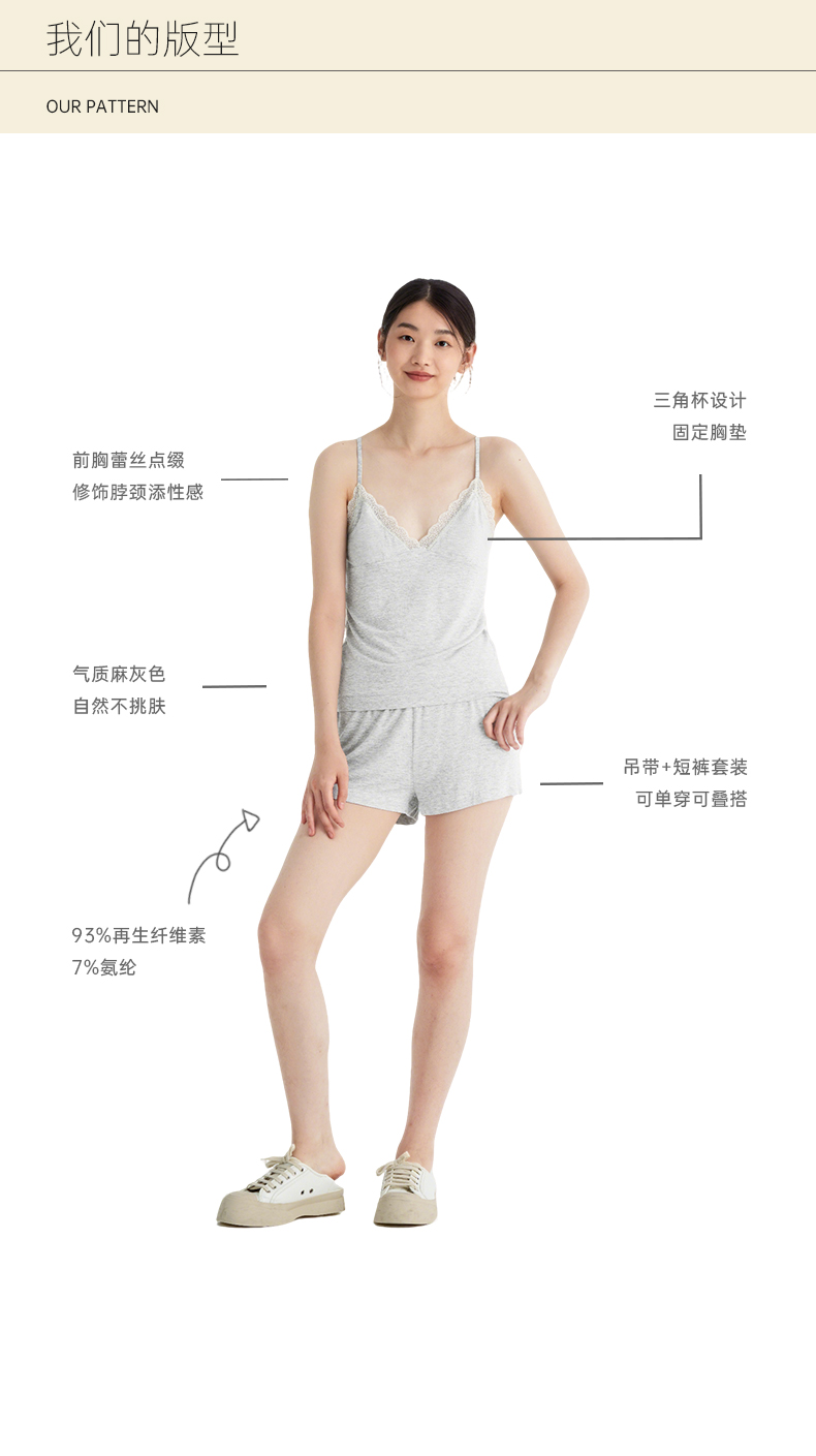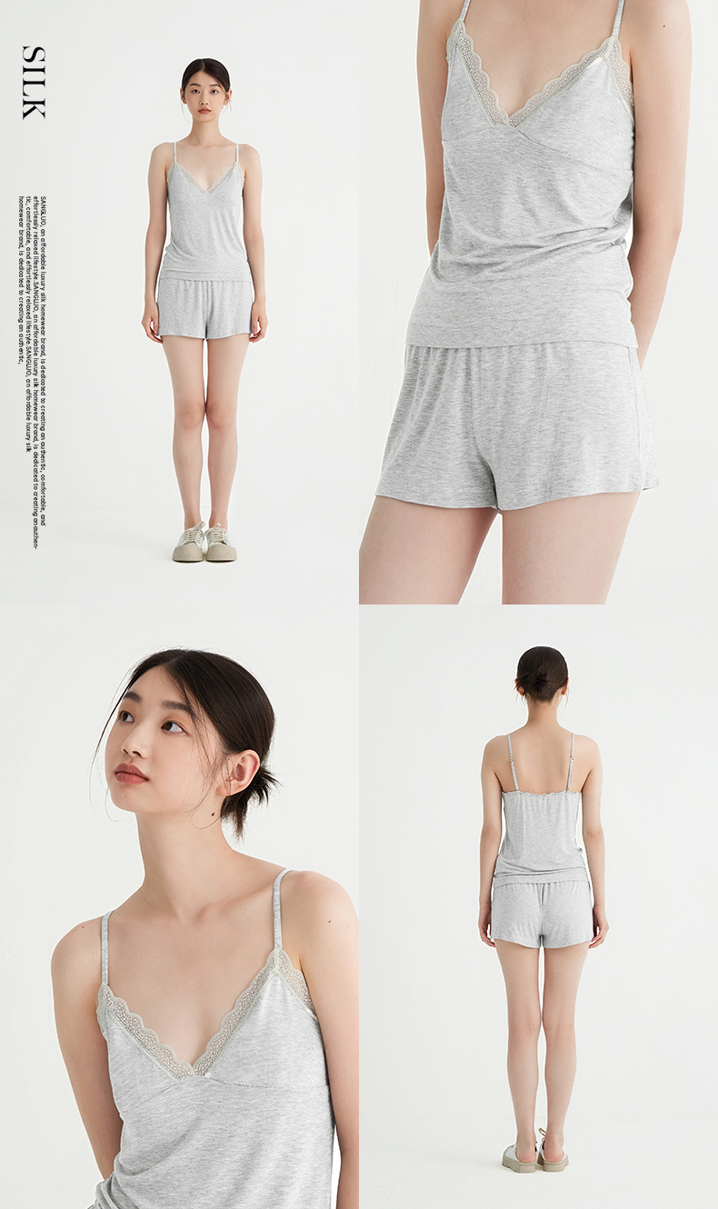 裸感睡眠Bra-in』桑罗纯色蕾丝吊带短裤睡衣套装亲肤透气女家居服