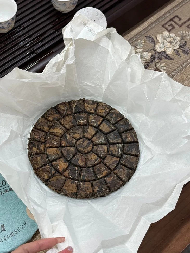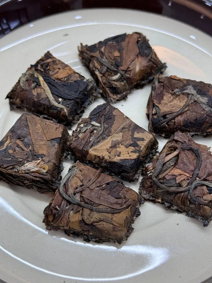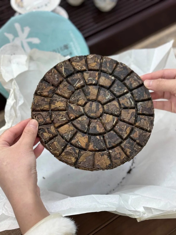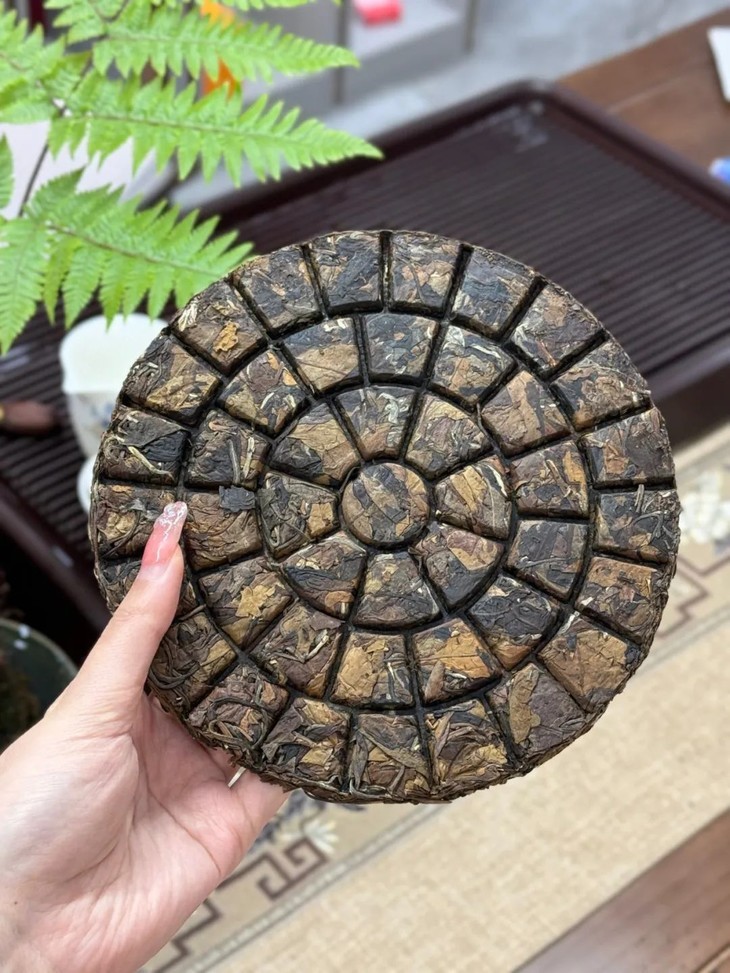 看这饼面!巧克力块般的压制工整:条索紧结如龙鳞,茶针轻撬“咔嚓”脆响——这就是陈化了9年的底气!
